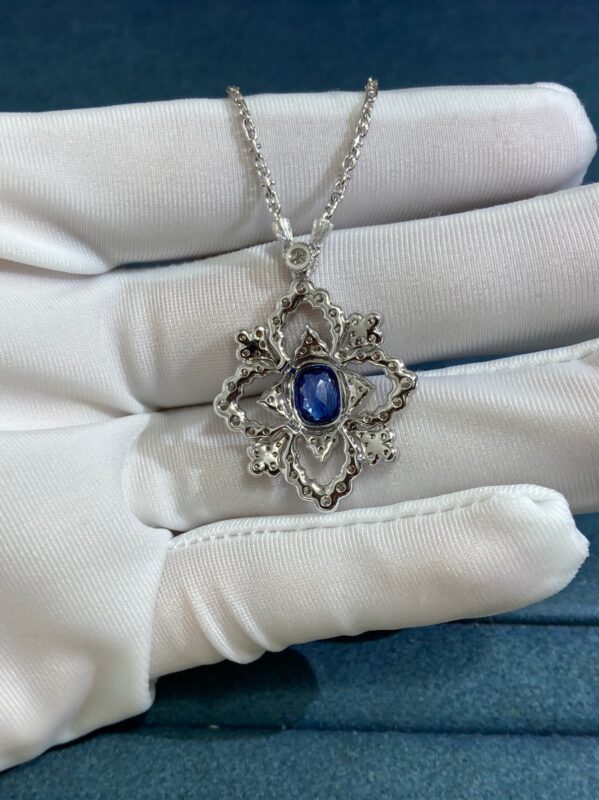 The metal used in pieces of jewelry are often a lustrous yellow or white gold, which is expertly polished to a mirror-like finish. The precious stones are carefully selected by our masters and set in a precise manner, showing off their color, clarity, and brilliance to their full potential.