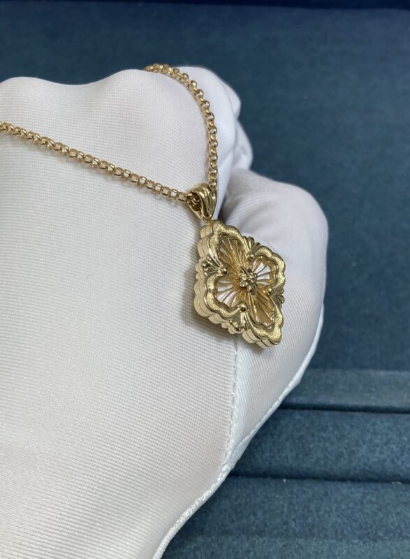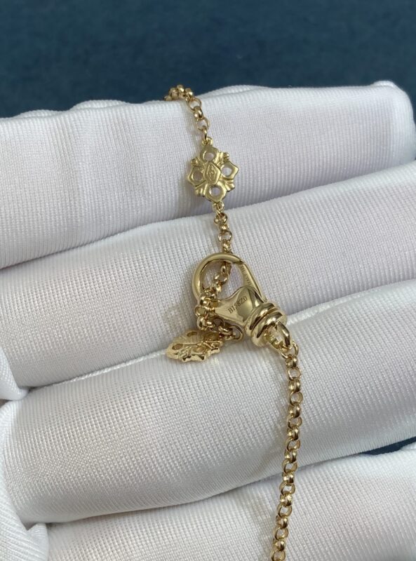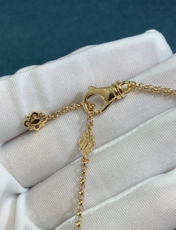 The metal used in pieces of jewelry are often a lustrous yellow or white gold, which is expertly polished to a mirror-like finish. The precious stones are carefully selected by our masters and set in a precise manner, showing off their color, clarity, and brilliance to their full potential.