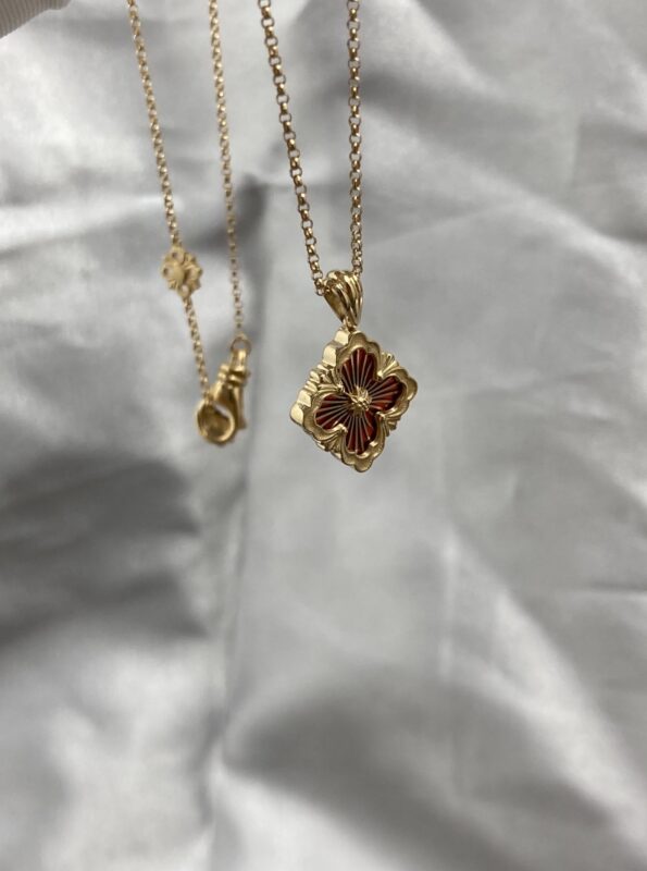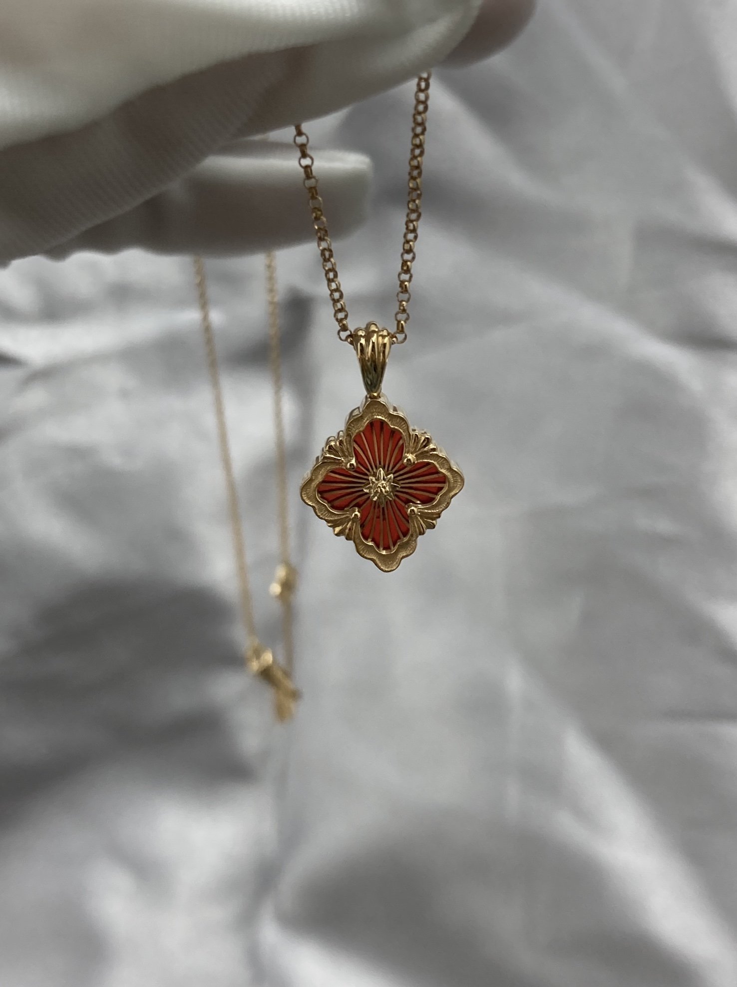 The metal used in pieces of jewelry are often a lustrous yellow or white gold, which is expertly polished to a mirror-like finish. The precious stones are carefully selected by our masters and set in a precise manner, showing off their color, clarity, and brilliance to their full potential.