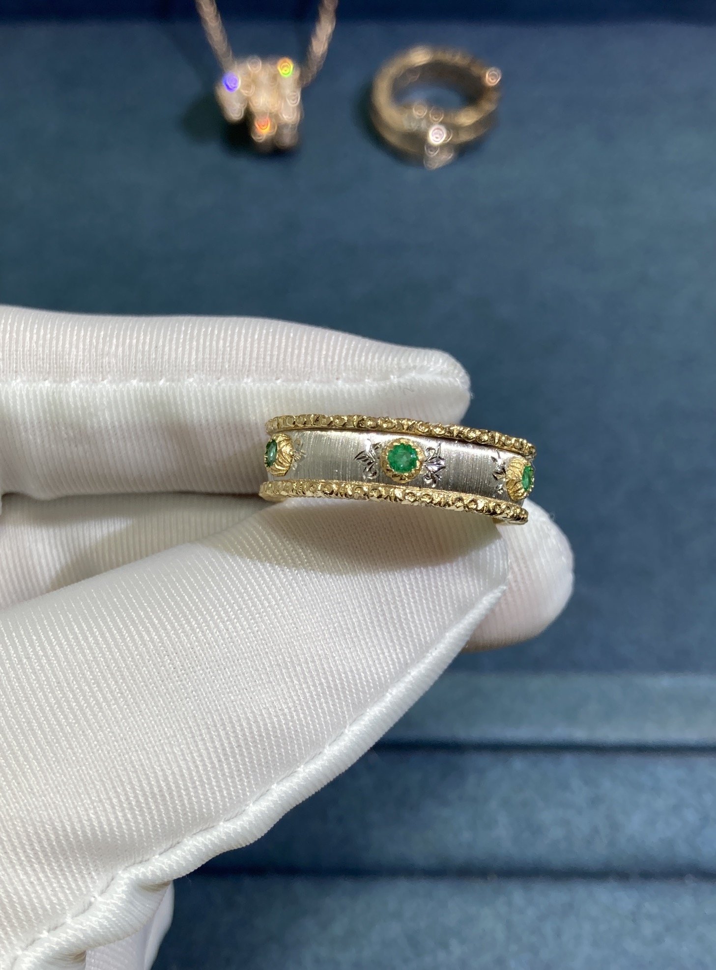 The metal used in pieces of jewelry are often a lustrous yellow or white gold, which is expertly polished to a mirror-like finish. The precious stones are carefully selected by our masters and set in a precise manner, showing off their color, clarity, and brilliance to their full potential.