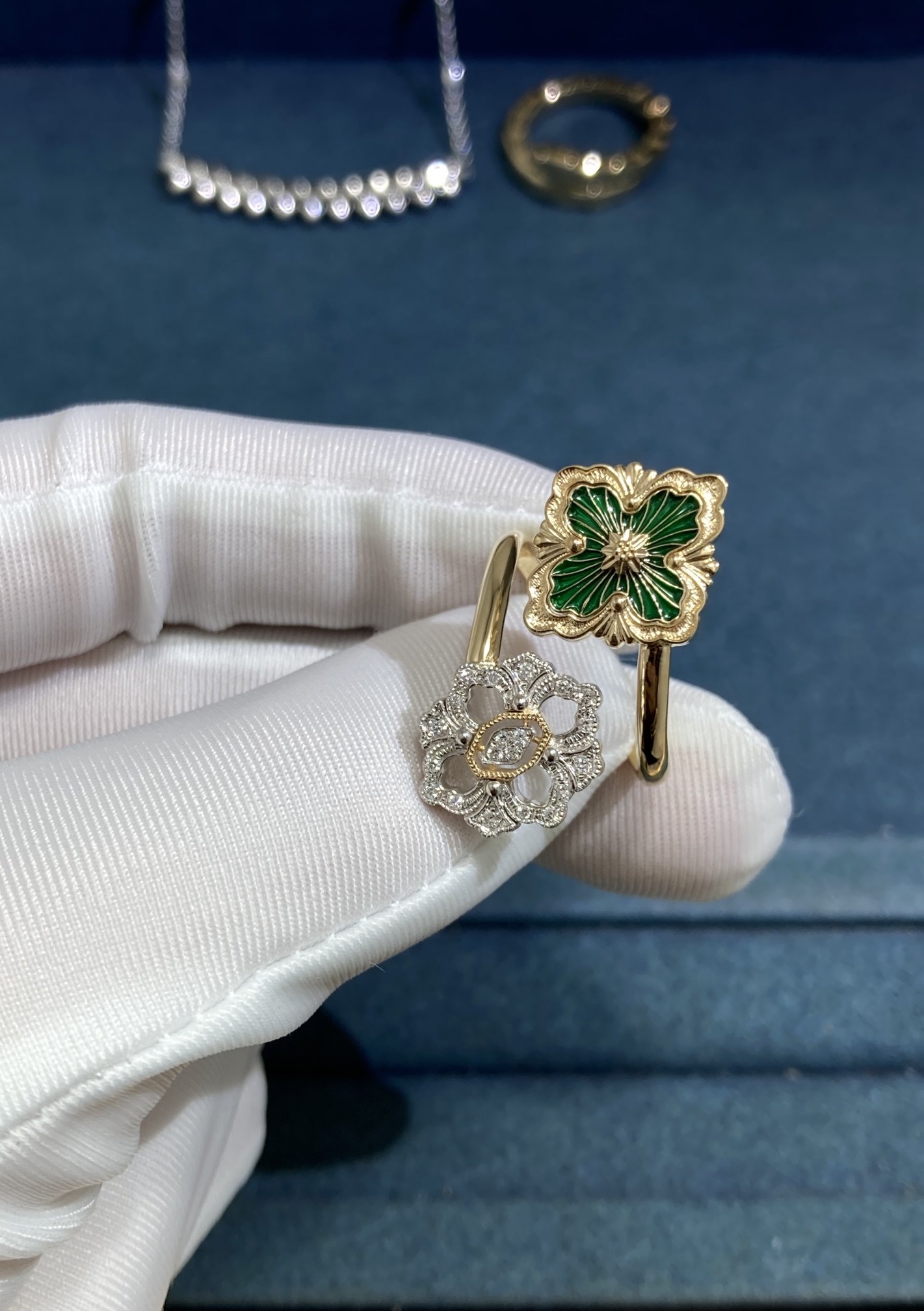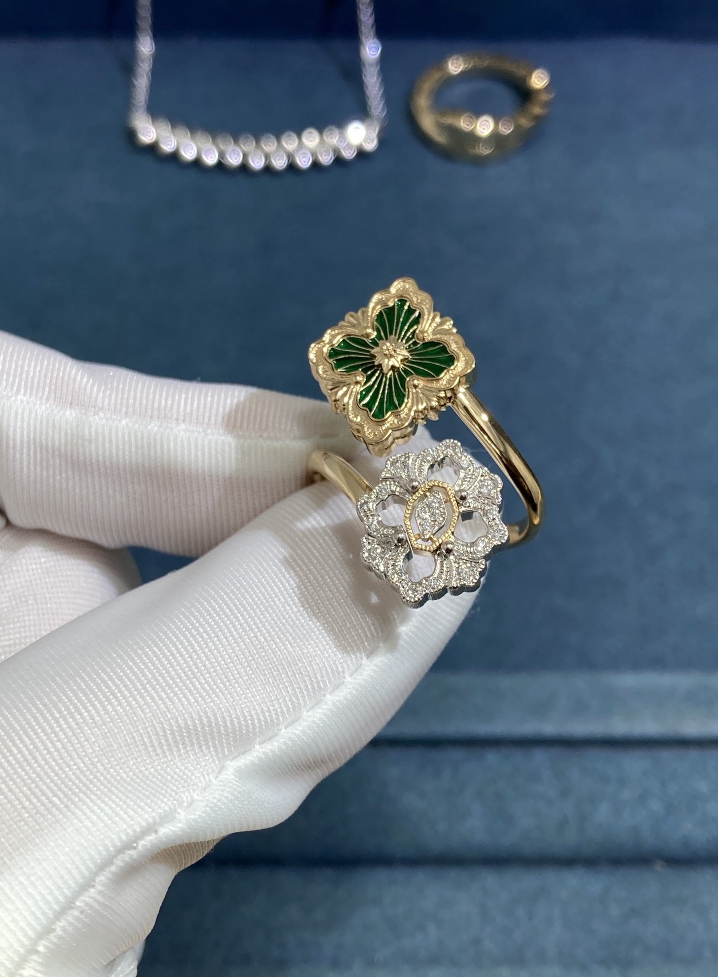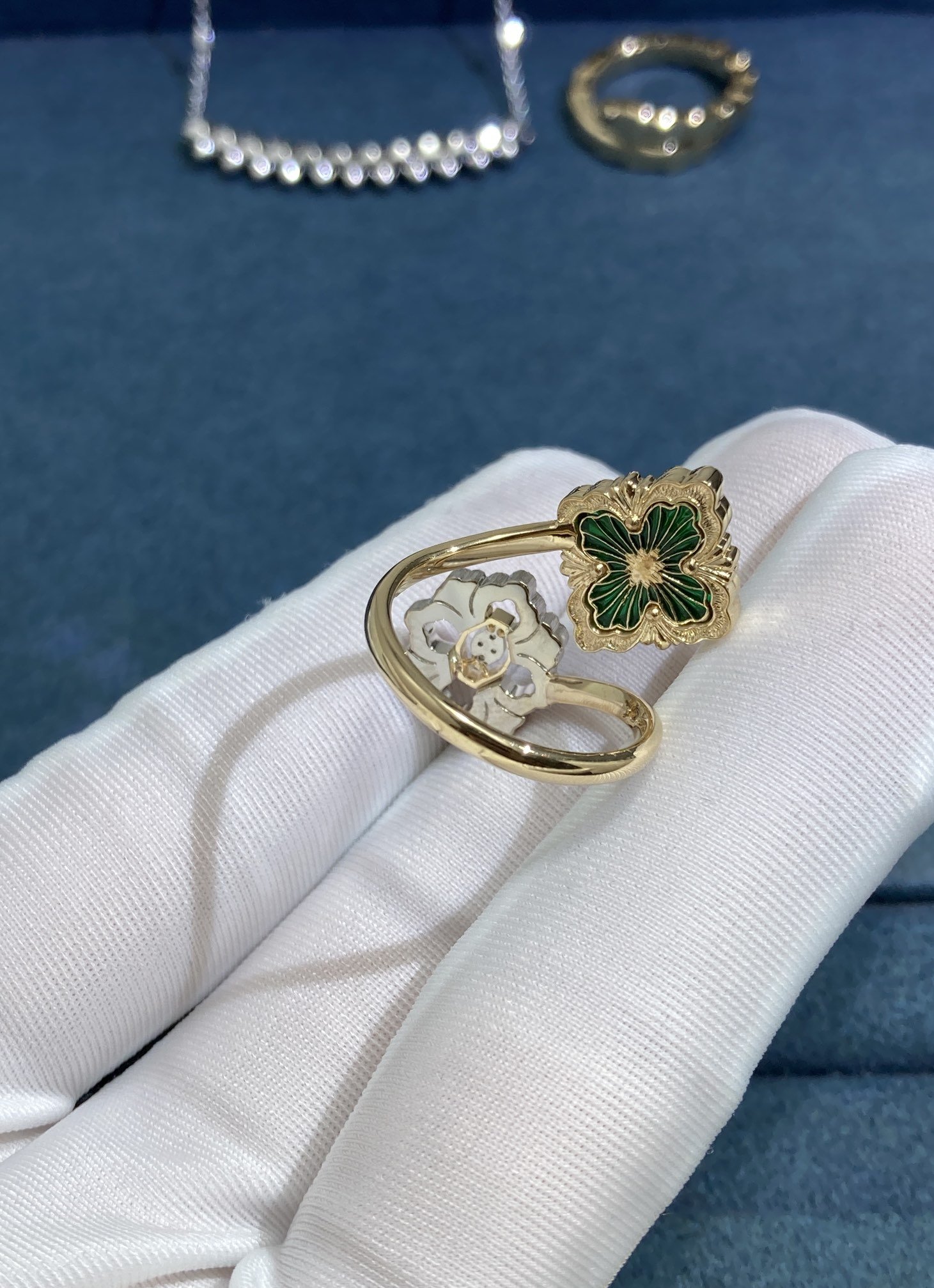 The metal used in pieces of jewelry are often a lustrous yellow or white gold, which is expertly polished to a mirror-like finish. The precious stones are carefully selected by our masters and set in a precise manner, showing off their color, clarity, and brilliance to their full potential.