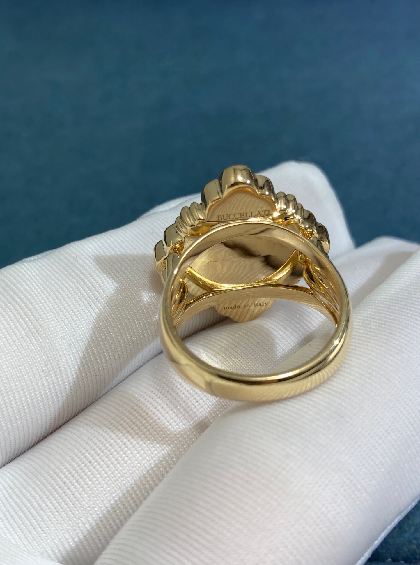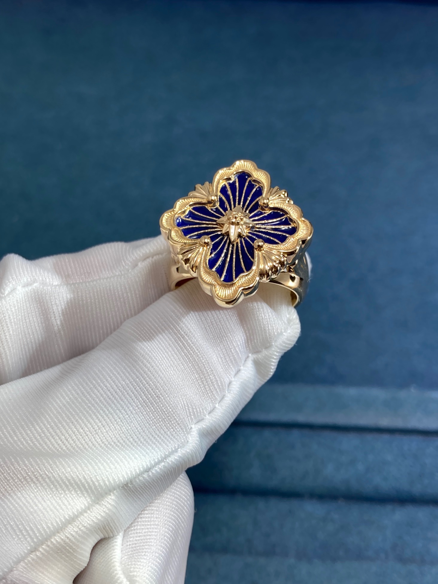 The metal used in pieces of jewelry are often a lustrous yellow or white gold, which is expertly polished to a mirror-like finish. The precious stones are carefully selected by our masters and set in a precise manner, showing off their color, clarity, and brilliance to their full potential.
