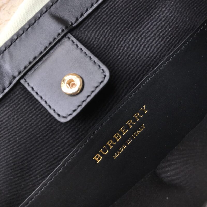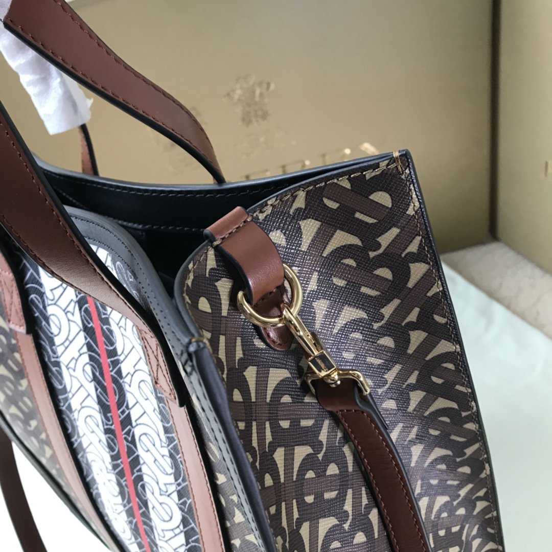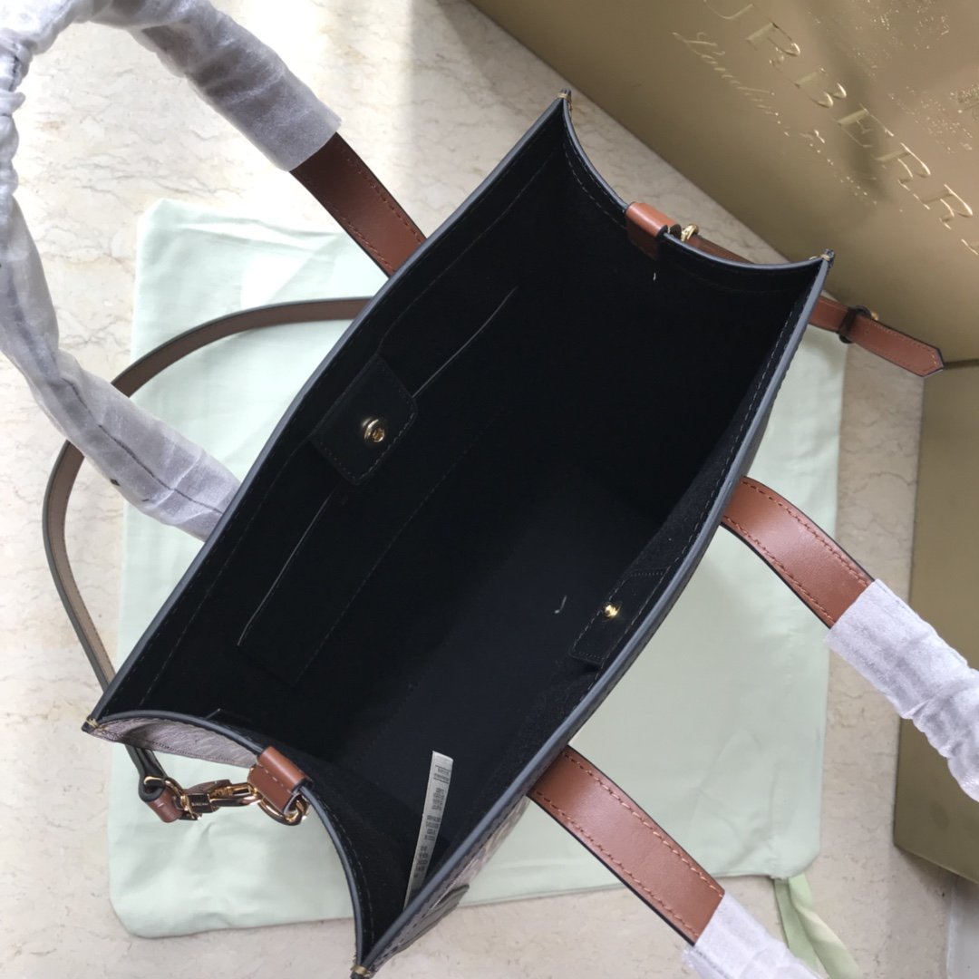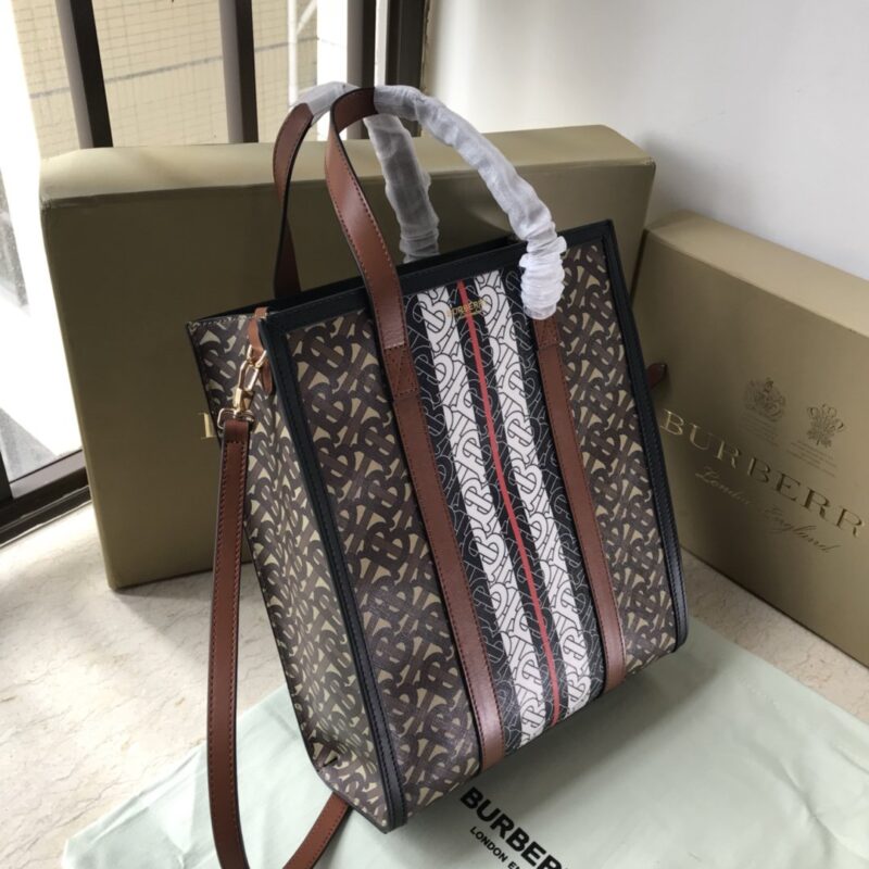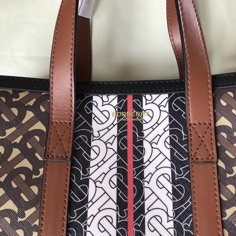 The original B’s small tote bag is made of the brand’s environmentally friendly canvas. Manufactured primarily from renewable resources, the eco-friendly canvas requires less water and generates less carbon dioxide than traditional coated canvas. Bag with printed monogram and measures 32x 8x 26 cm Exterior: Eco-canvas top leather handle. 1 interior slip pocket. Snap closure. Hand-painted painted edges. Embossed Burberry lettering on front