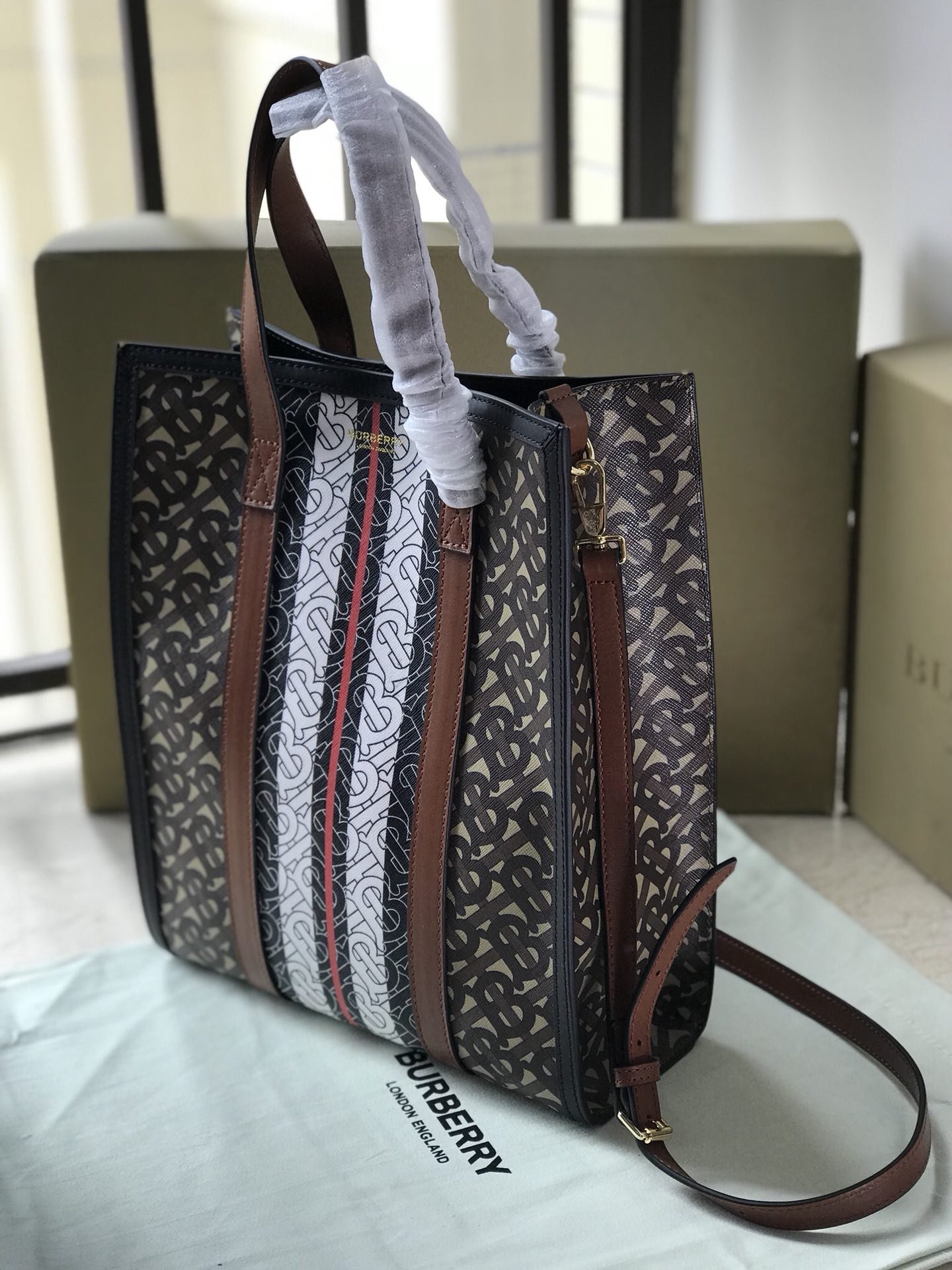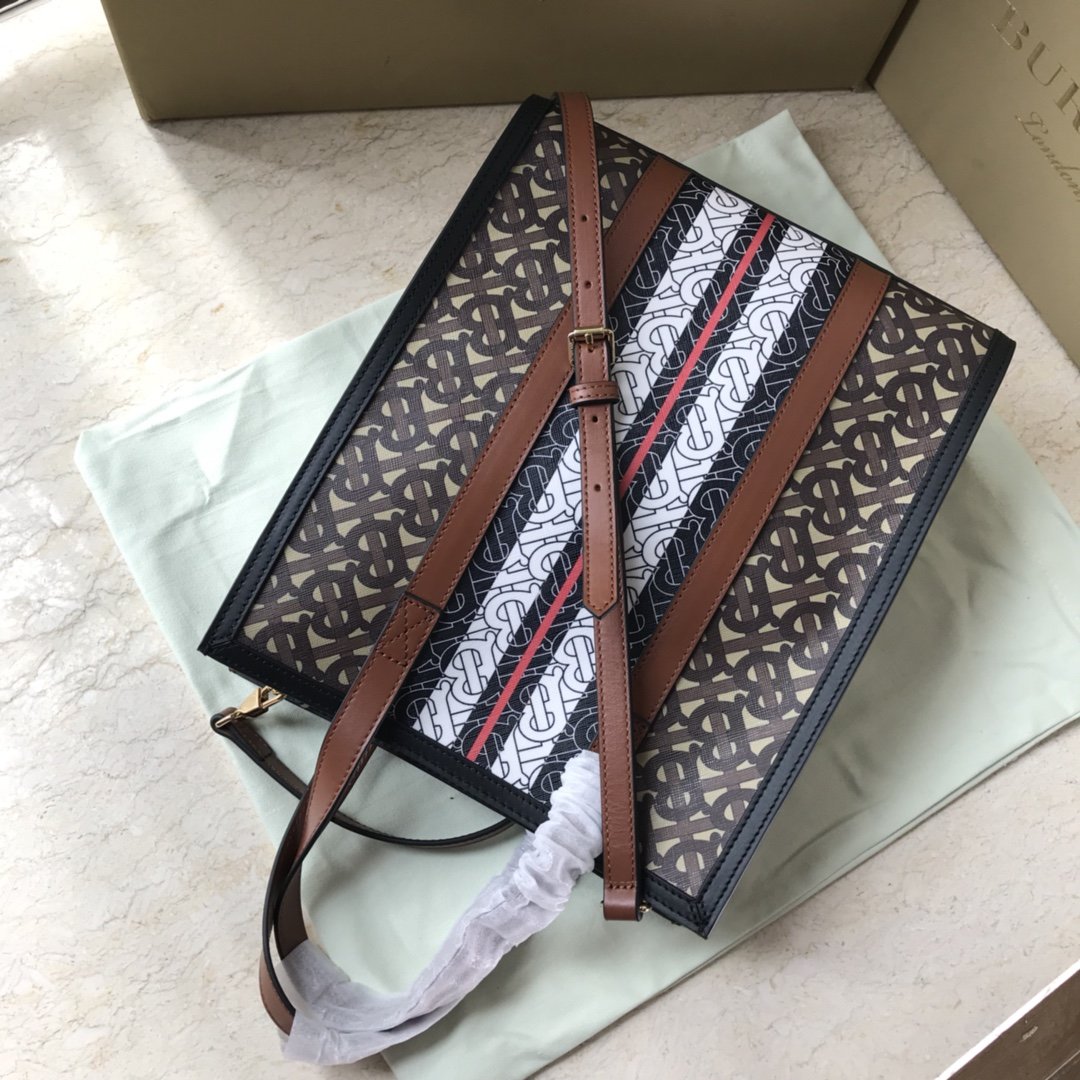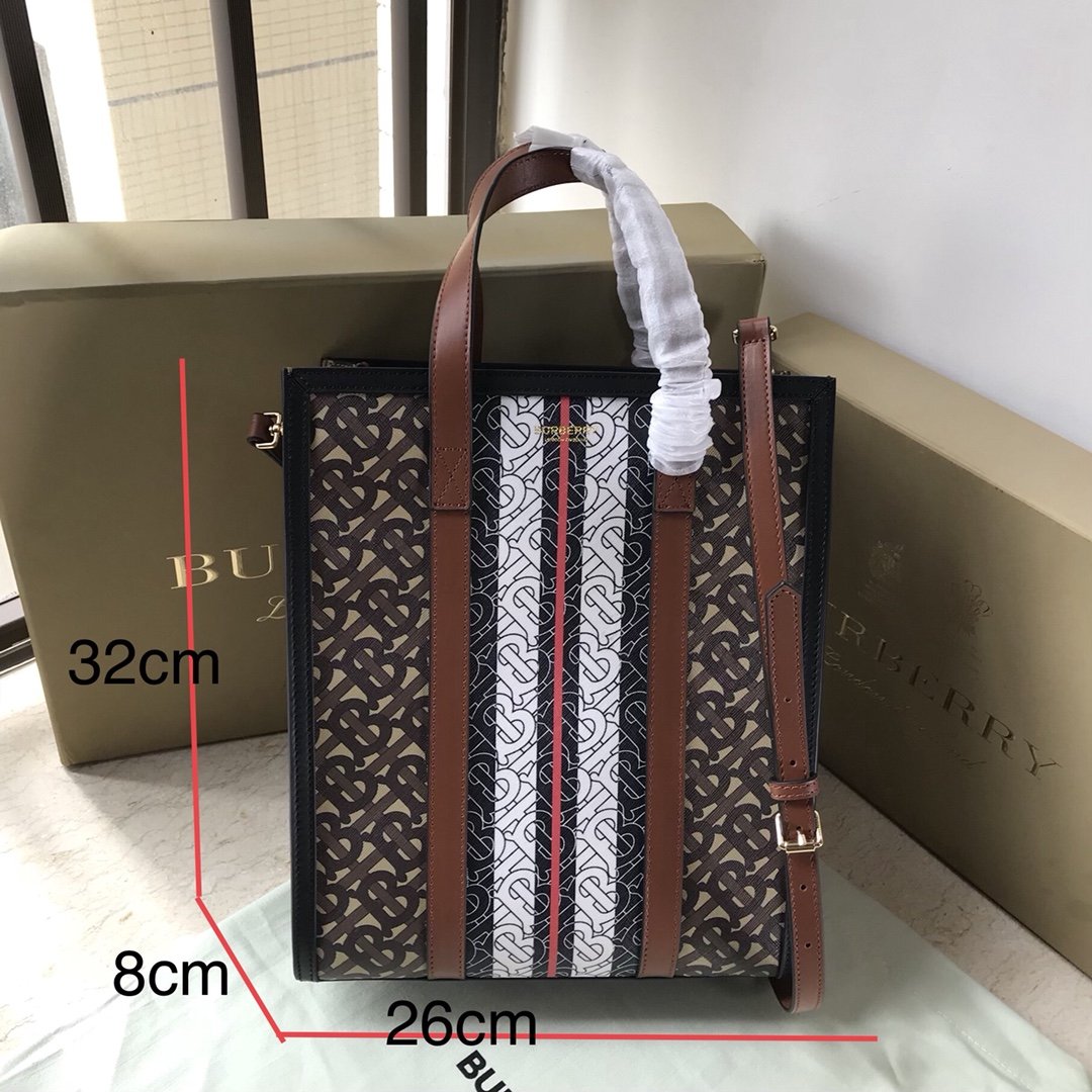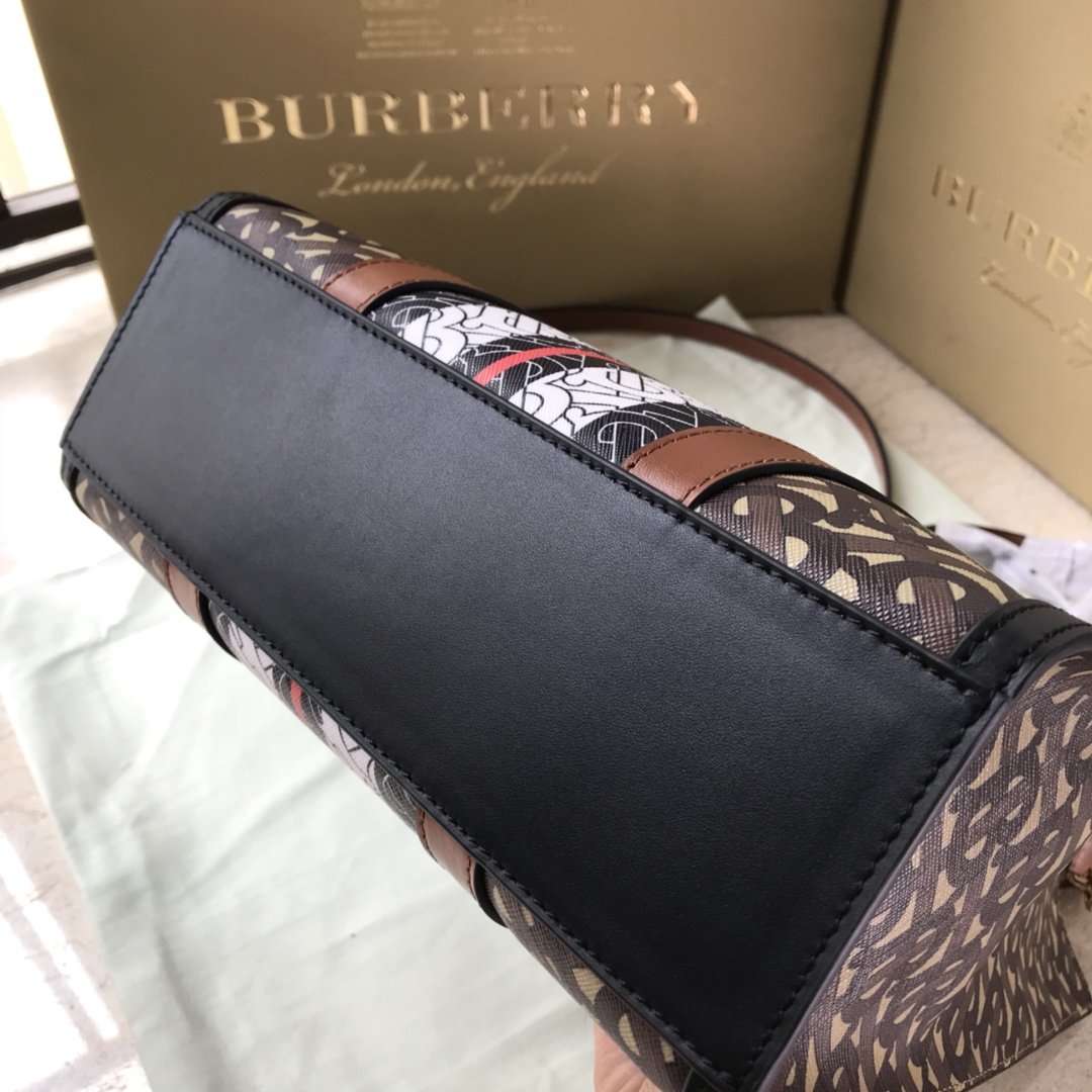The original B’s small tote bag is made of the brand’s environmentally friendly canvas. Manufactured primarily from renewable resources, the eco-friendly canvas requires less water and generates less carbon dioxide than traditional coated canvas. Bag with printed monogram and measures 32x 8x 26 cm Exterior: Eco-canvas top leather handle. 1 interior slip pocket. Snap closure. Hand-painted painted edges. Embossed Burberry lettering on front