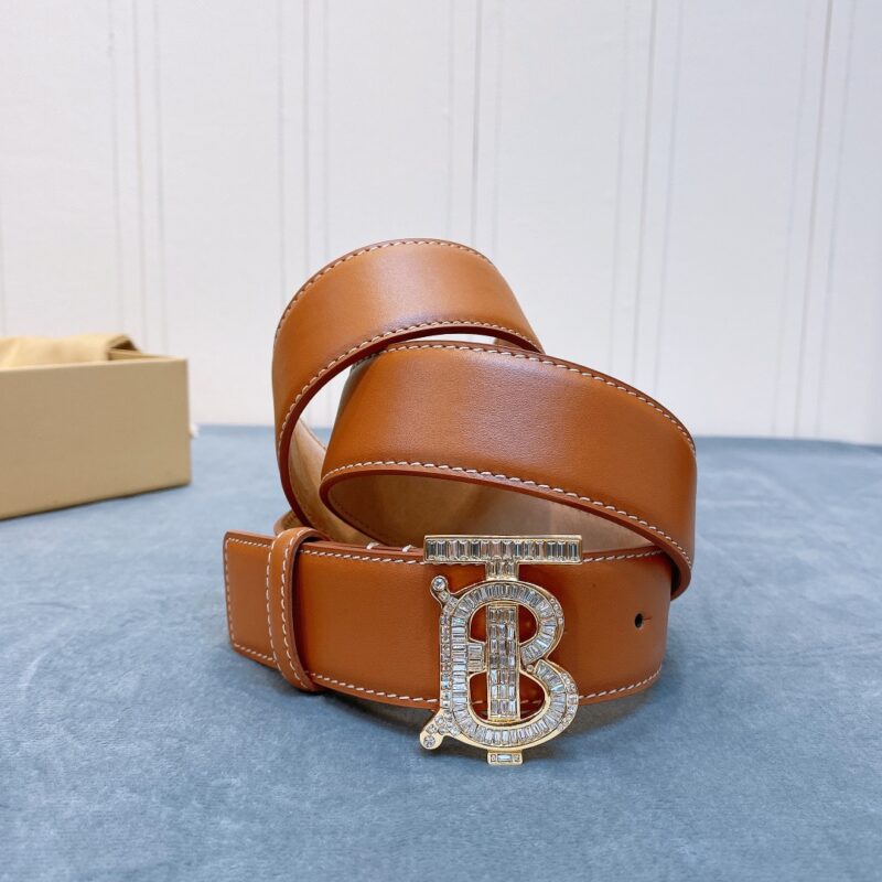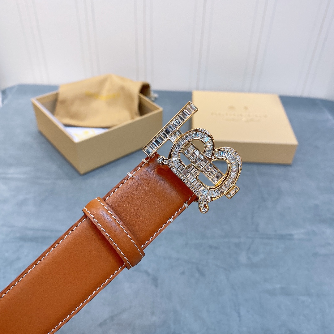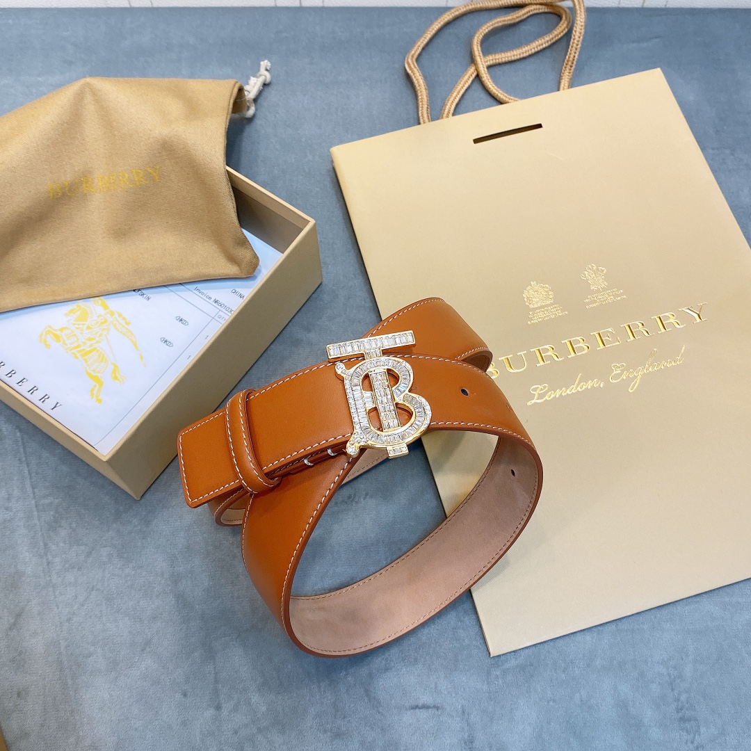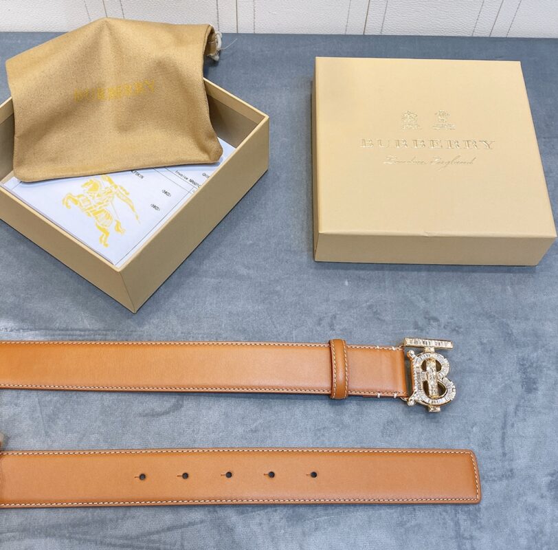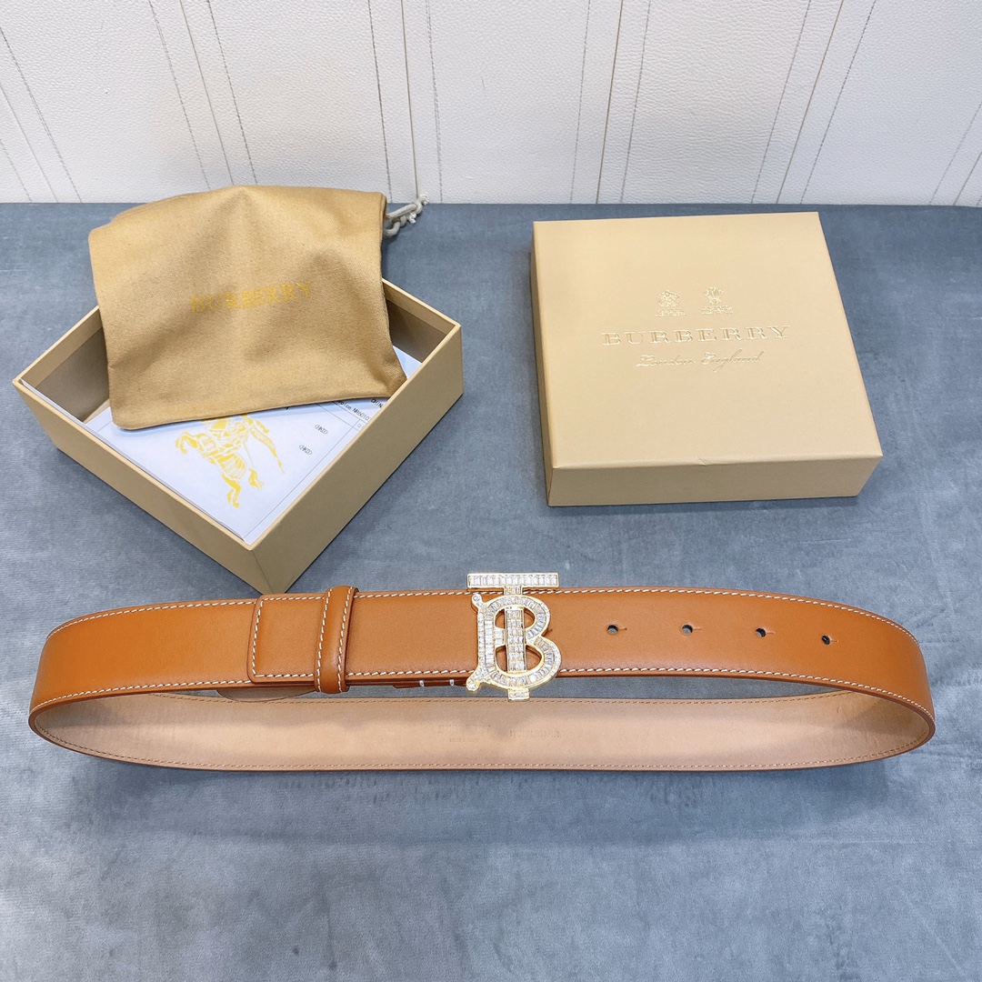 Burberry leather belt made in Italy. Eye-catching gold plated on buckle. Rhinestone monogram. 3.4cm wide. 26089883