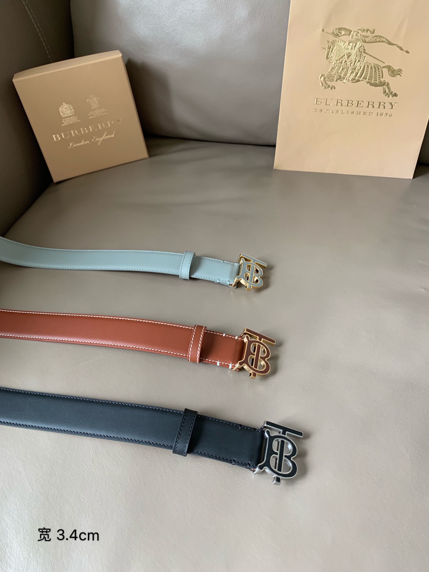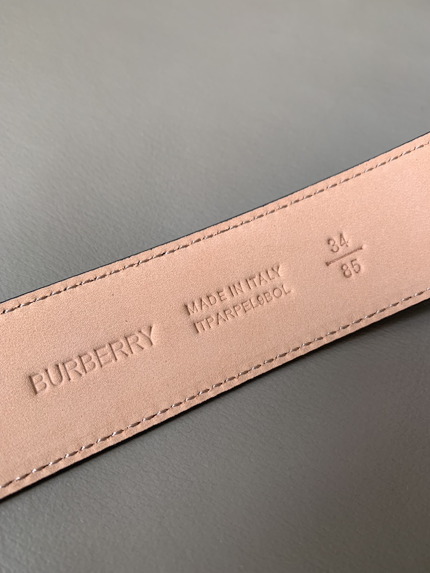 Burberry counter new high-end fashion casual belt. Width :3.4cm. Made of top layer original calfskin lined with tree cream nubuck leather, beautifully decorated with topstitching; exclusive logo pattern plaque buckle embellished with hand-inlaid leather details. Noble and elegant, simple and versatile, top workmanship. 26089613