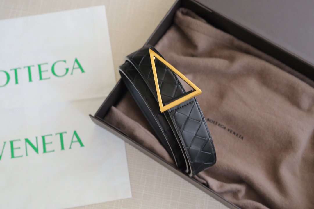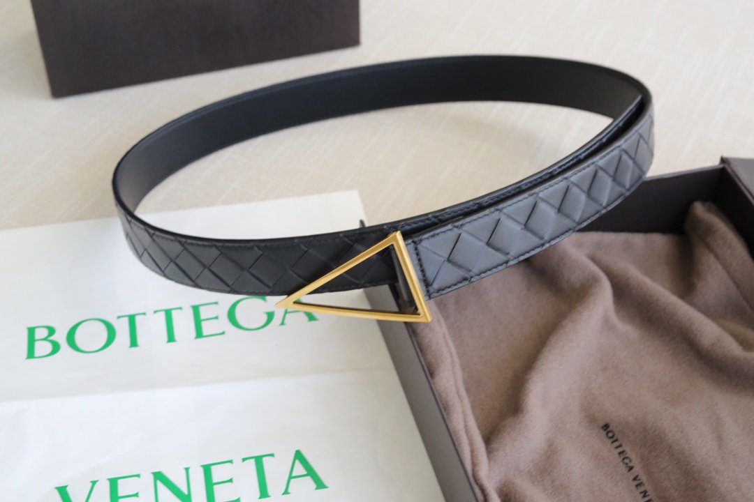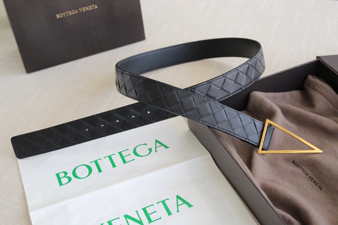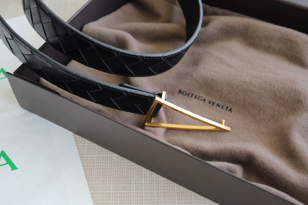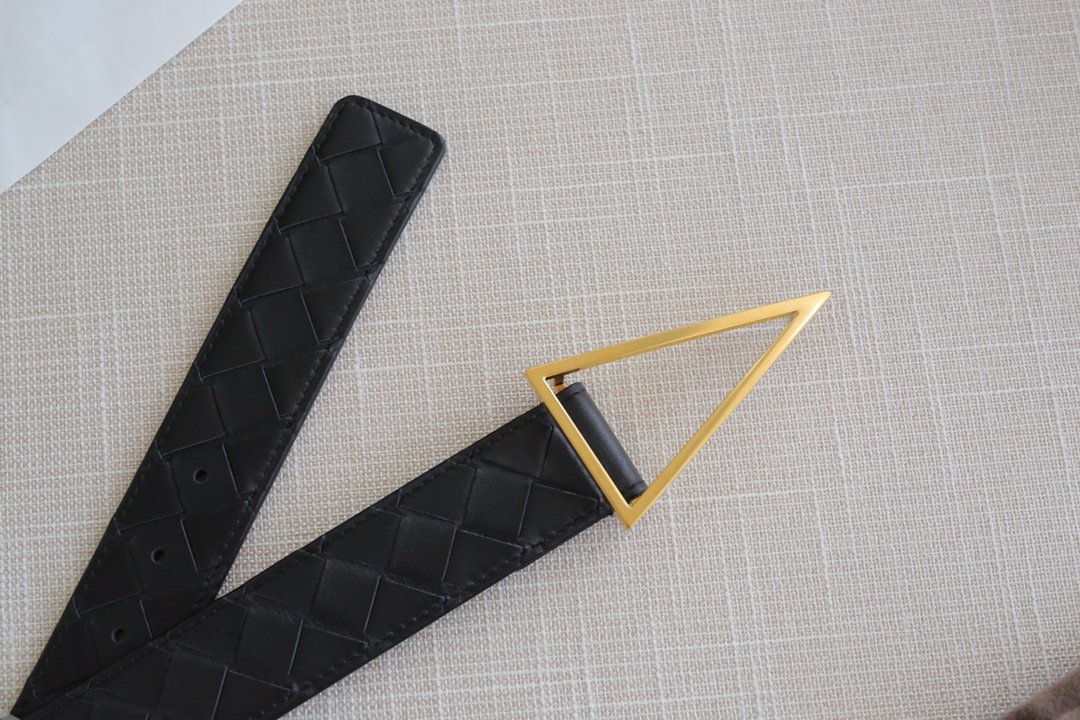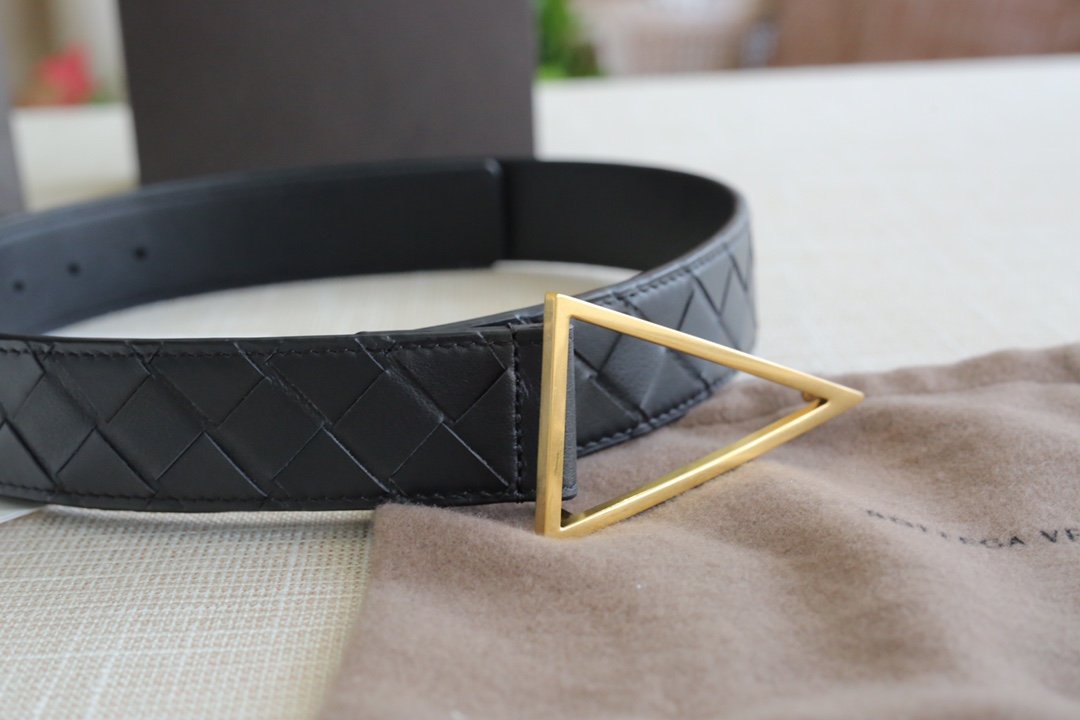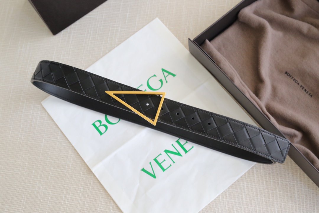 Bv new men’s simple style business casual belt Italian matte calfskin intreccio oversized woven surface with calfskin bottom The overall feel is very good and the toughness is super strong With retro gold triangular copper buckle The belt width is 3.5CM Color: black