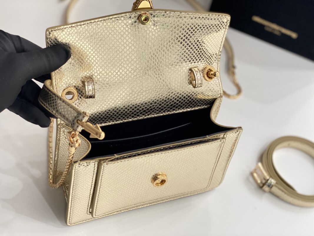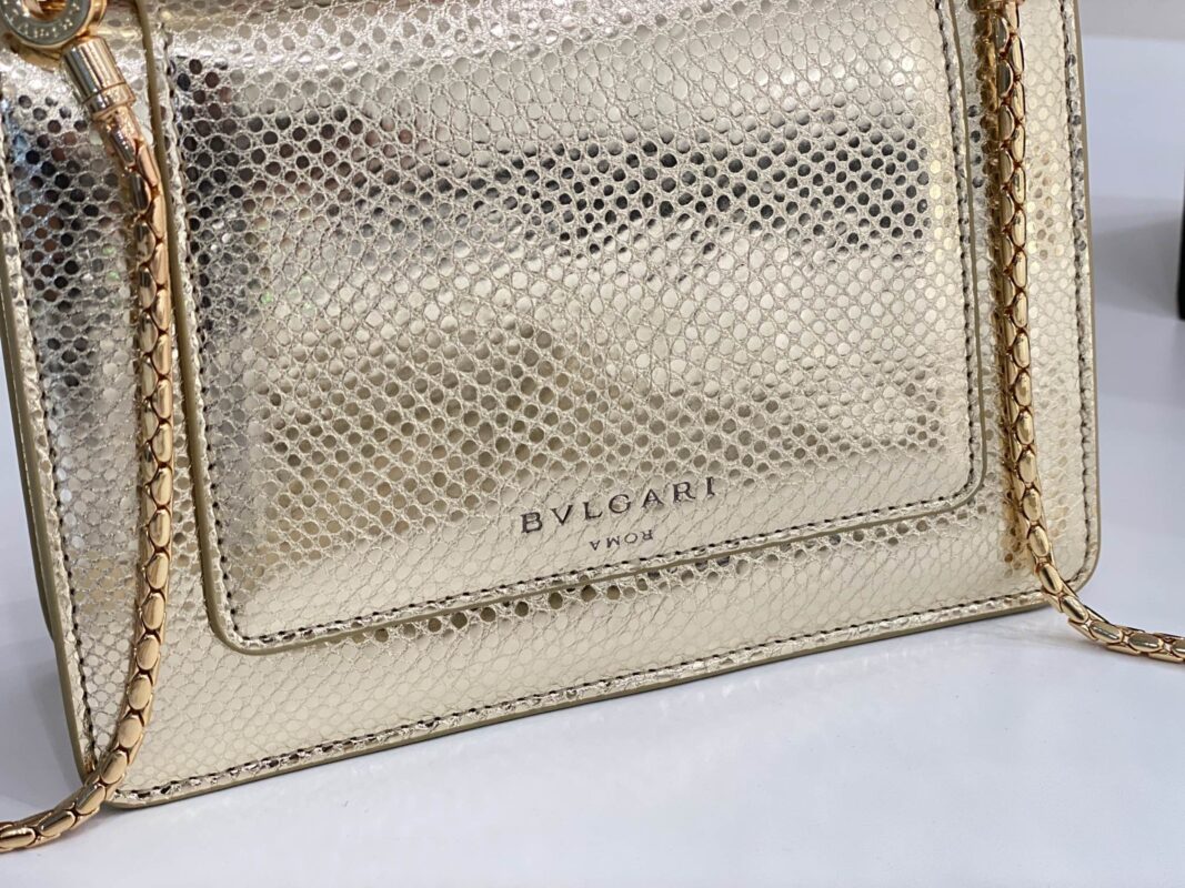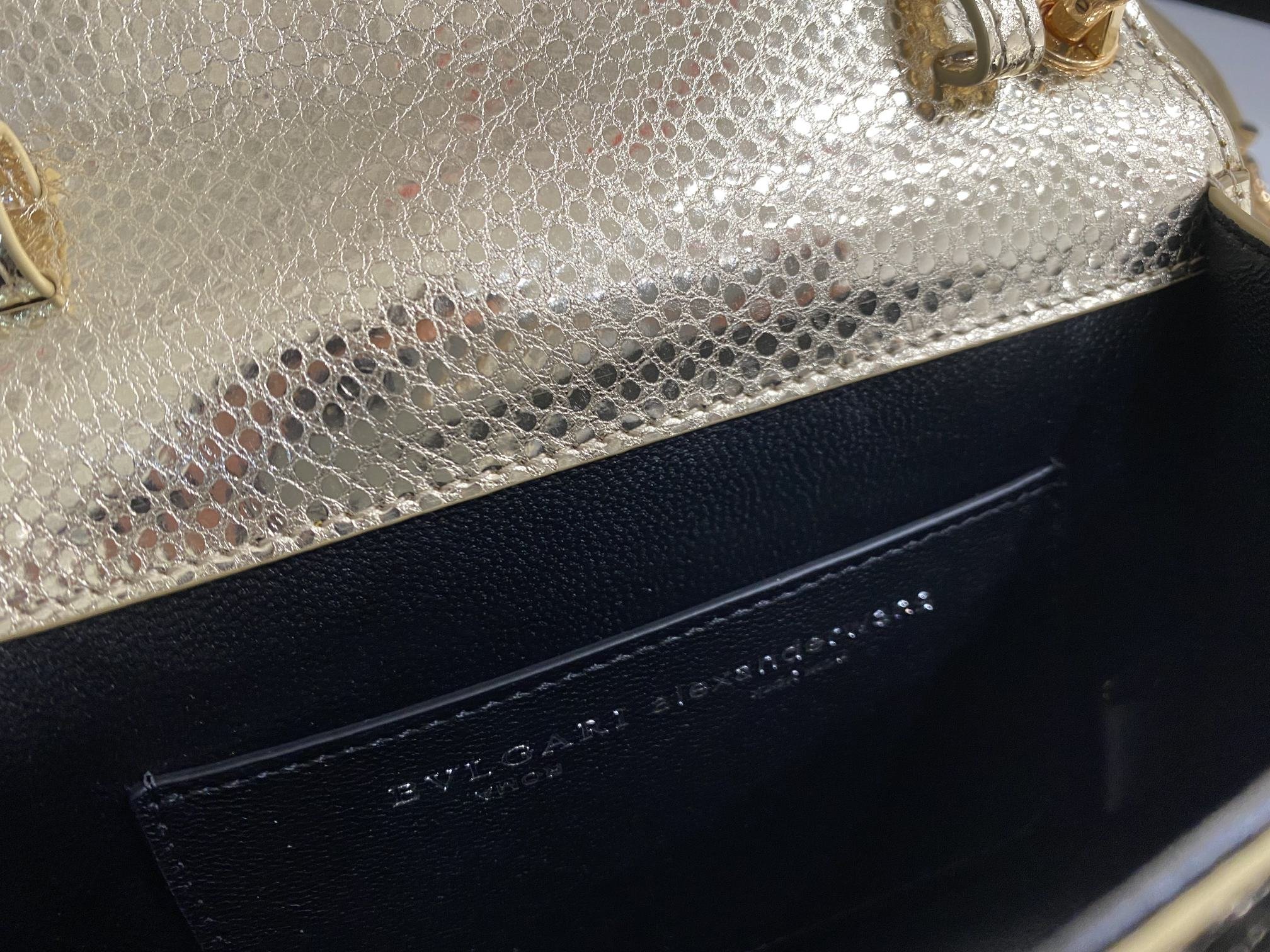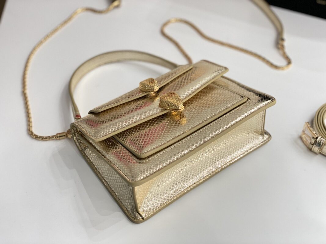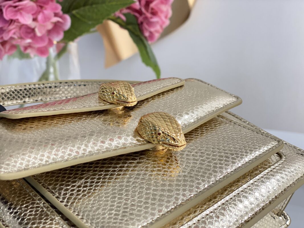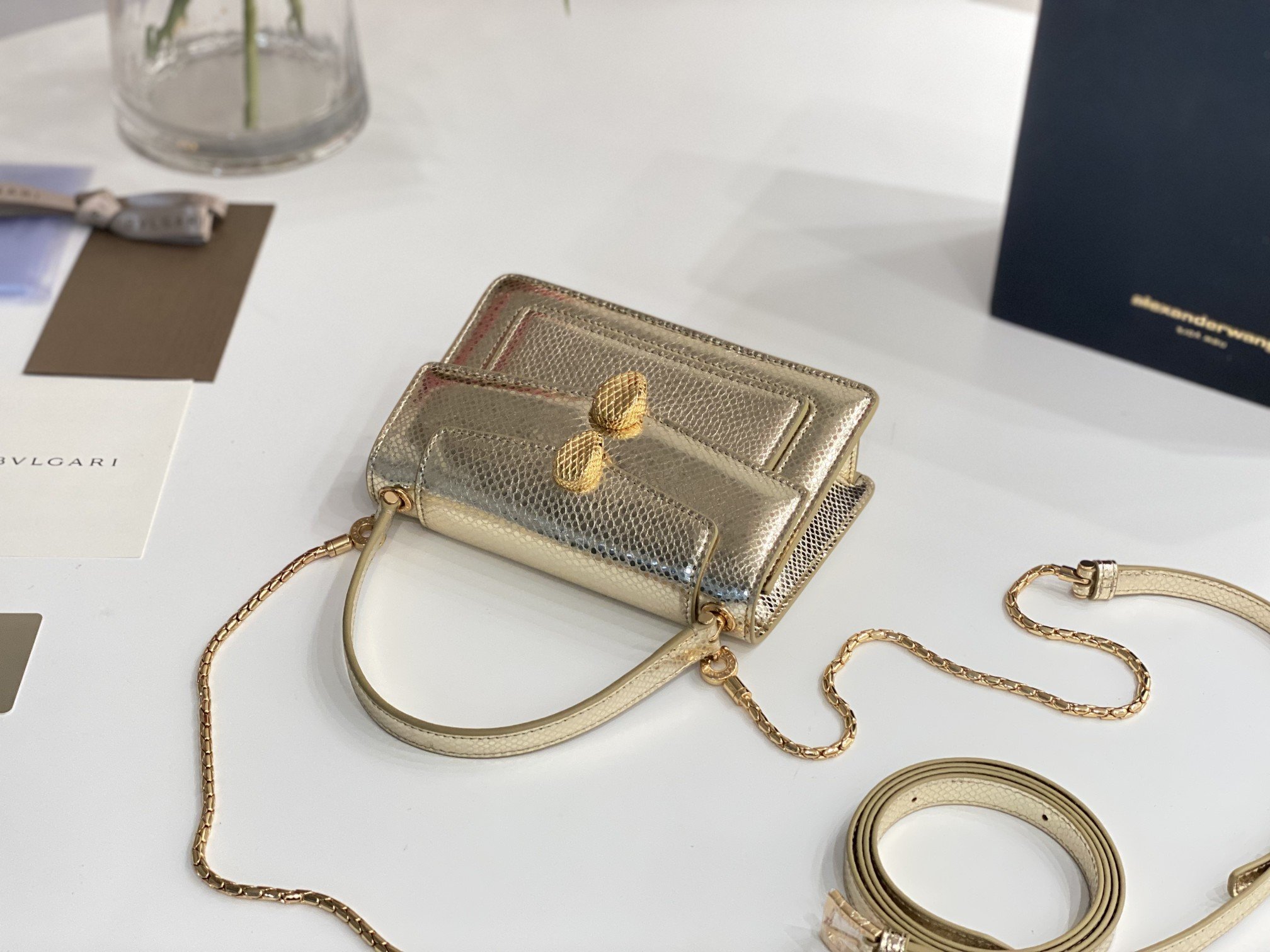 [B Home] The new product Alexander Wang sees the SERPENTI series belt bag, which has an avant-garde and impeccable easy-to-wear style, and interprets BVLGARI’s iconic spirit snake pattern with an ingenious design. Beautifully handcrafted in light “molten” gold-tone calfskin, adorned with enticing SERPENTI double snake heads in antiqued gold-plated brass and red enamel eyes, this bag combines functionality with ultra-modern style. It has a detachable handle, a snake chain and leather shoulder strap and a belt for a variety of wearing styles. One front pocket, one external flap pocket, one internal open pocket with “ALEXANDER WANG BULGARI” embossed inside. Model: 288739#