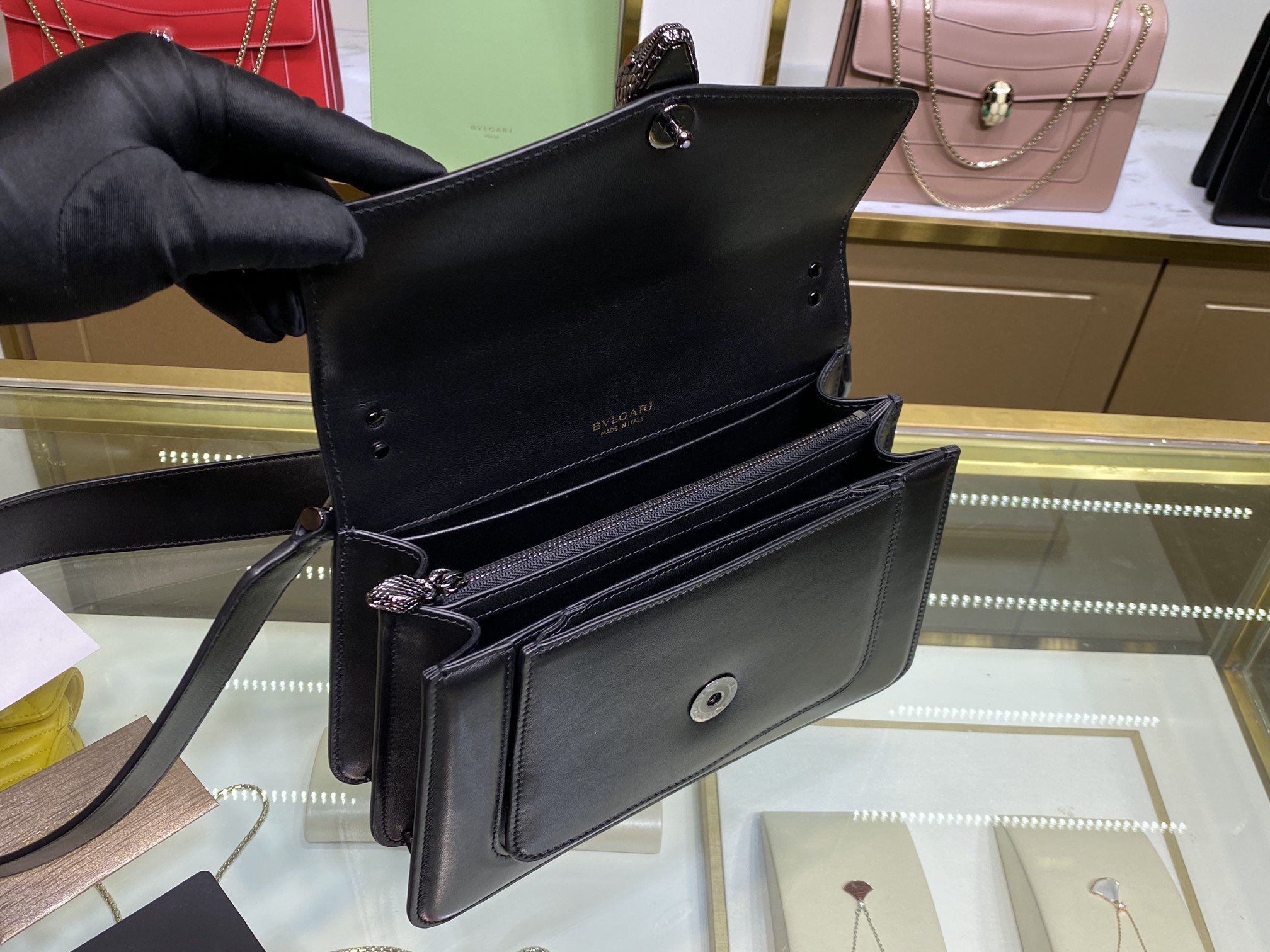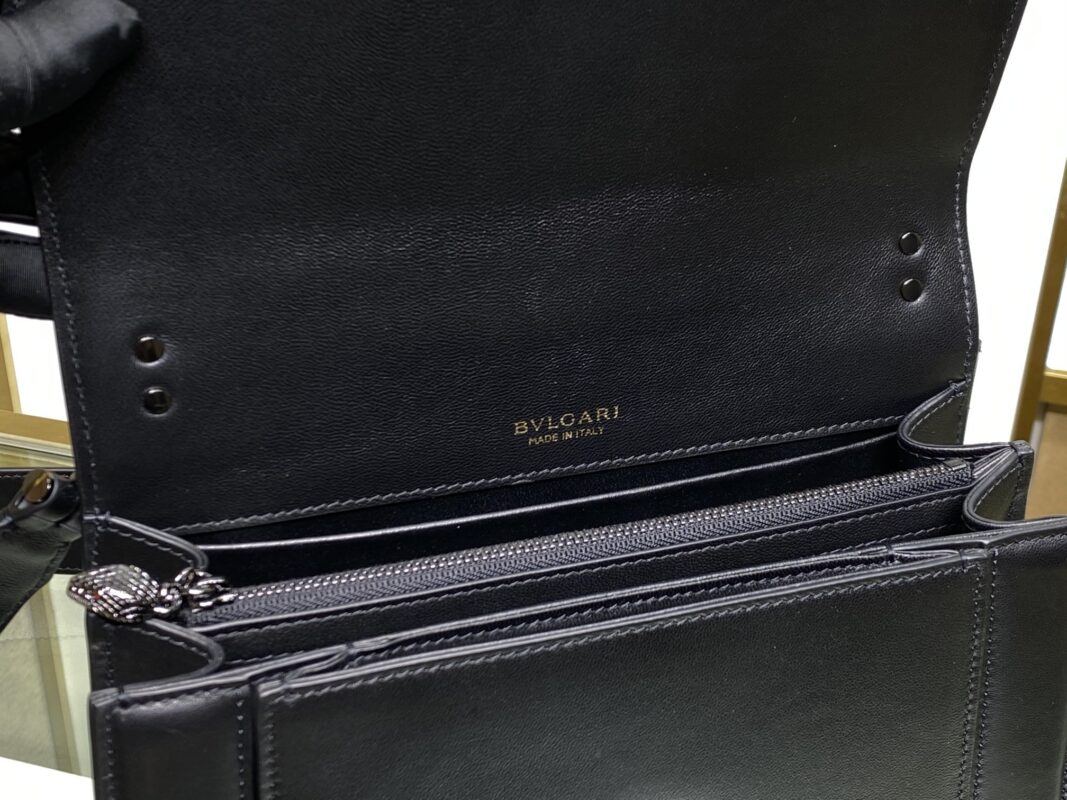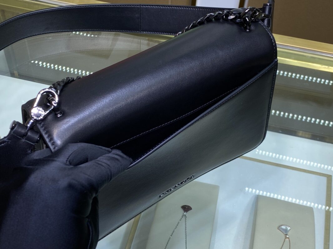 γB HomeγThe new paint chain ππππππππππ ππππππ series ushered in another masterpiece, a new crossbody bag with a more modern and everyday style. The Maxi Chain bag is crafted from soft black nappa leather with ruthenium-plated brass hardware. Ruthenium-plated brass Serpenti head closure with small black onyx snake scales in the center and red enamel eyes for a new look. The classic lacquered chain of the same color is decorated with a flip cover like a necklace, and can also be used as a delicate handle, showing the essence of the jewelry brand’s design. It features an interior organizer and an adjustable and detachable leather shoulder strap. The interior features one open pocket, one divided zipped pocket and a customizable make-up mirror. One front pocket and one back panel pocket. Model: B290872, Size: 25Γ17Γ8cm