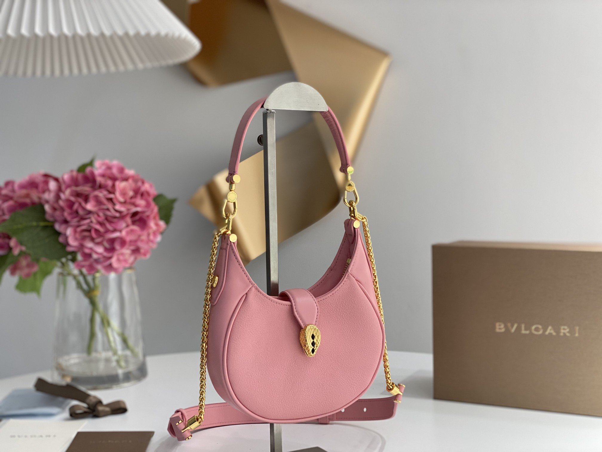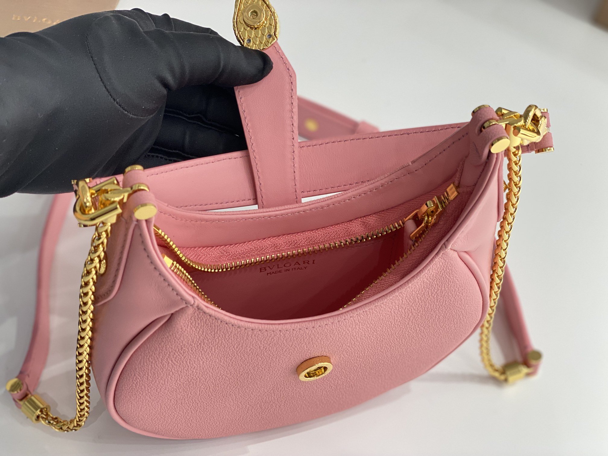 [B Home] New Messenger Bag Underarm Bag, the new SERPENTI ELLIPSE series small Messenger bag with unique shape, iconic details and changeable charm, this daily bag is made of black calfskin, with a small urban grain pattern in the center Made of calfskin with smooth textured calfskin sides and gold-plated brass hardware, it features a charming classic snake head with black onyx scales and red enamel eyes in the center, concealed by a front magnetic closure. Featuring a single compartment, adjustable chain and leather shoulder strap and detachable leather handle, it can be worn crossbody or as a classic shoulder bag. Practical top zip closure, one interior pocket, one exterior pocket and BVLGARI metallic BVLGARI logo on the back.