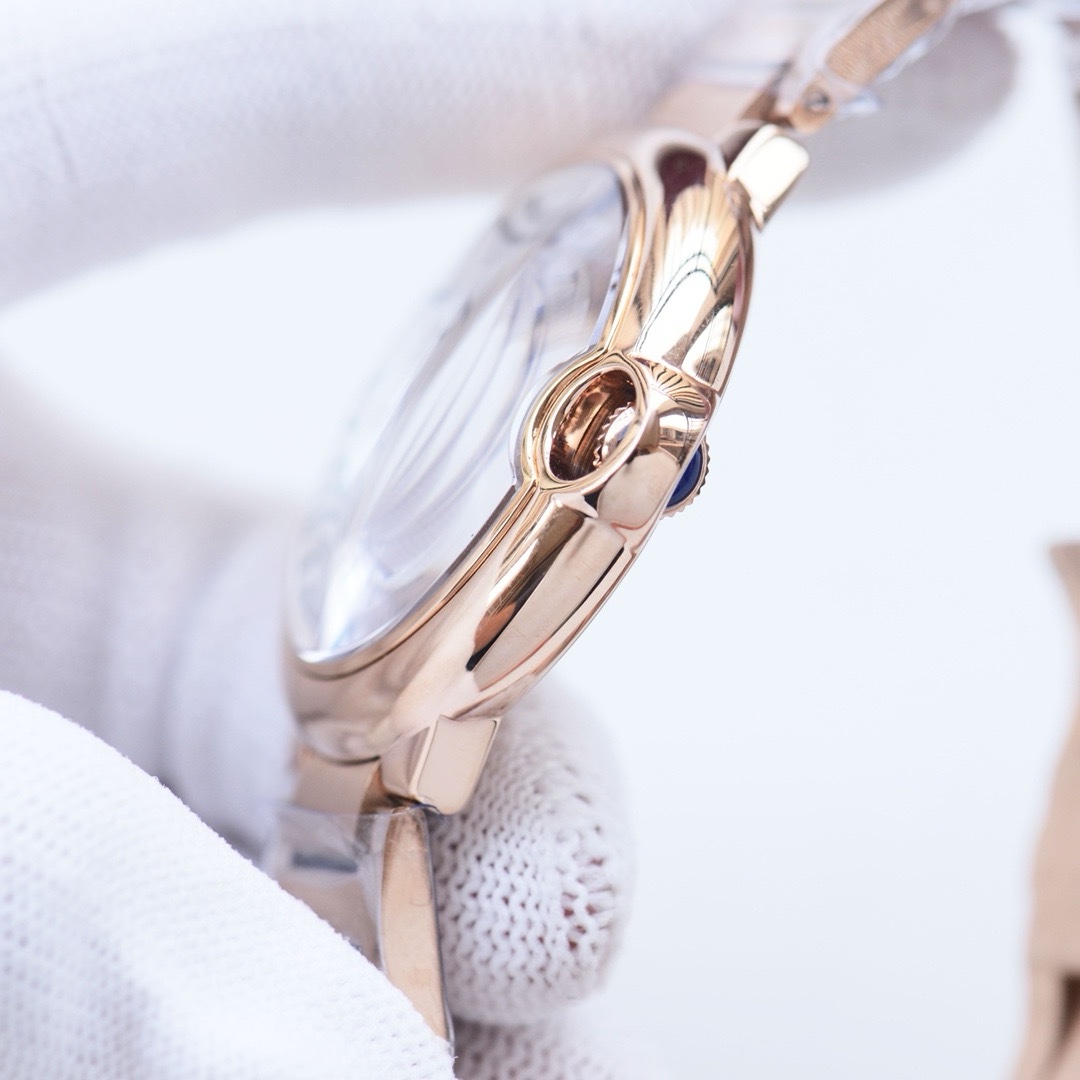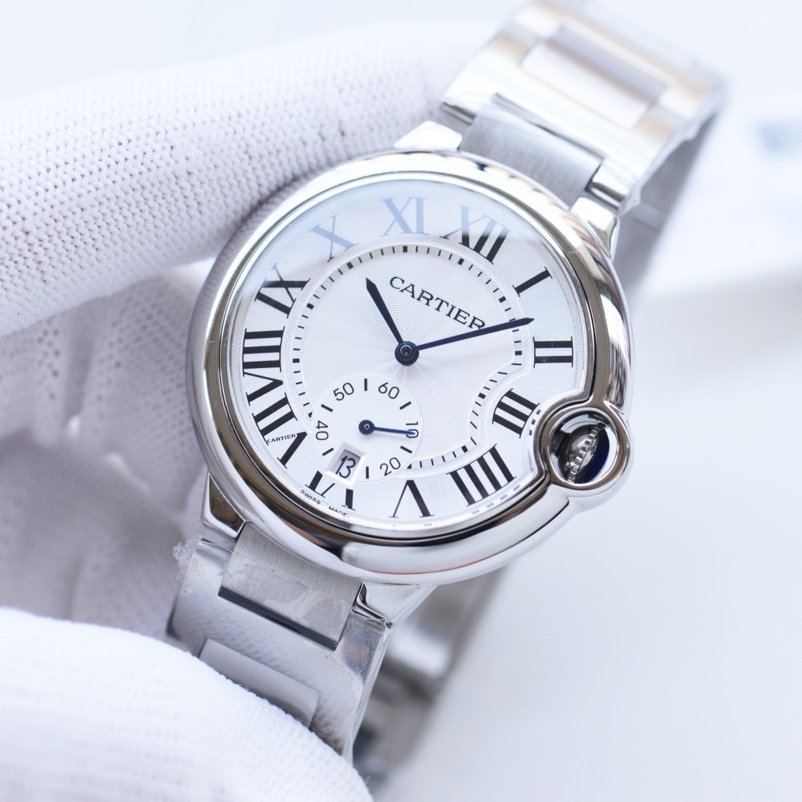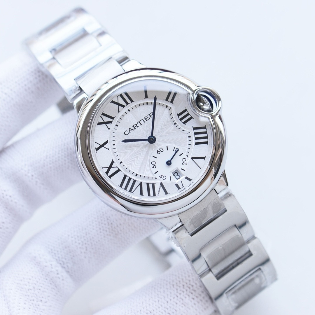 Роскошная серия часов Cartier Cartier Blue Balloon, часы для пар с импортным механизмом Citizen, размер 33-36-42 мм, двойное сапфировое стекло «рыбий глаз», открывающееся стекло с отражающим зубом, классический римский белый циферблат, 6-значное окошко календаря , стальные синие руки в форме меча, корпус из нержавеющей стали 316, оригинальный стальной ремень из нержавеющей стали 316, импортная воловья кожа, (сапфировое зеркало с двойным пузырьком «рыбий глаз» и 30-метровая водонепроницаемая нижняя крышка с кодом гарантийного талона производства Тайваньской фабрики)