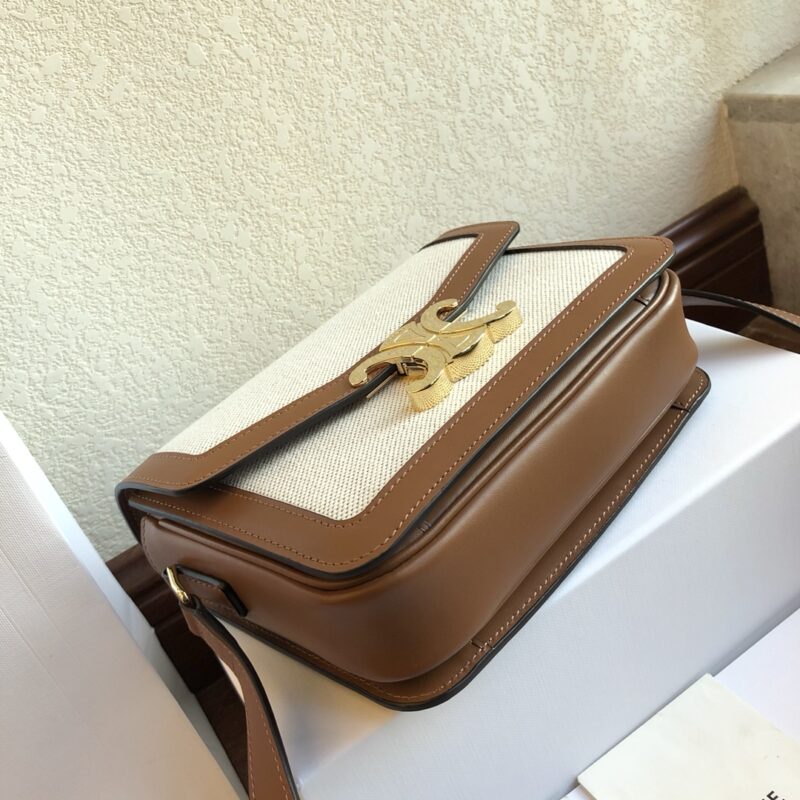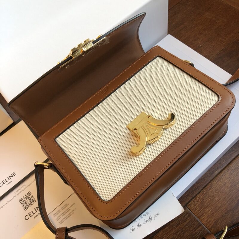 Triomphe Arc de Triomphe series Slippery leather with woven cloth + leather shoulder strap with one shoulder crossbody. Fine-grained calfskin with sheepskin lining on the inside. Gold-tone hardware, brass lock closure. Internal zipper pockets and flat pockets are adjustable, leather shoulder strap length 47cm. Mini: 18x14x6cm