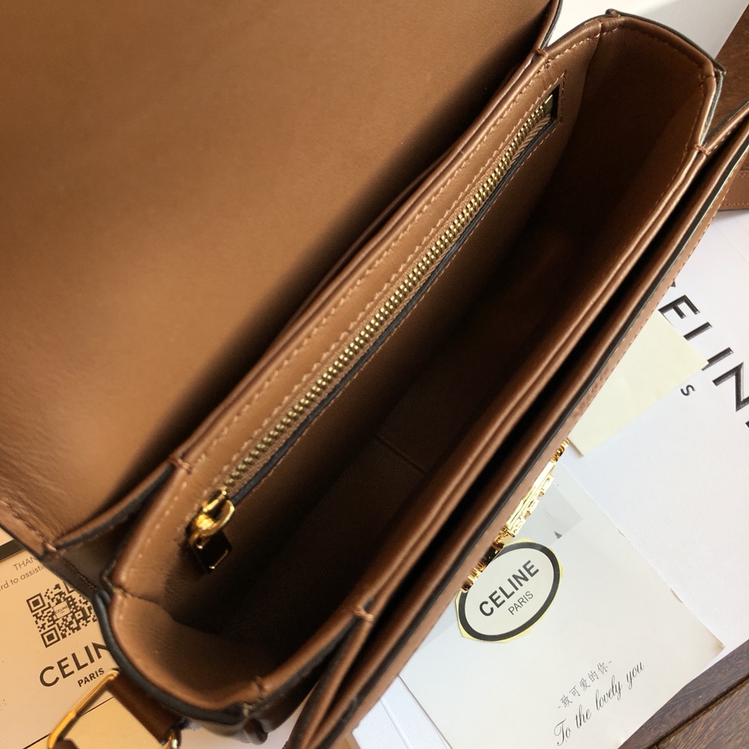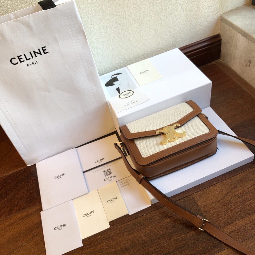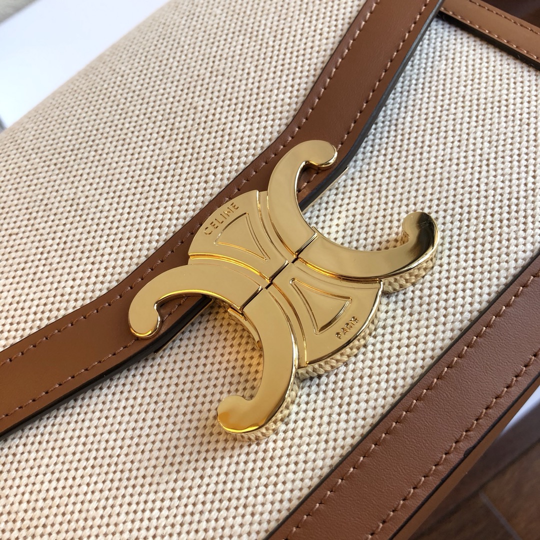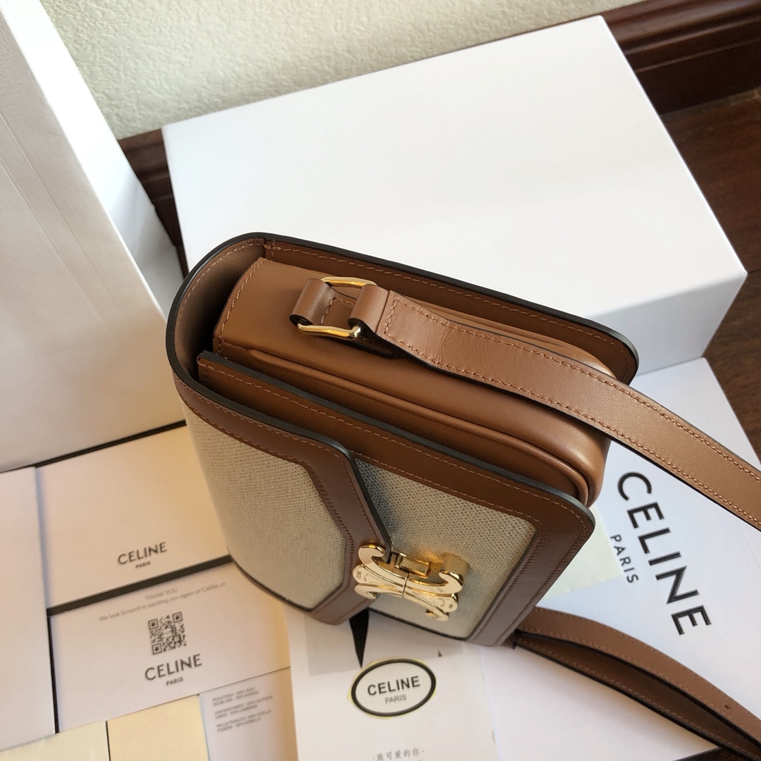 Triomphe Arc de Triomphe series Slippery leather with woven cloth + leather shoulder strap with one shoulder crossbody. Fine-grained calfskin with sheepskin lining on the inside. Gold-tone hardware, brass lock closure. Internal zipper pockets and flat pockets are adjustable, leather shoulder strap length 47cm. Mini: 18x14x6cm