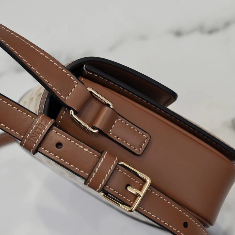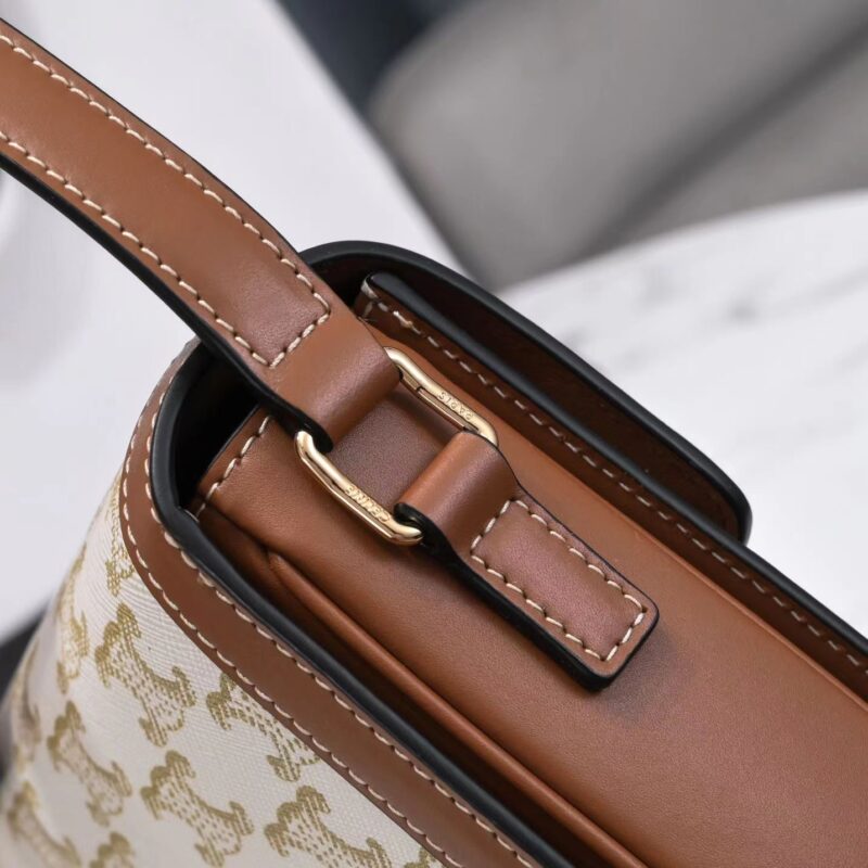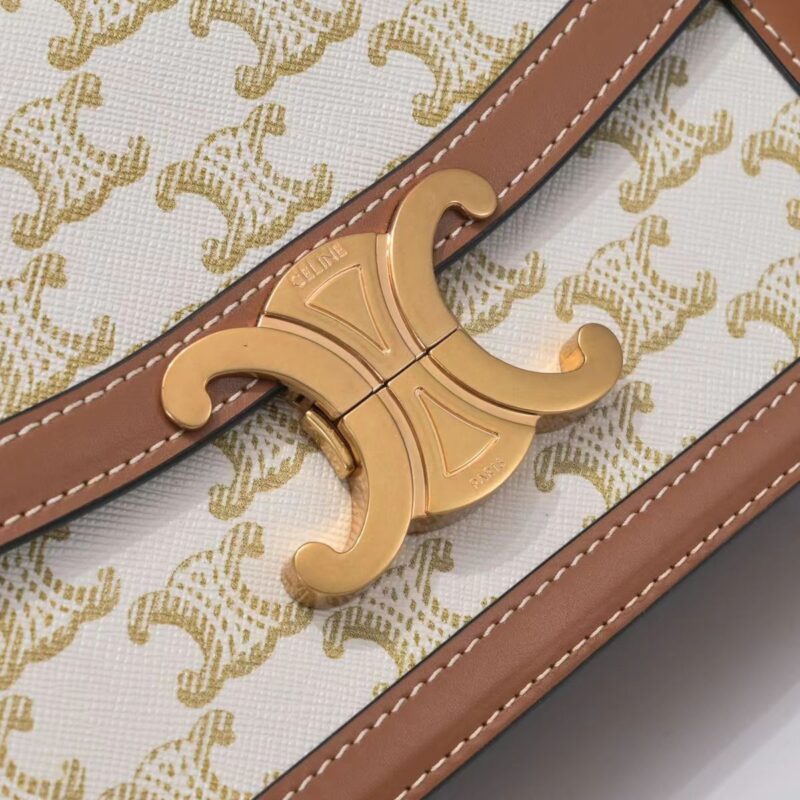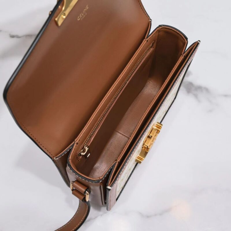 Celine Triomphe Canvas logo print. Cow leather handbag Arc de Triomphe small. Printed waterproof fabric calf leather edging sheepskin lining. Can be worn cross-body or over the shoulder, Triomphe, stainless steel metallic lock closure, inside zip pocket and flat pocket, with adjustable leather shoulder strap. Super invincible and versatile, powerful outfit. Model 188423. Dimensions: 18.5x14x6cm.