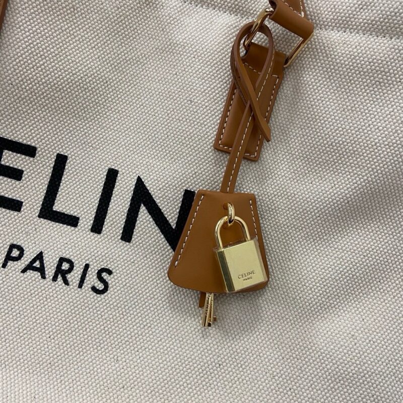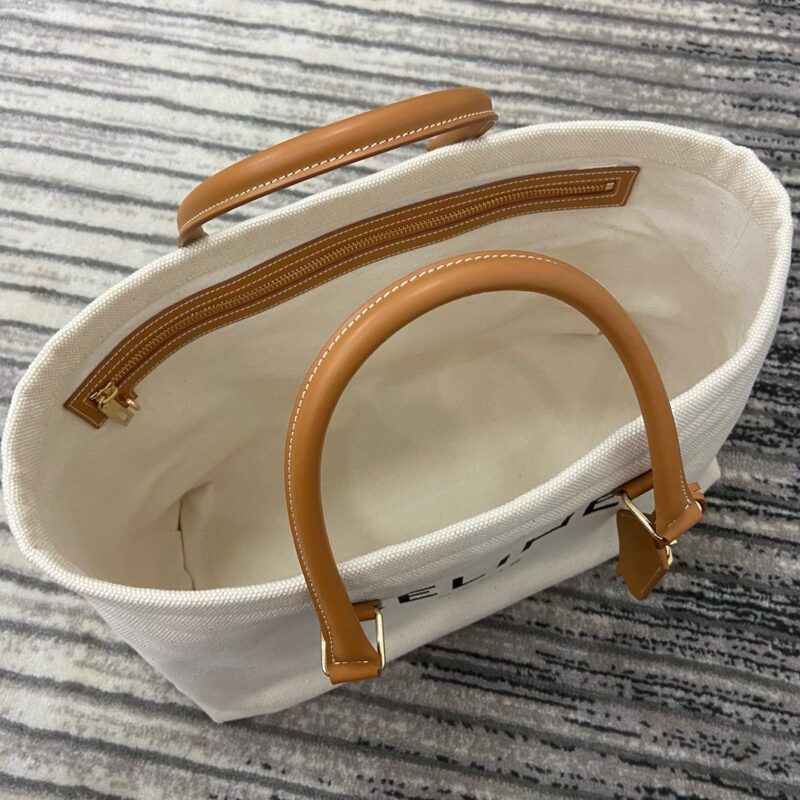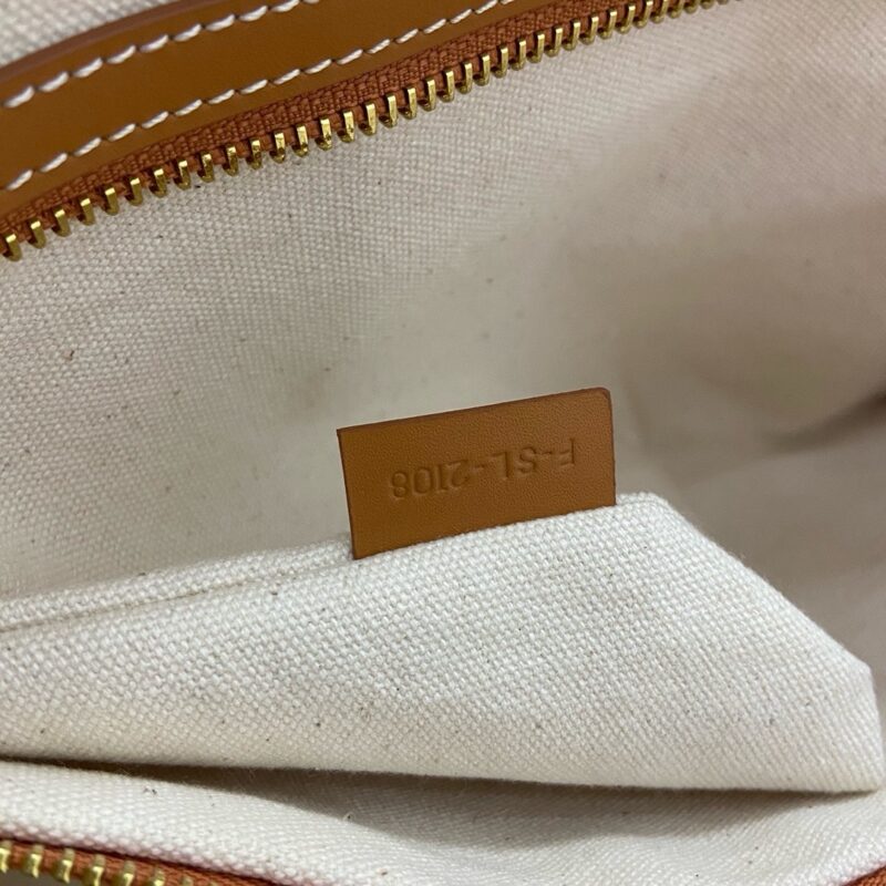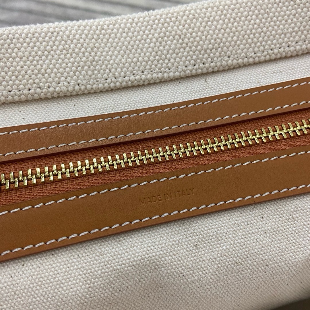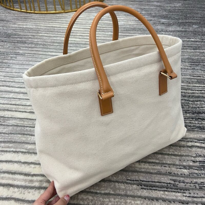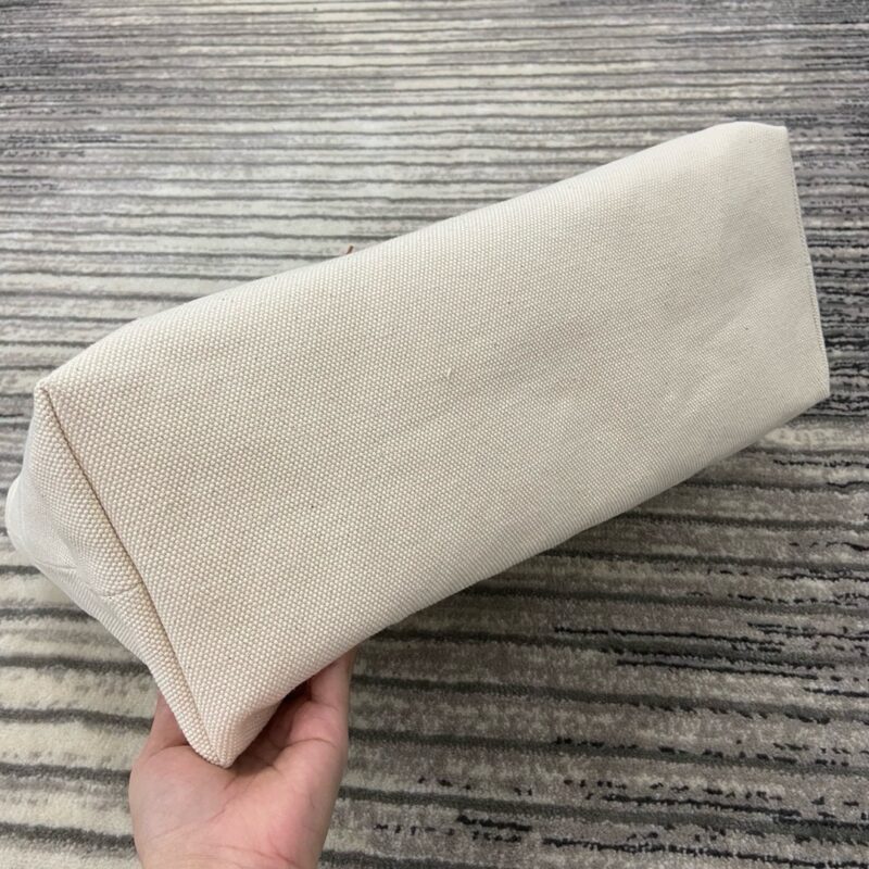 На бежевой канве напечатан логотип бренда. Она сочетается с фирменной кожаной ручкой и золотым замком, что придает ей роскошную текстуру. Size: 44x32x16cm (2024)