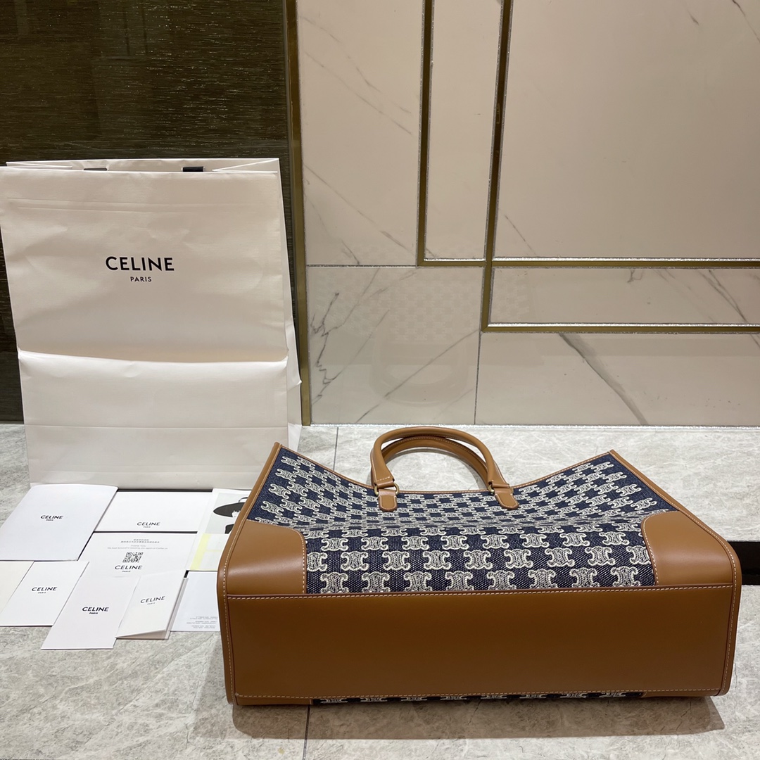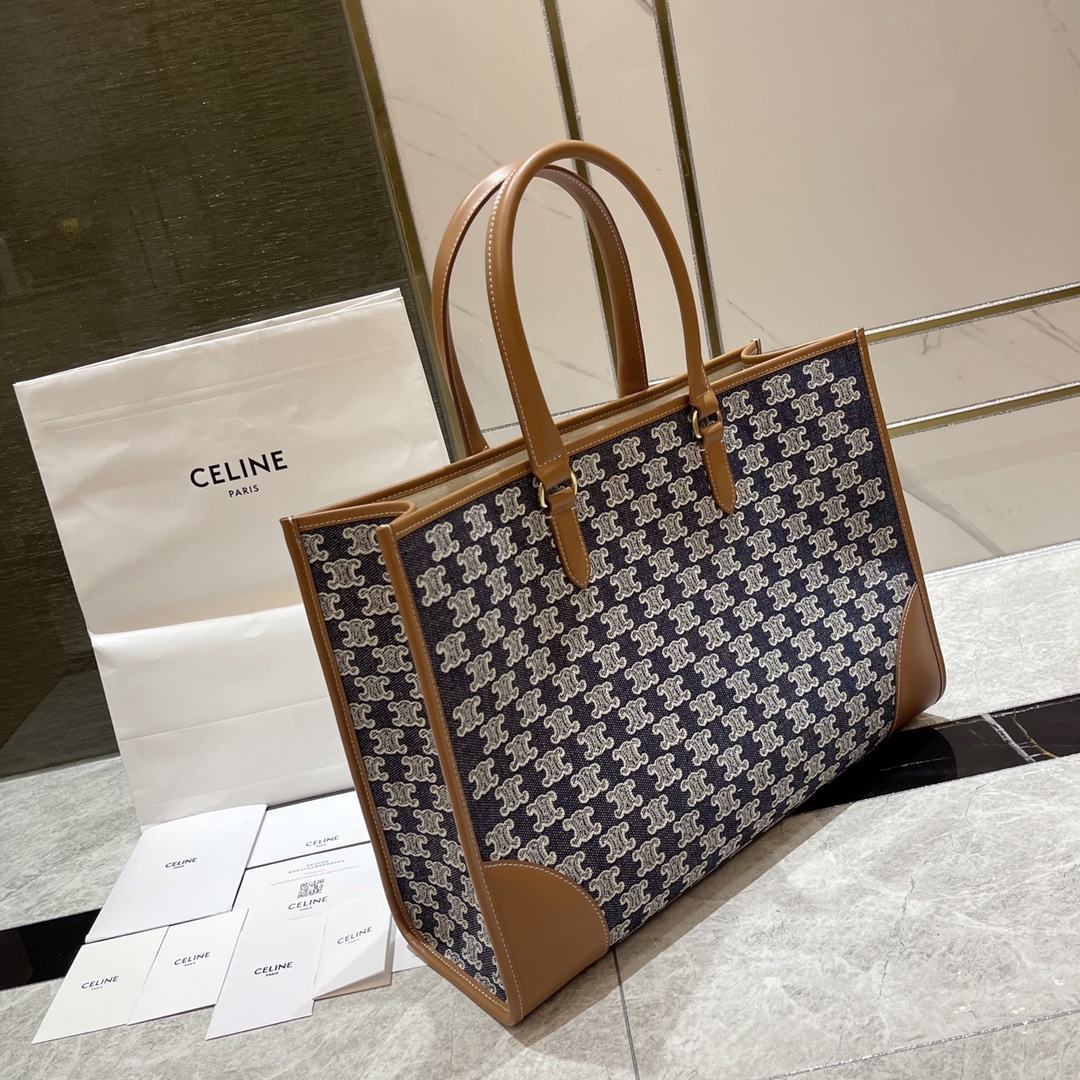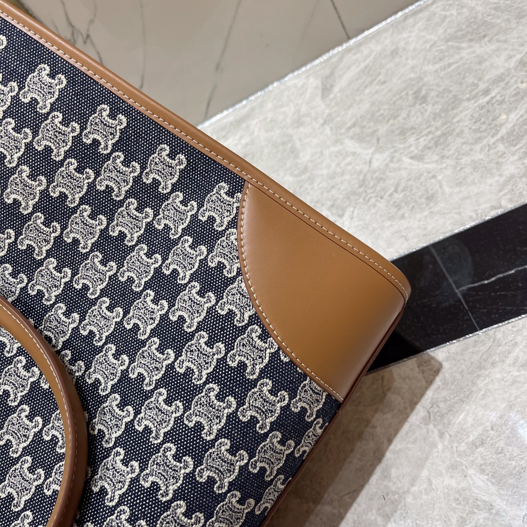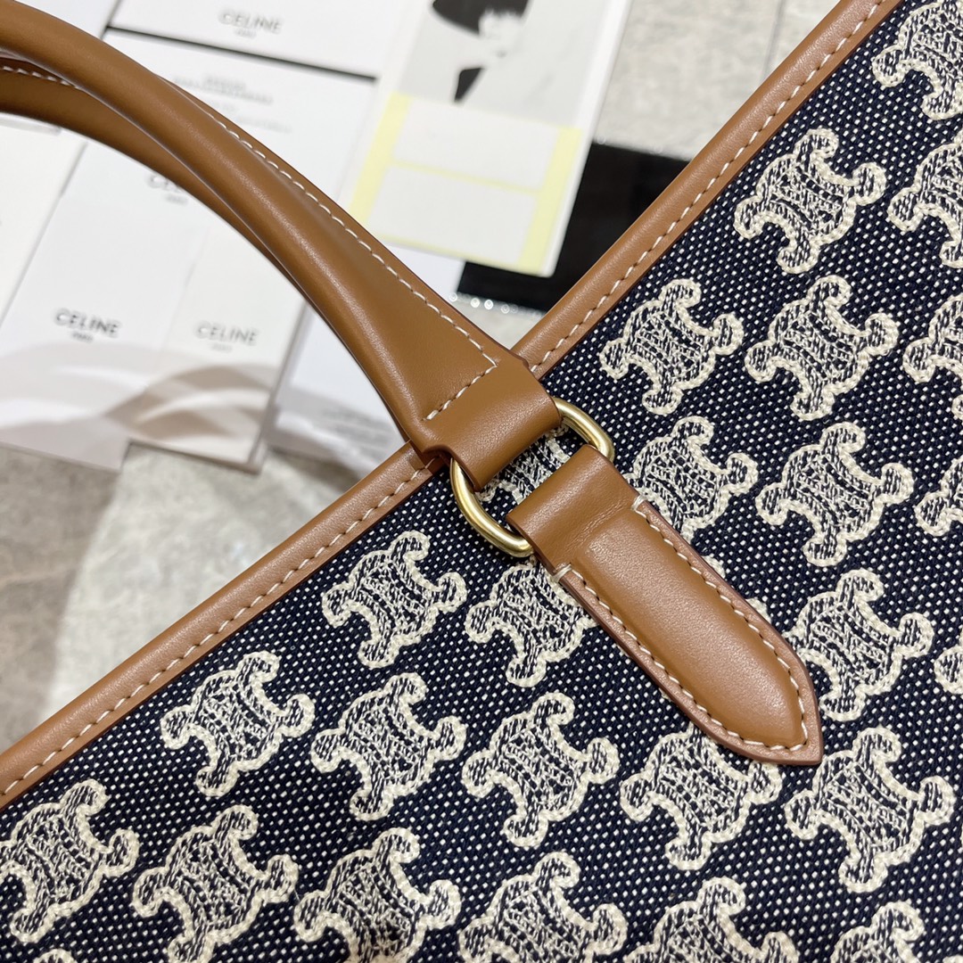 Cabas Triomphe Tote Horizontal Bag in denim embroidered fabric, cowhide trim, lining: fabric. Shoulder or hand carry, snap button closure, inner flat and zipper pockets, handle length 17cm. Dimensions: 43 X 31 X 15cm