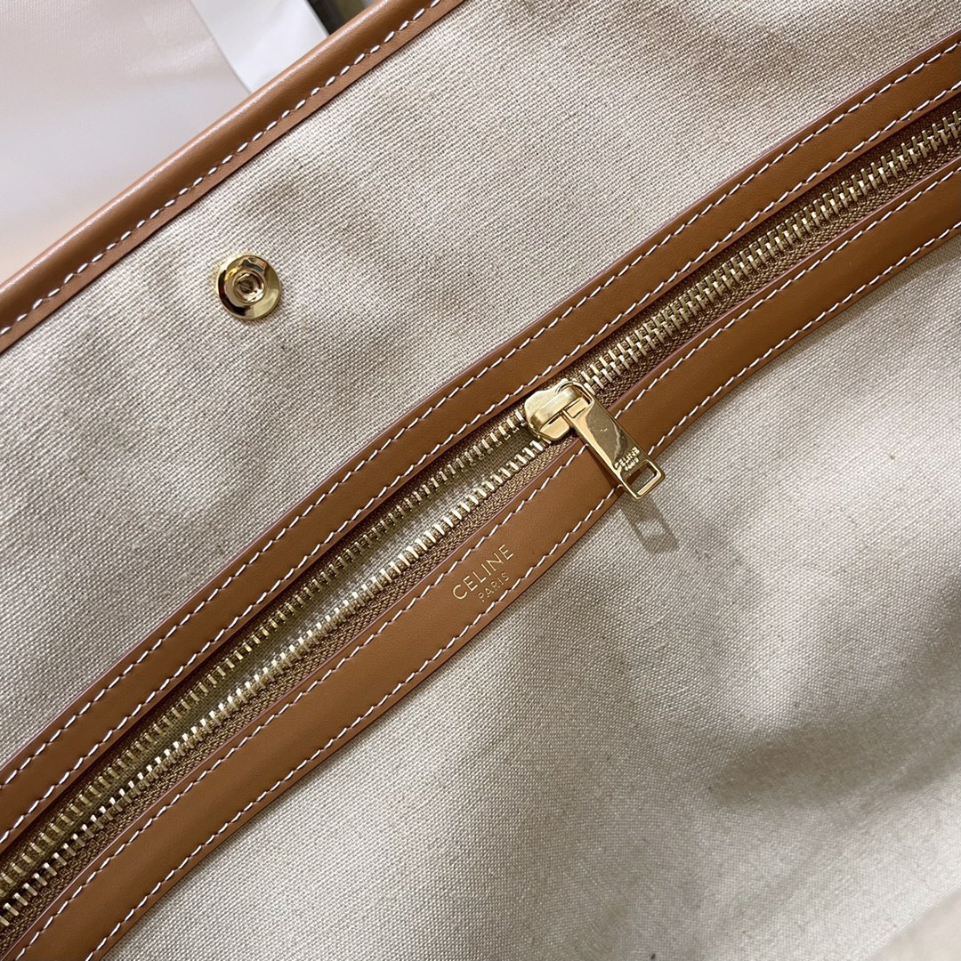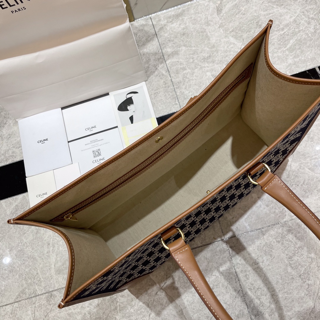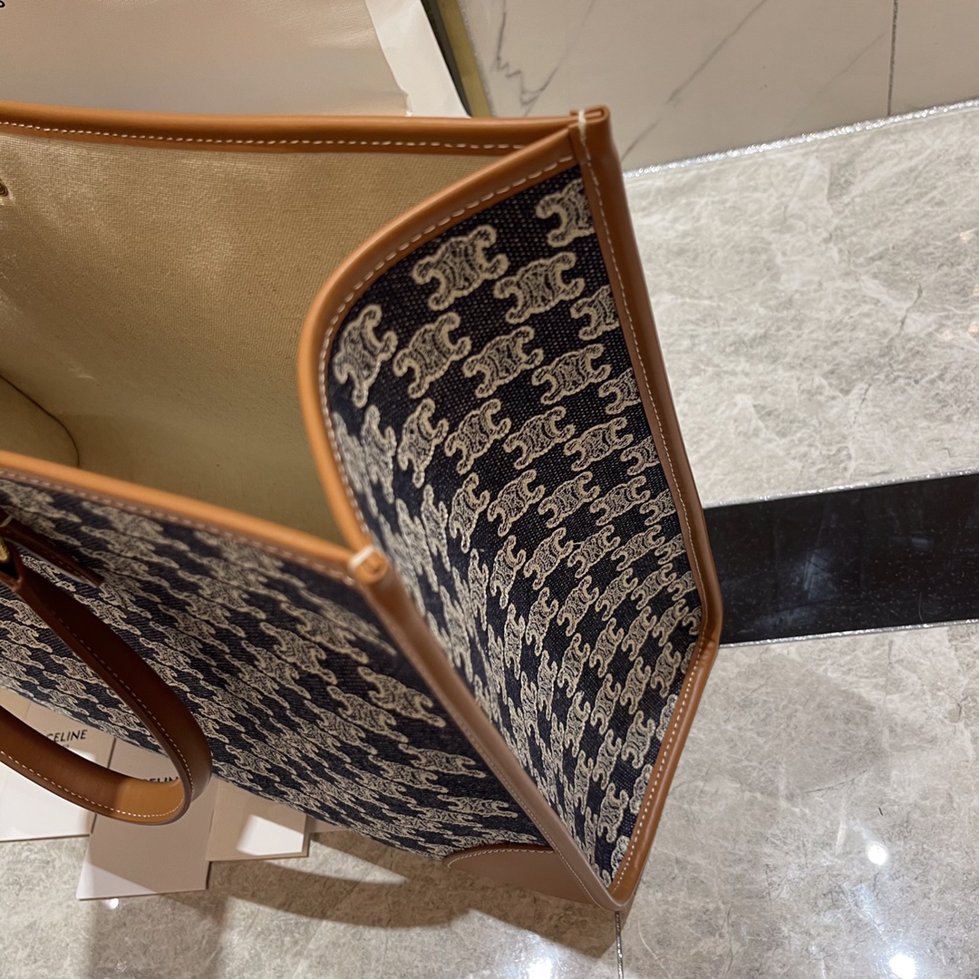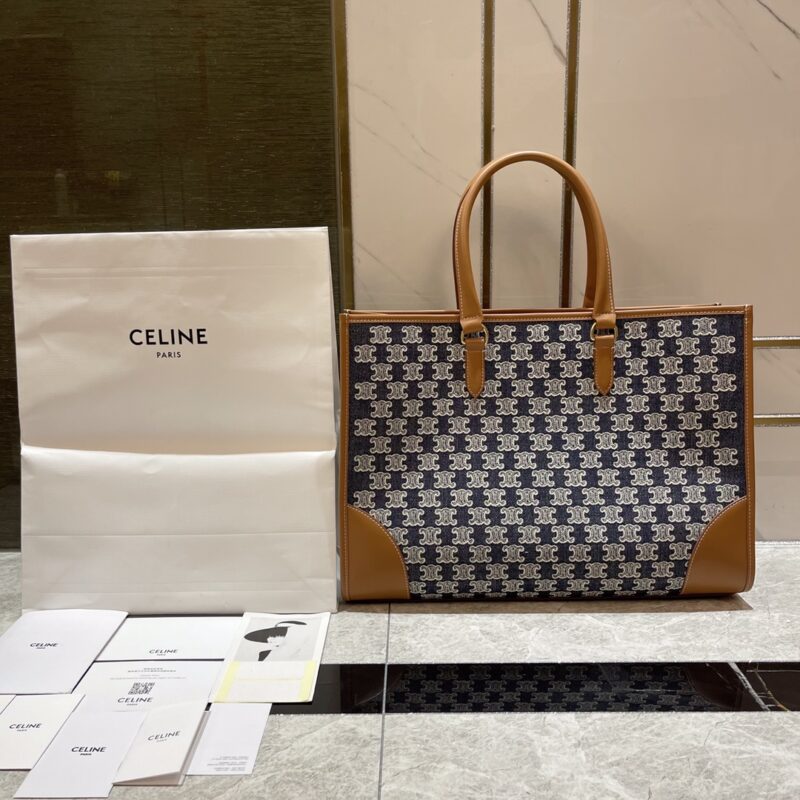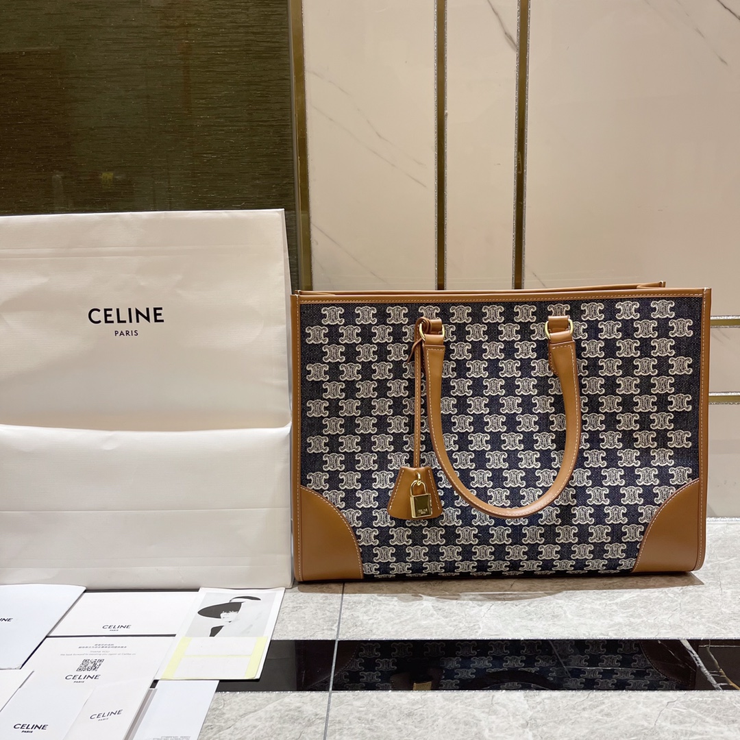 Cabas Triomphe Tote Horizontal Bag in denim embroidered fabric, cowhide trim, lining: fabric. Shoulder or hand carry, snap button closure, inner flat and zipper pockets, handle length 17cm. Dimensions: 43 X 31 X 15cm