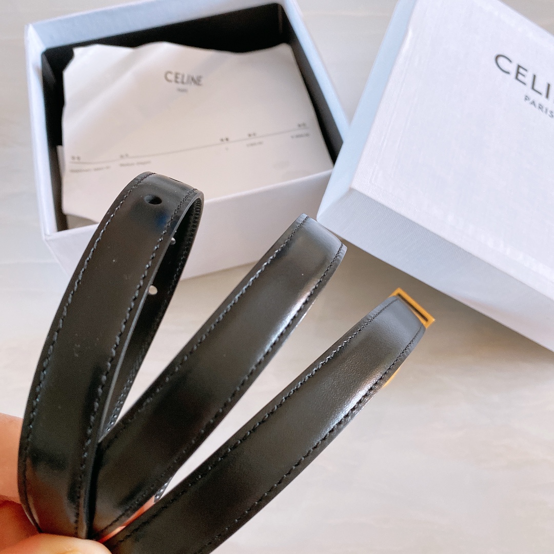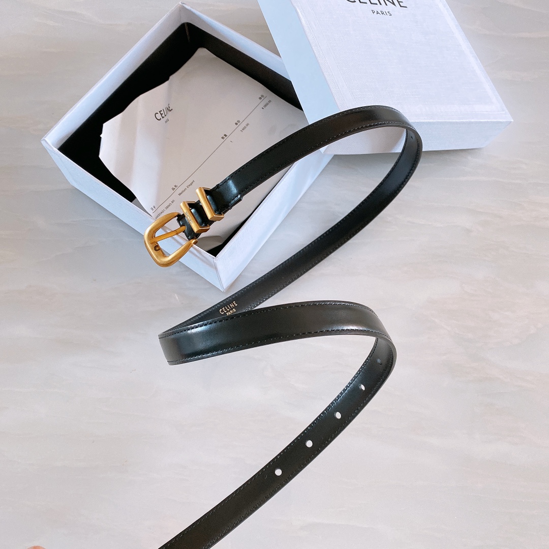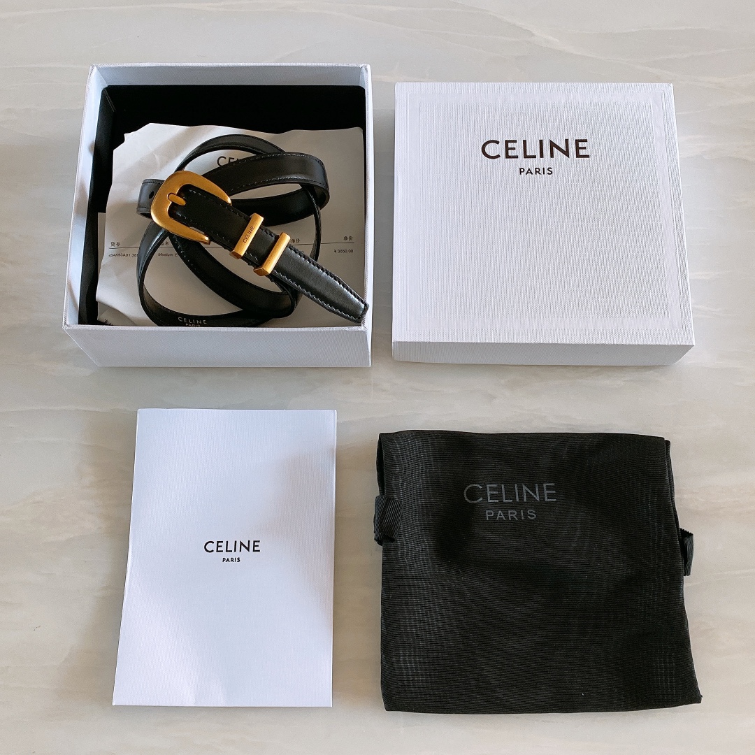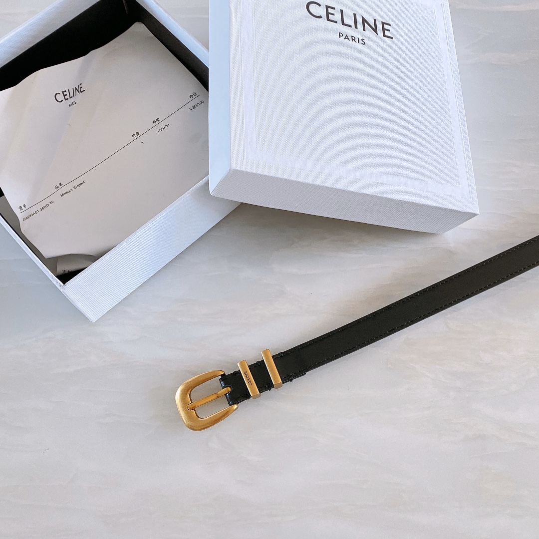 Celine cow leather. Gold-tone hardware 1.8cm wide, round buckle. Belt with 2 metal rings. The first ring is engraved with Celine Paris. Size: 75~100 2408003
