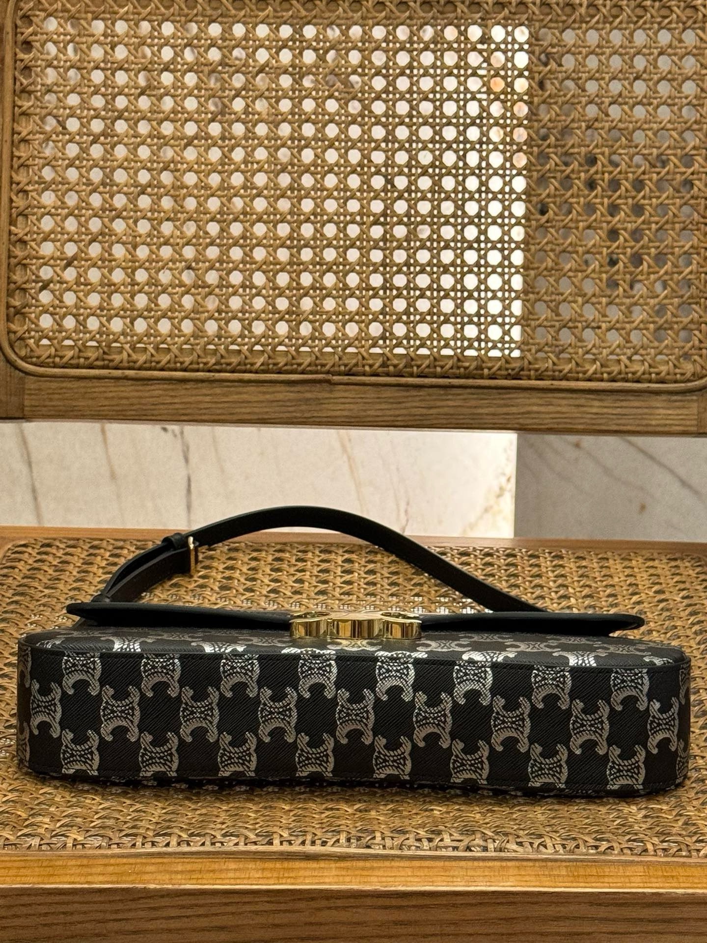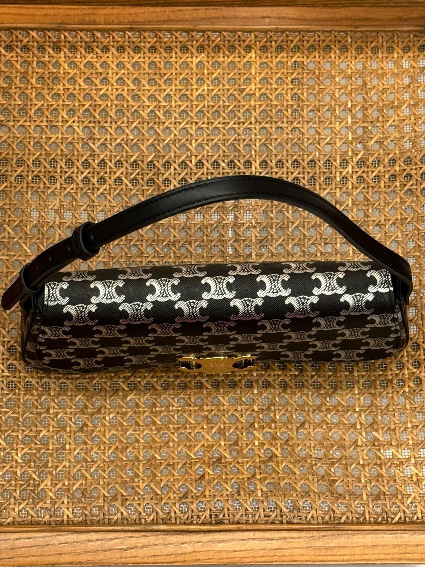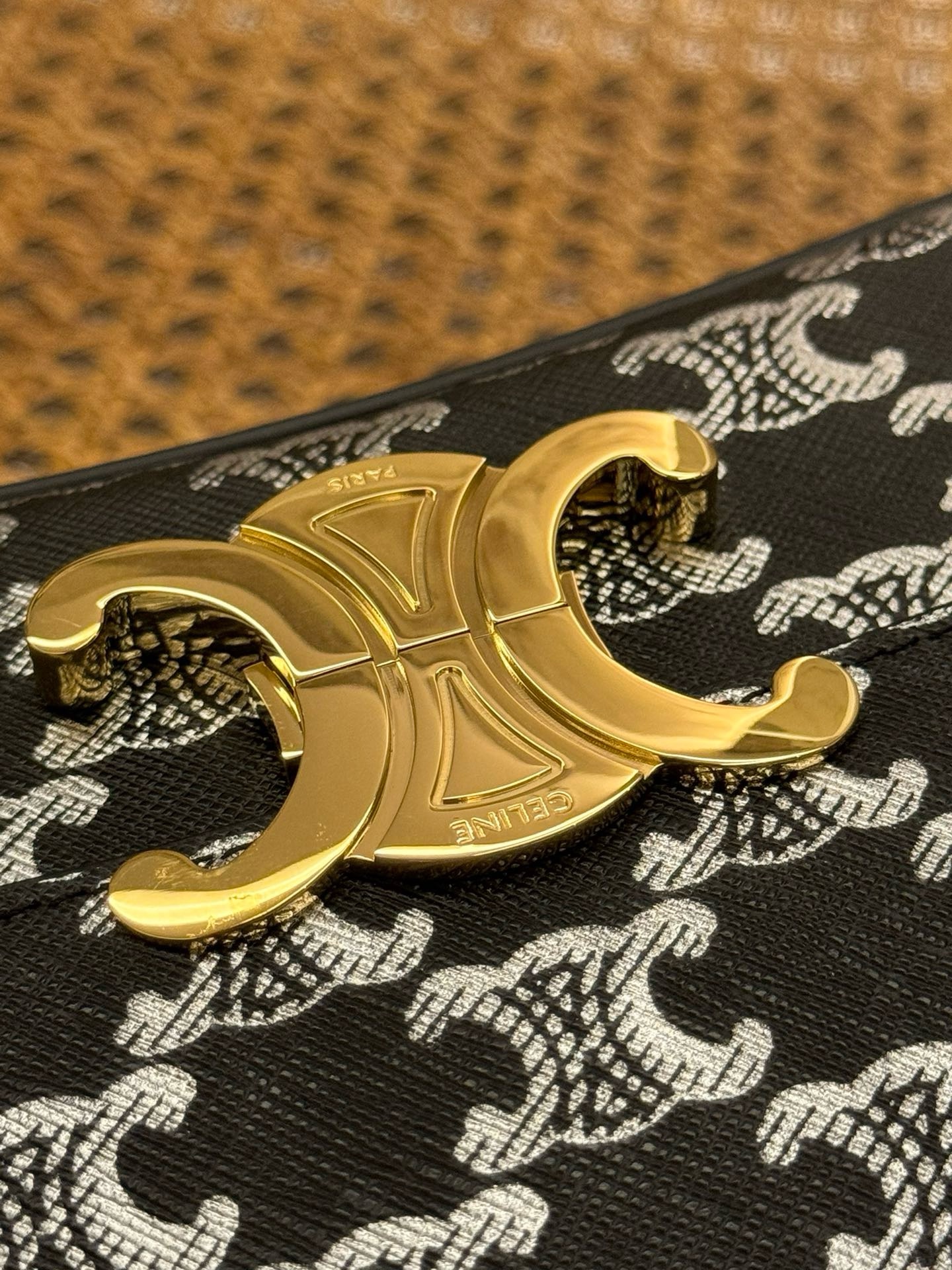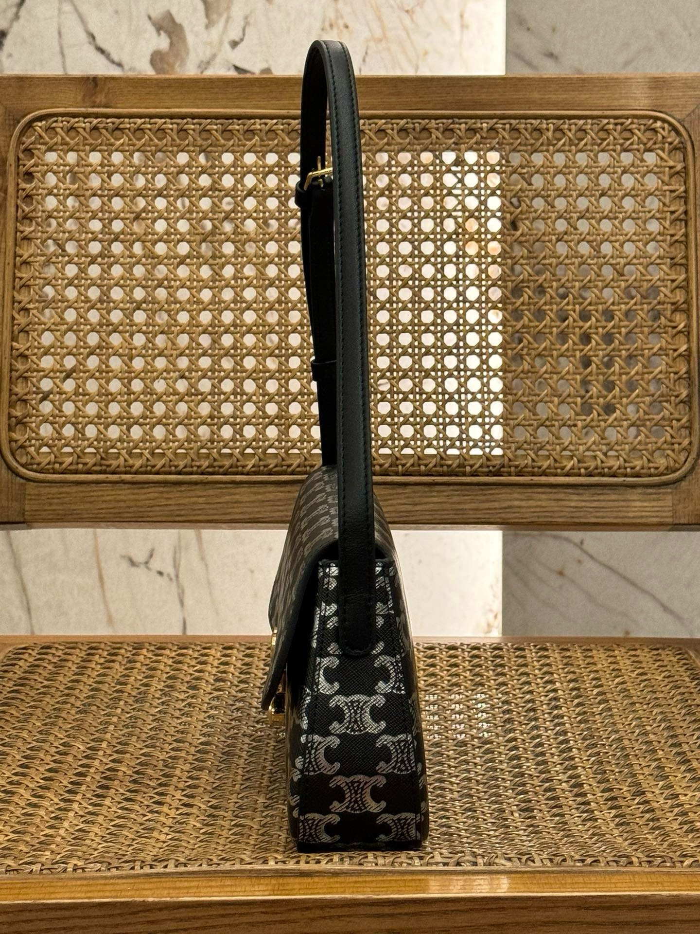 Уникальная отделка обеспечивает баланс между блеском и прозрачностью. Простая и красивая, она продолжает изящный багетный силуэт сумки через плечо Triomphe. Изюминкой является то, что дно сумки имеет романтическую дугообразную линию, добавляющую нотку милого темперамента.