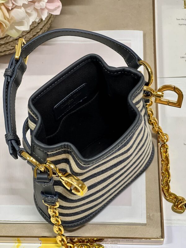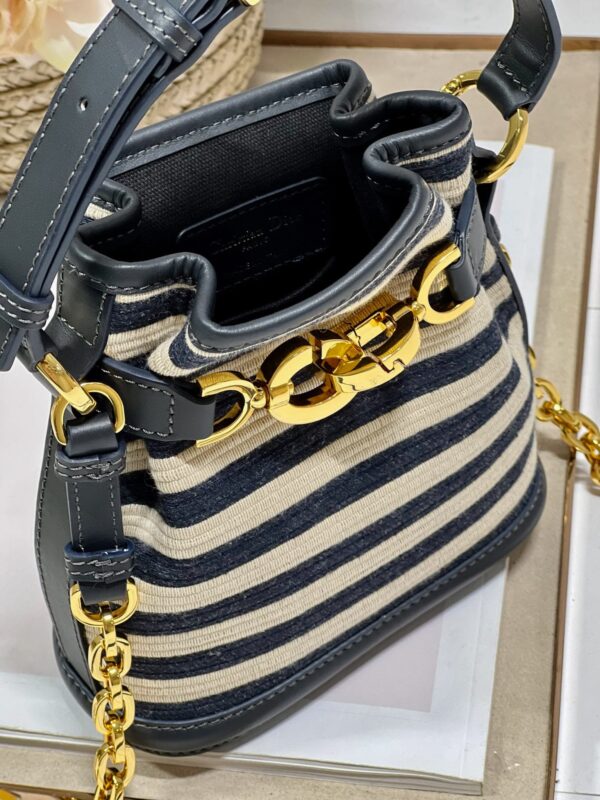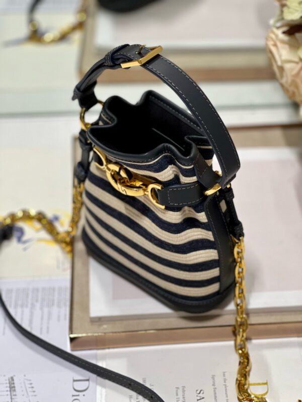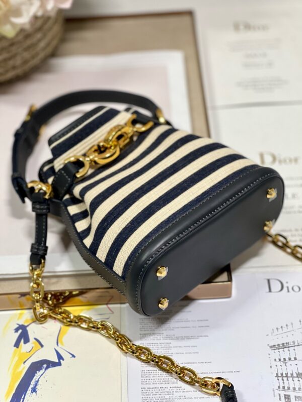 New for Fall 2023, this C’est Dior bag is elegant and timeless. Crafted from natural grass in natural and denim blue, it is embellished with the signature motif of the ready-to-wear collection – Dior Marinière. Bucket bag shape with CD Lock closure and knob-shaped letter D, which can safely store all kinds of daily necessities. The petite style features a top handle and an adjustable and detachable chain shoulder strap with leather strap for easy hand-carrying.