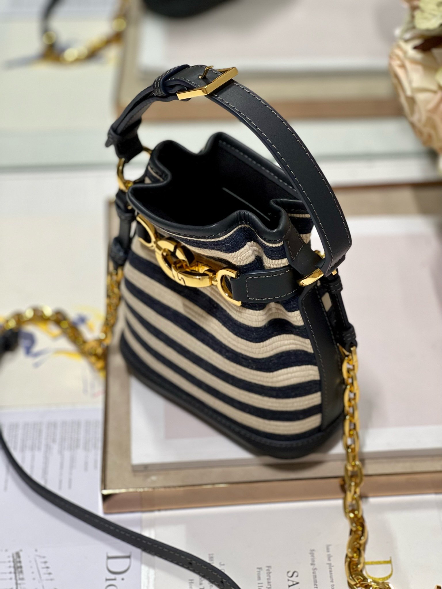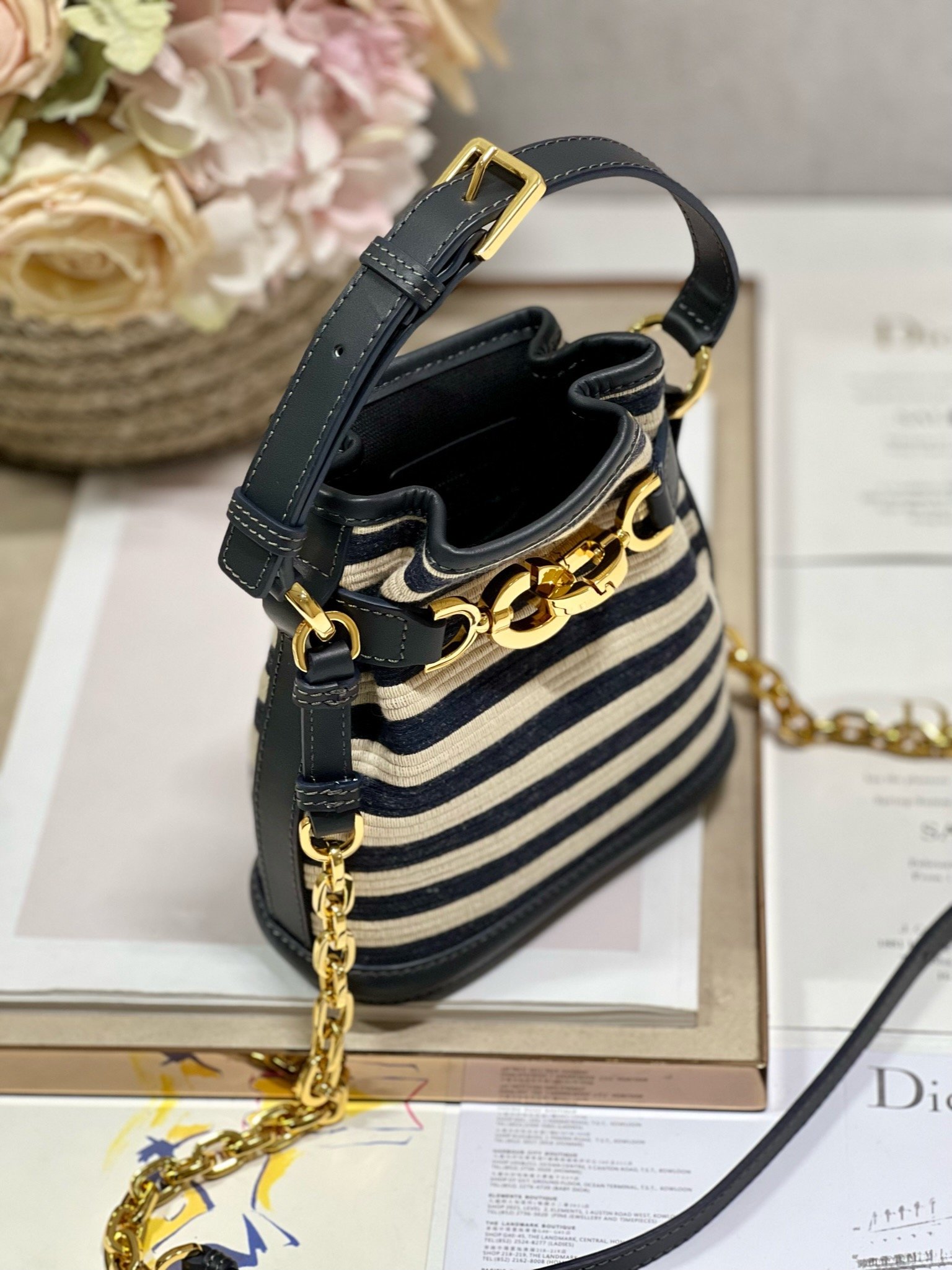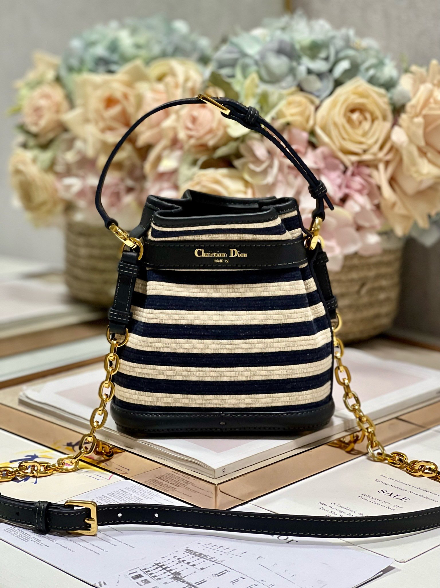 New for Fall 2023, this C’est Dior bag is elegant and timeless. Crafted from natural grass in natural and denim blue, it is embellished with the signature motif of the ready-to-wear collection – Dior Marinière. Bucket bag shape with CD Lock closure and knob-shaped letter D, which can safely store all kinds of daily necessities. The petite style features a top handle and an adjustable and detachable chain shoulder strap with leather strap for easy hand-carrying.
