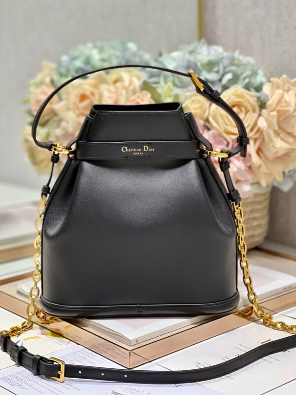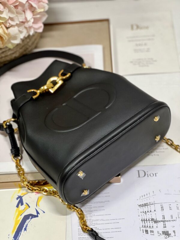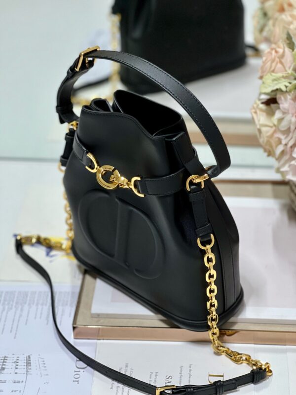 New for Fall 2023, this C’est Dior bag is elegant and timeless. Expertly crafted in black calfskin, it is embossed with the CD logo on the front, underscoring Dior’s savoir-faire. Bucket bag shape with CD Lock closure and knob-shaped letter D, which can safely store all kinds of daily necessities. The petite style features a top handle and an adjustable and detachable chain shoulder strap with leather strap for easy hand-carrying.