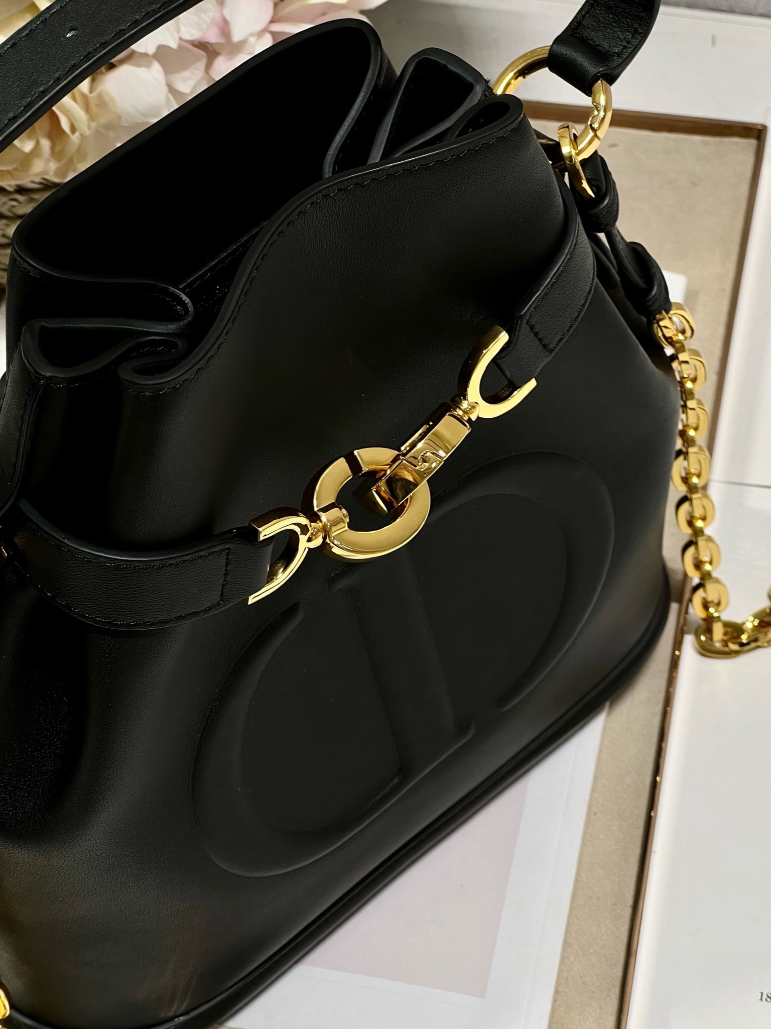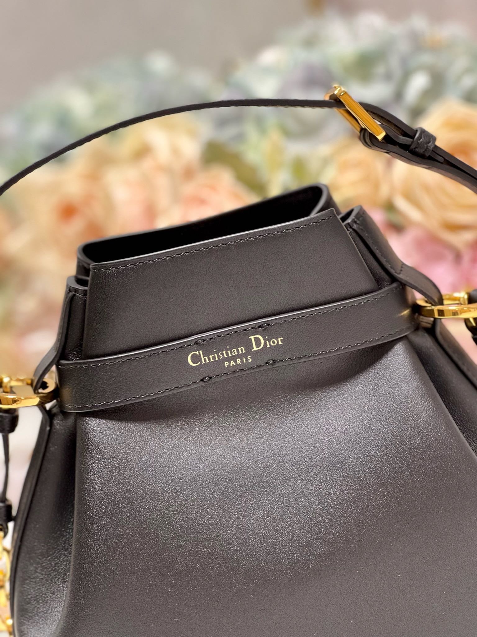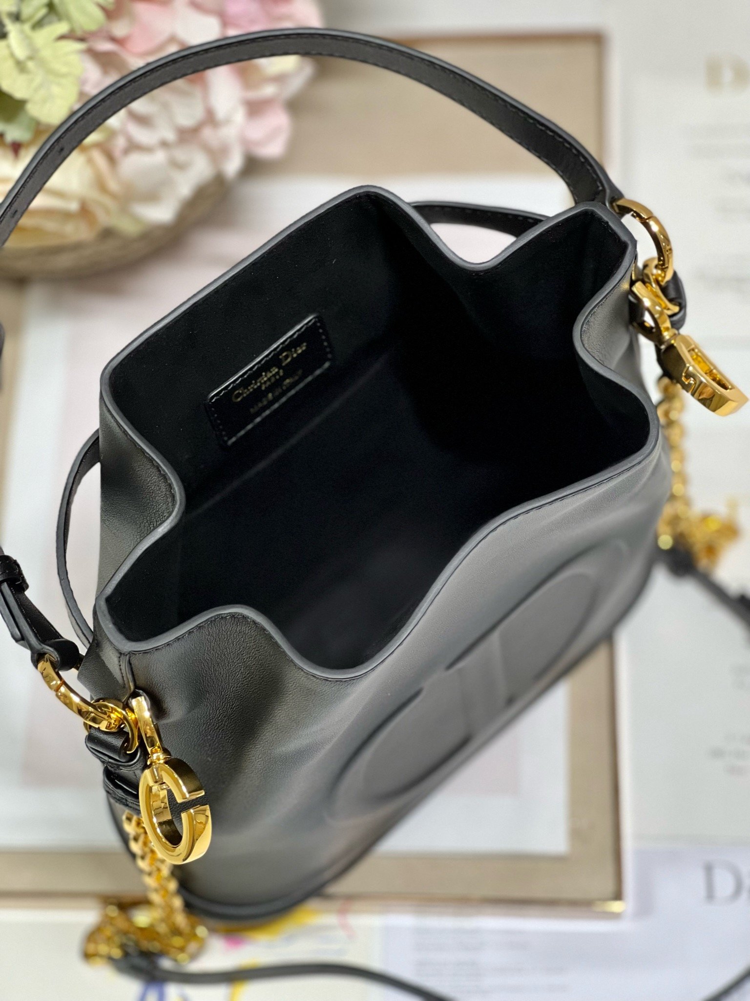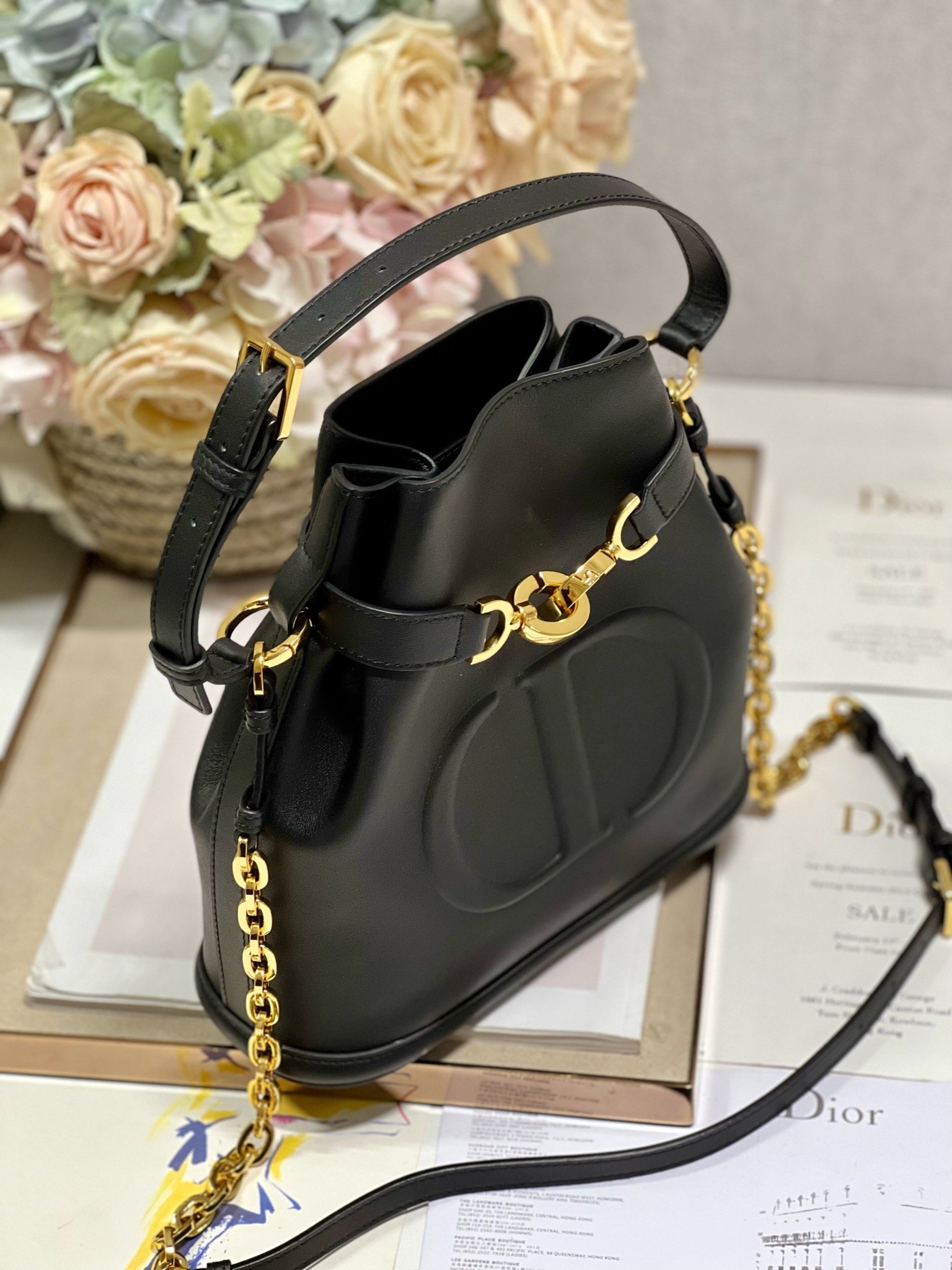New for Fall 2023, this C’est Dior bag is elegant and timeless. Expertly crafted in black calfskin, it is embossed with the CD logo on the front, underscoring Dior’s savoir-faire. Bucket bag shape with CD Lock closure and knob-shaped letter D, which can safely store all kinds of daily necessities. The petite style features a top handle and an adjustable and detachable chain shoulder strap with leather strap for easy hand-carrying.
