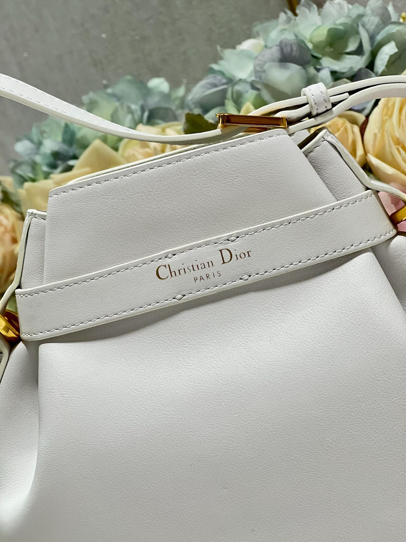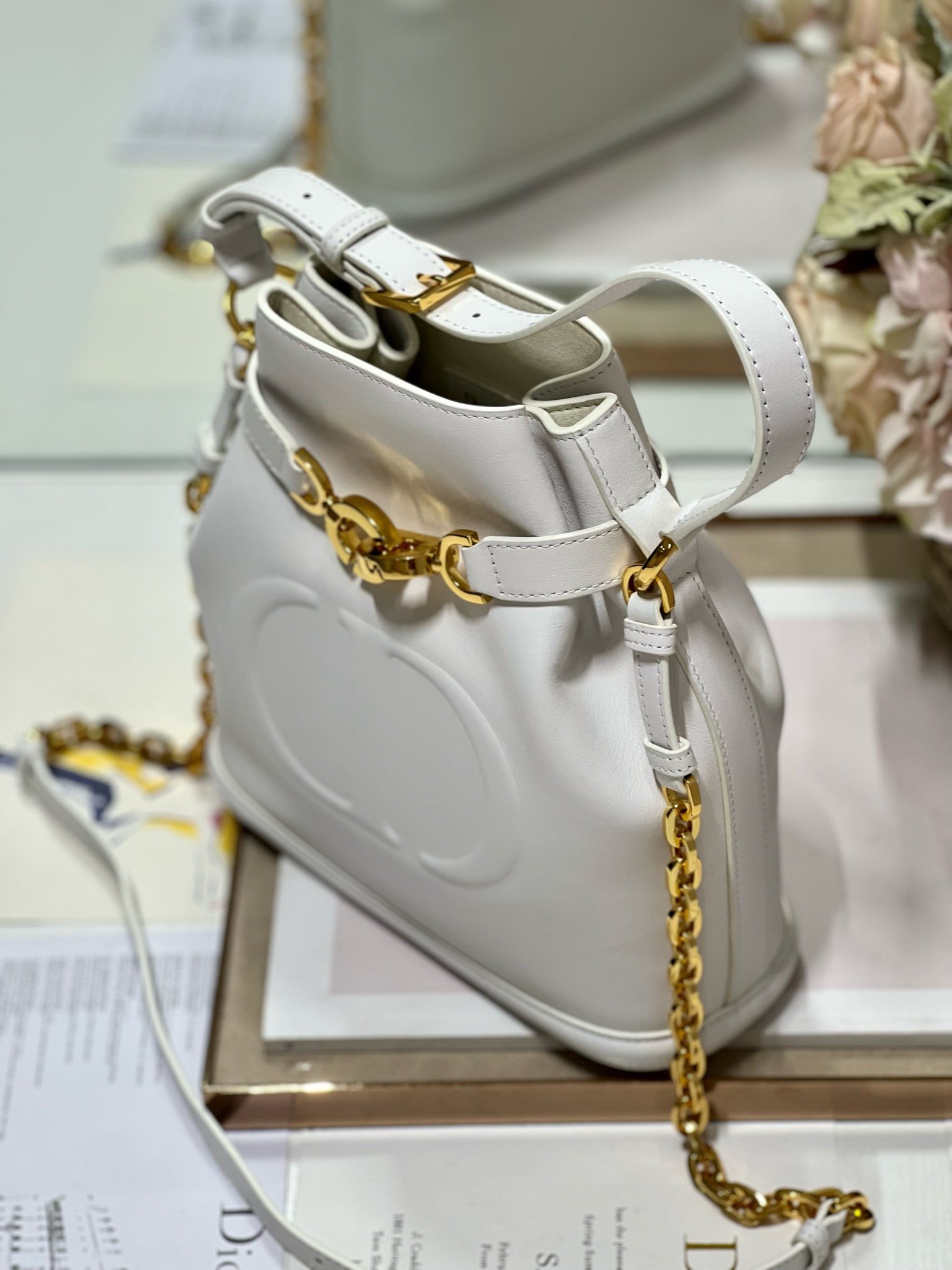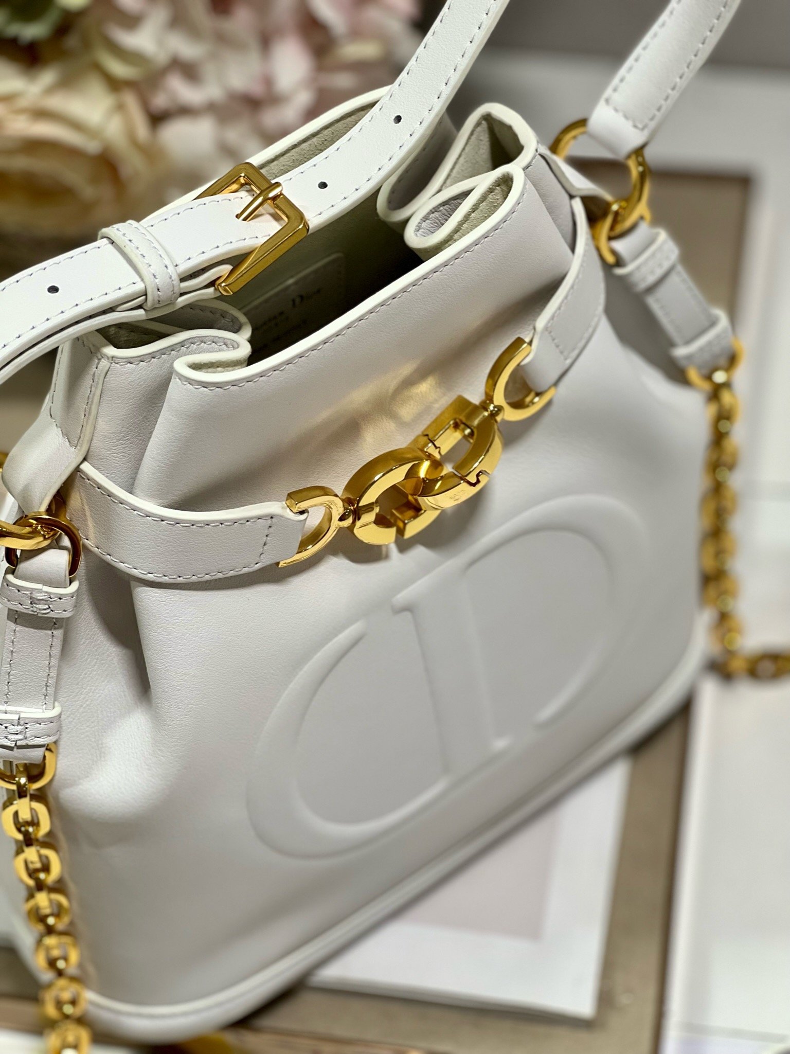 New for Fall 2023, this C’est Dior bag is elegant and timeless. Expertly crafted in white calfskin, it is embossed with the CD signature on the front, a testament to Dior’s savoir-faire. Bucket bag shape with CD Lock closure and knob-shaped letter D, which can safely store all kinds of daily necessities. The petite style features a top handle and an adjustable and detachable chain shoulder strap with leather strap for easy hand-carrying.