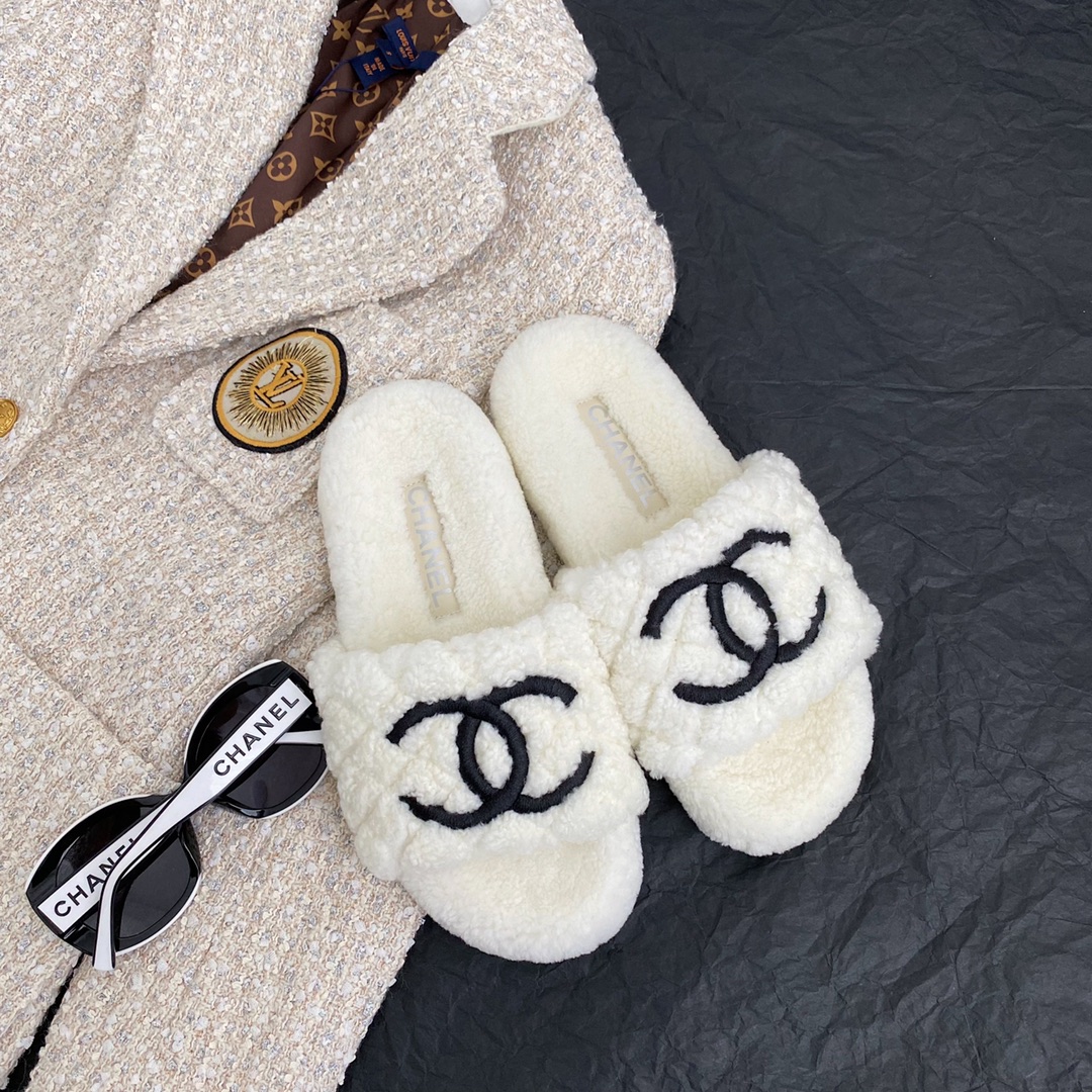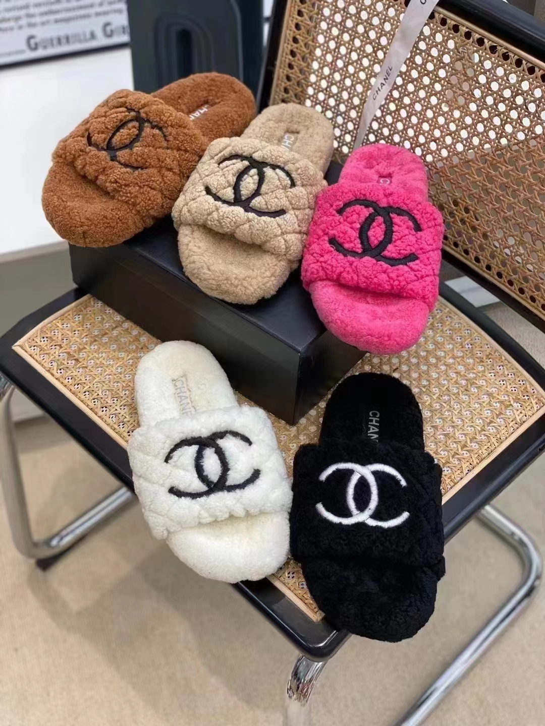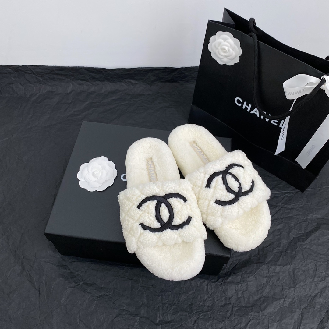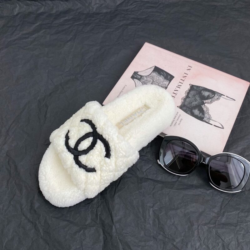 𝗖𝗛𝗔𝗡𝗘𝗟Autumn/Winter New Argyle Second-hand Hair Drag The shoe upper is embellished with fabric electric embroidery color logo, which is exquisitely presented~ Comfortable and elegant means full of visual sense ~ lady-level fashion items! Lamb curl fabric, original rubber outsole Top quality 35-40