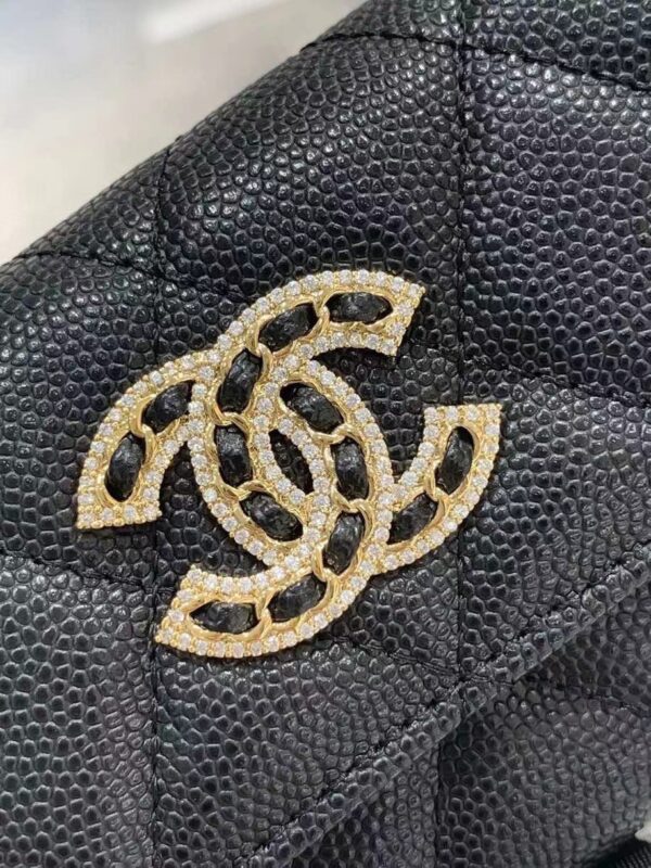 Purely handcrafted full diamond double 𝖼 buckle shining 𝖻𝗅𝗂𝗇𝗀𝖻𝗅𝗂𝗇𝗀 effect. Caviar cowhide leather wears a chain