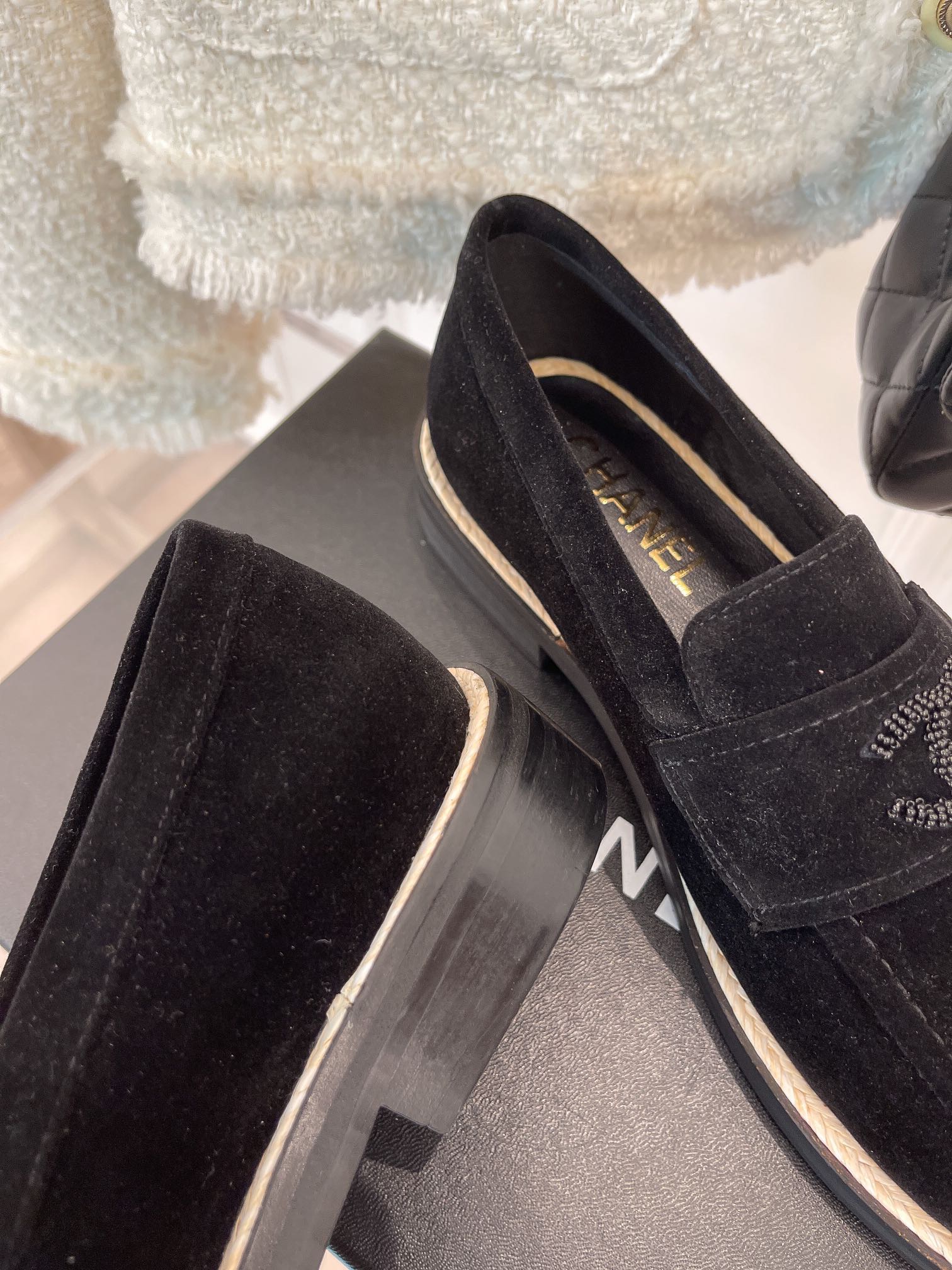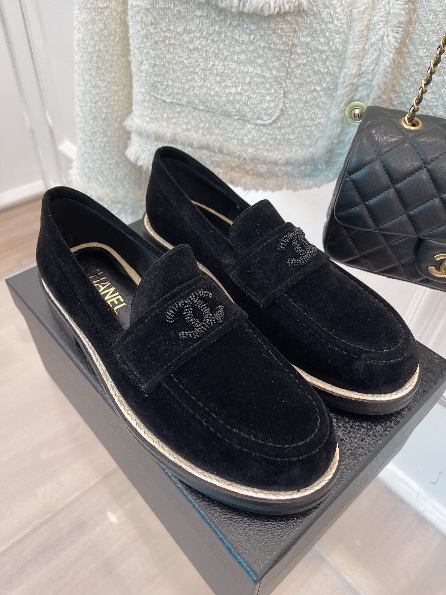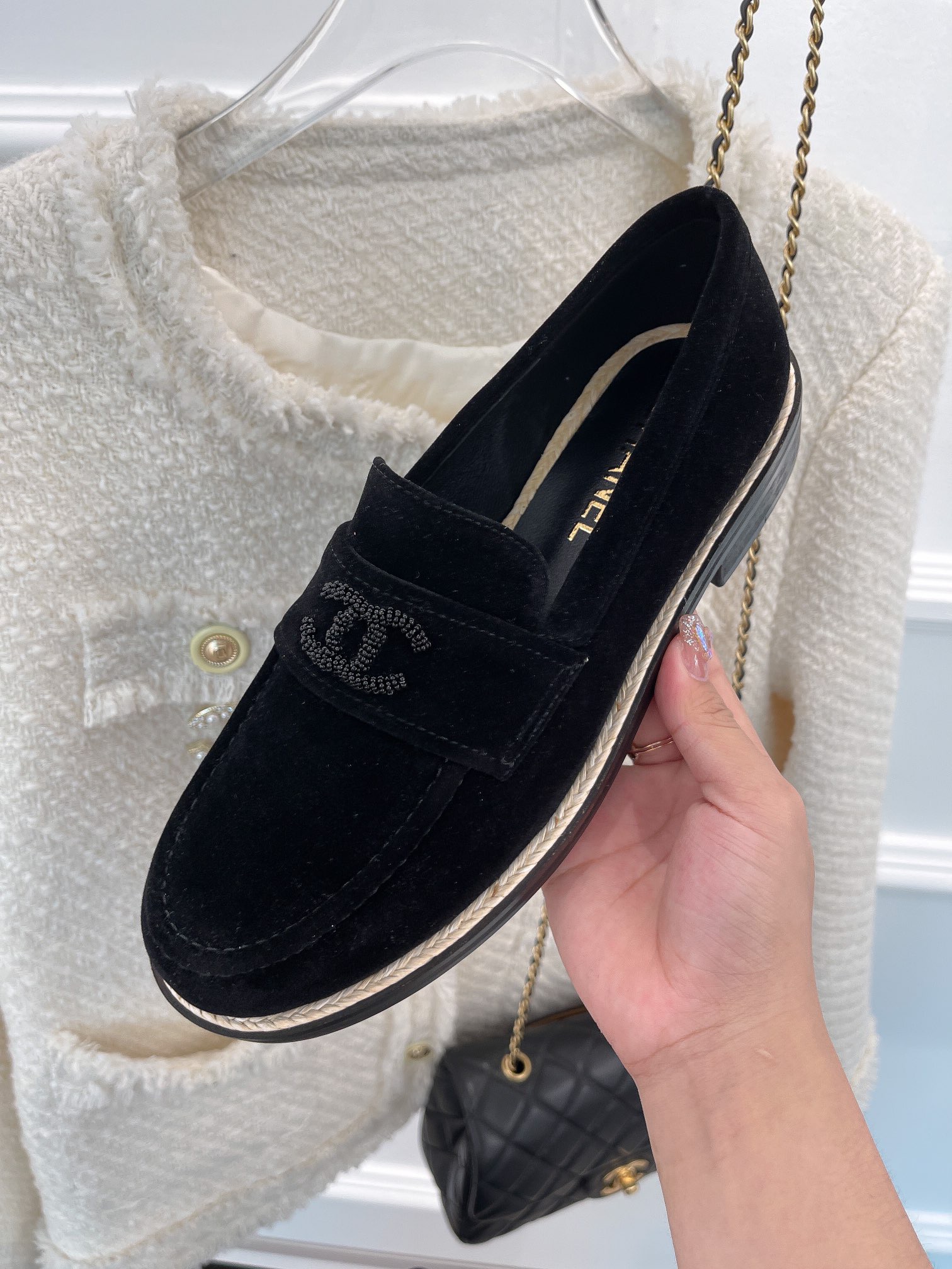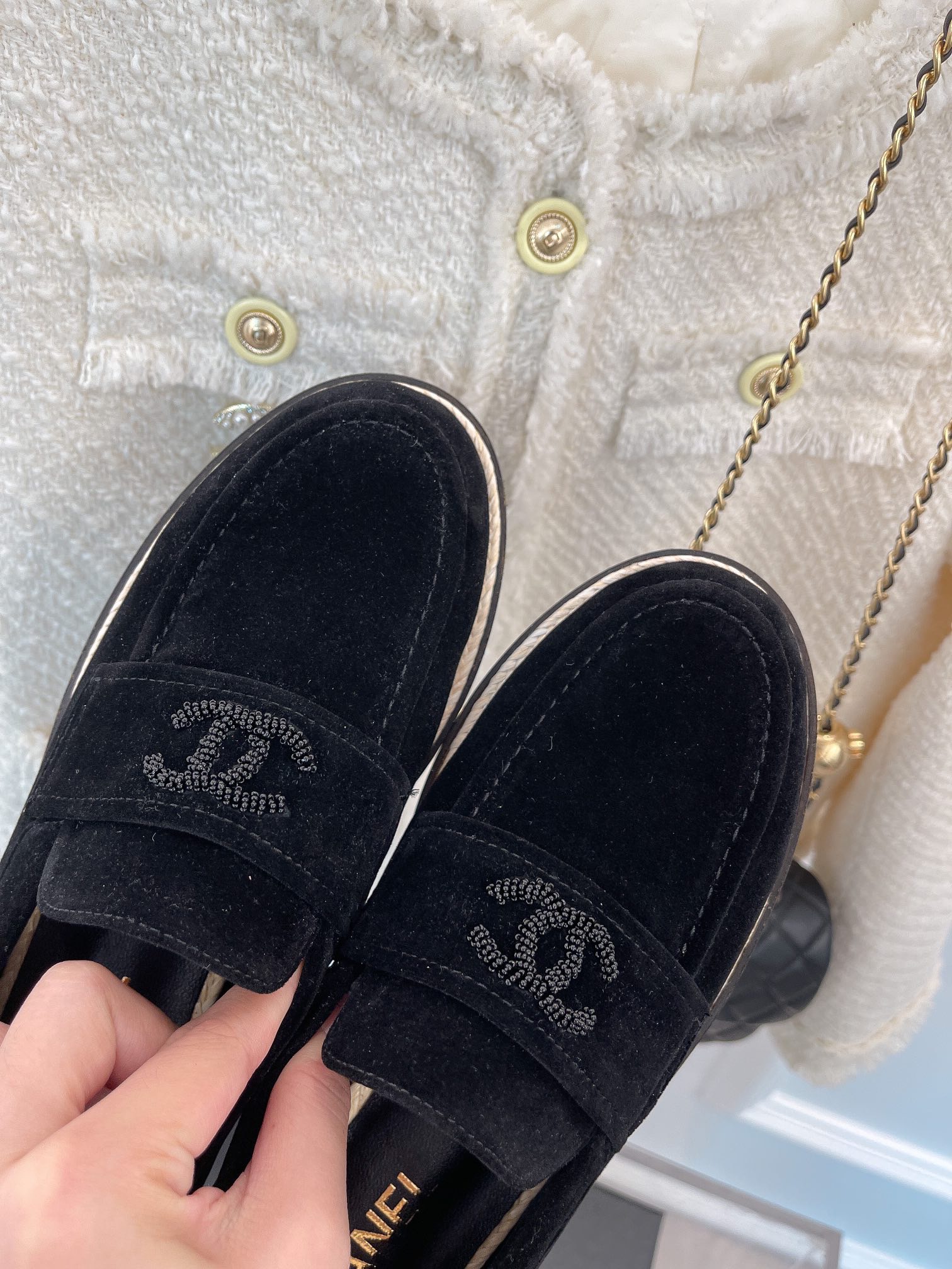 CHANEL 𝟐𝟎𝟐𝟐/𝐒𝐒 𝐧𝐞𝐰 new spring and summer fisherman velvet loafers_______________________________ This season’s velvet loafers are really beautiful, and the hand-beaded double C is the core theme. Full of sense of luxury. The upper feet are good-looking and comfortable, and they are invincible with skirts and pants.………………………………………………Material:❶ Upper: original custom imported velvet❷Foot: mixed sheepskin❸Accessories: hand-beaded double C❹Heel height: 3cm❺ Outsole: Italian imported cowhide outsole Woven grass border❻ Sizes: 35-39 (40/41 customized)