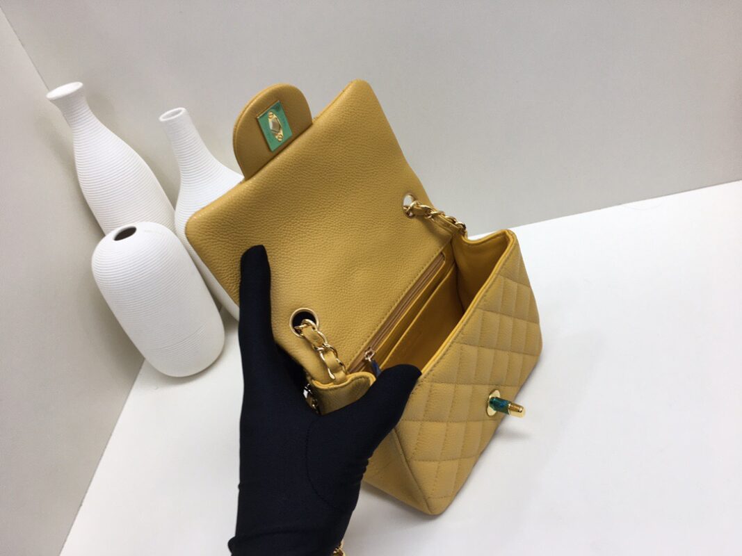 Chanel Classic Flap Calfskin Caviar leather. All copper hardware. Mango Yellow. Gold Buckle 17cm