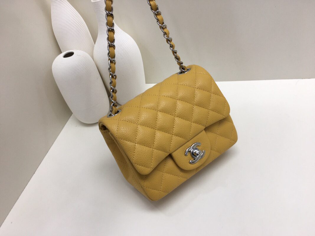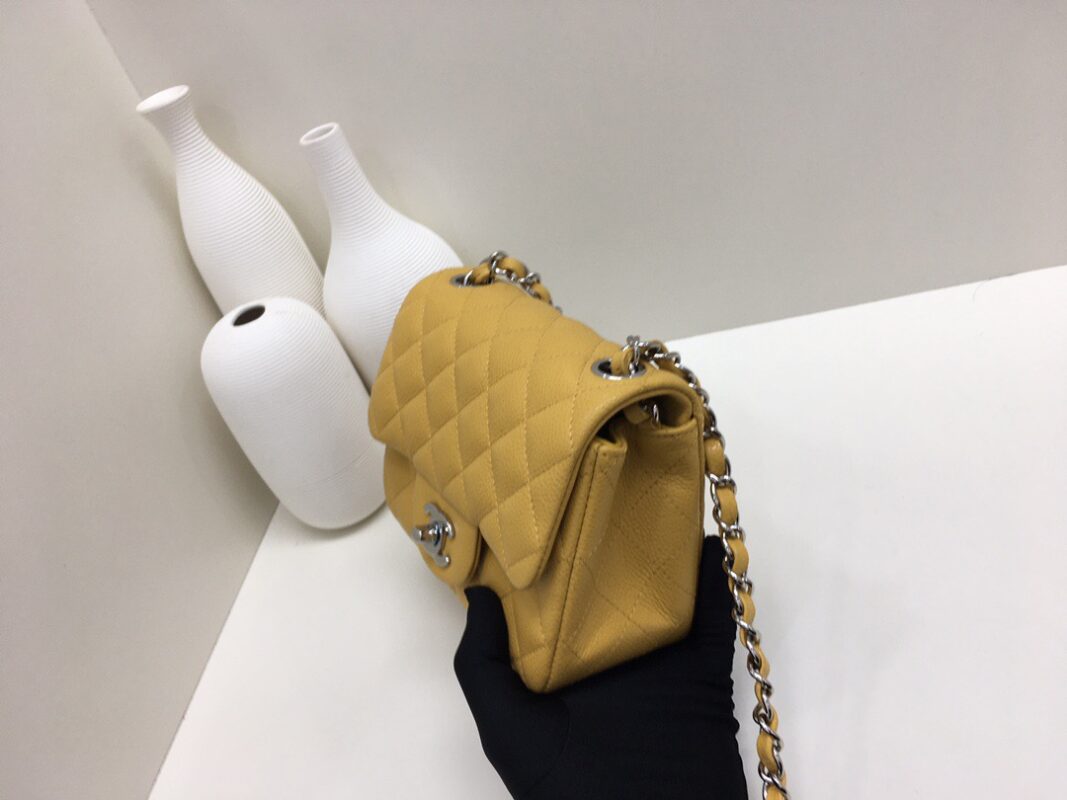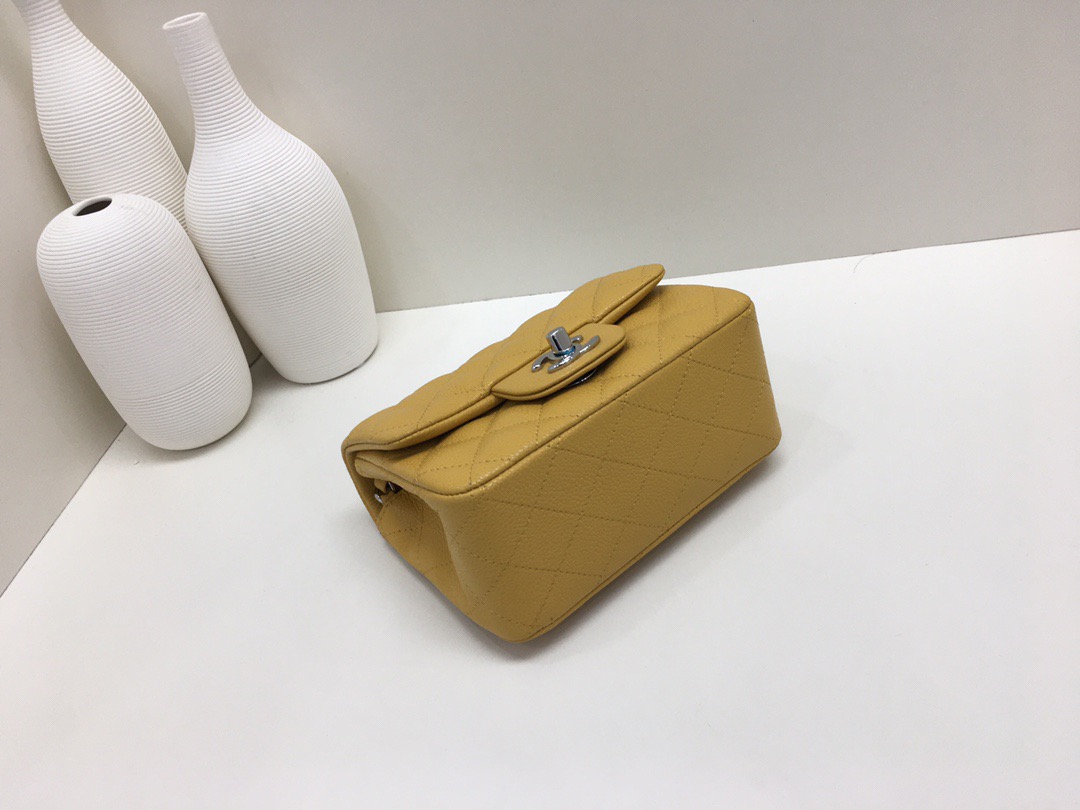 Chanel Classic Flap Calfskin Caviar leather. Full Copper Hardware. Mango Yellow. Silver Buckle 17cm