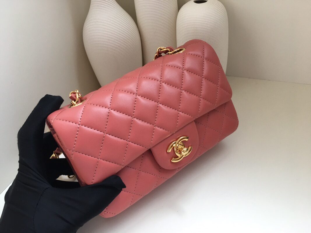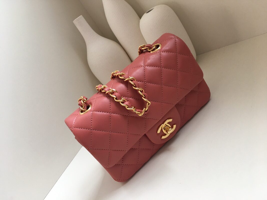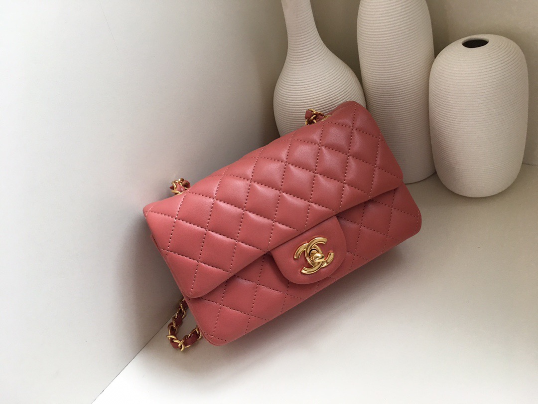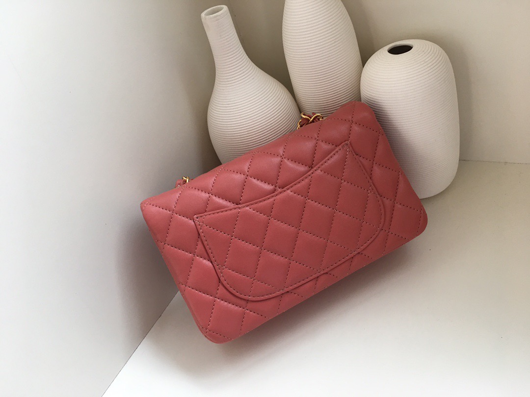 Chanel Classic Flap Lambskin. All copper hardware. New mini. Bean Paste Pink. Gold Buckle 20cm