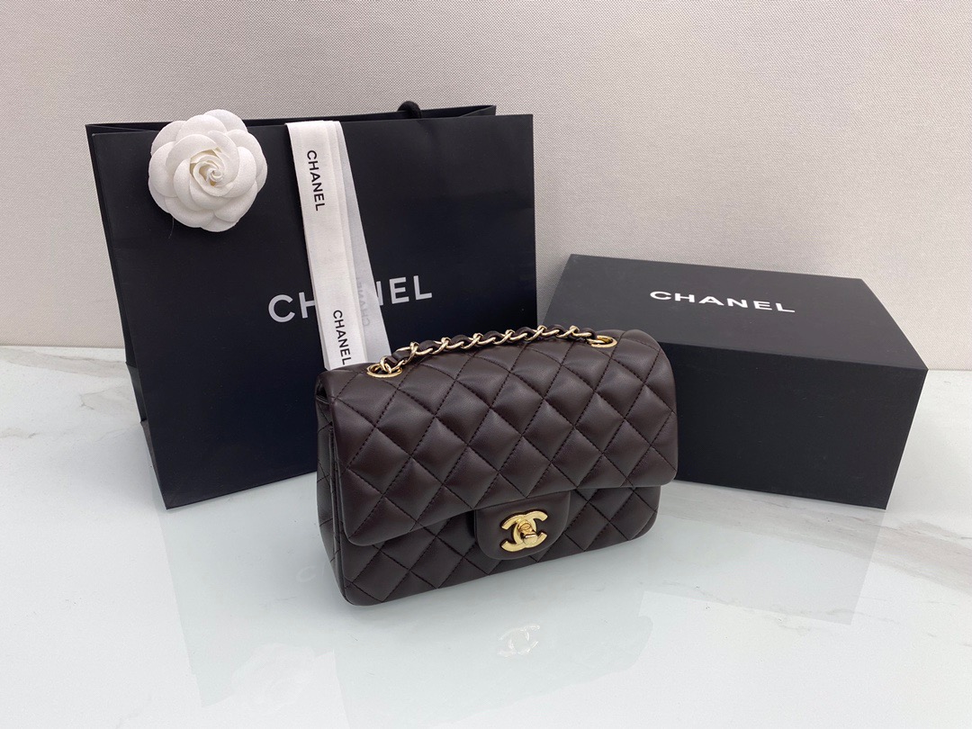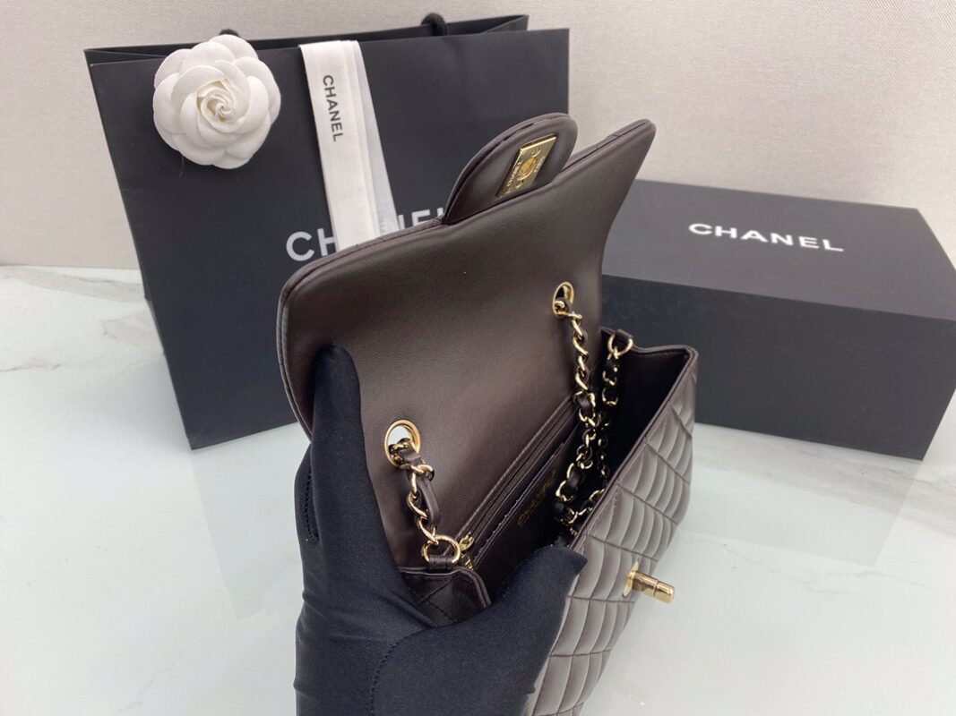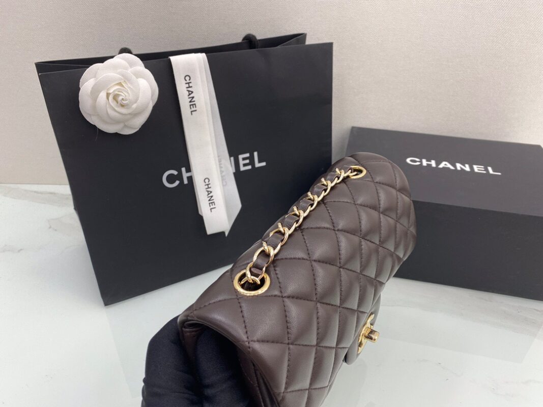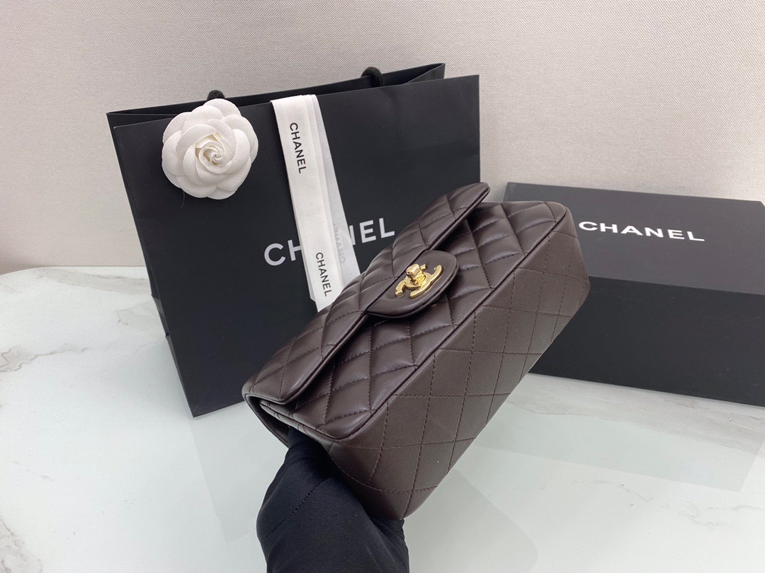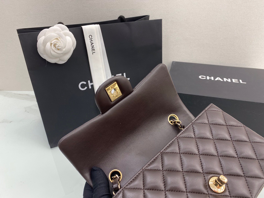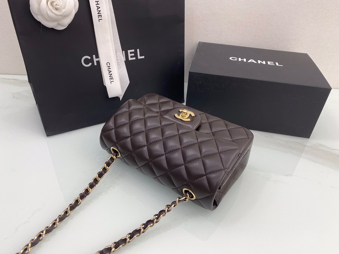 Chanel Classic Flap New Chocolate Color. Imported lambskin. Full copper hardware. 20cm