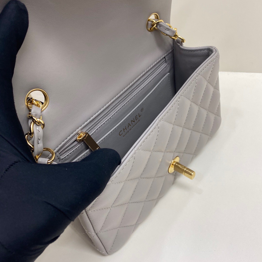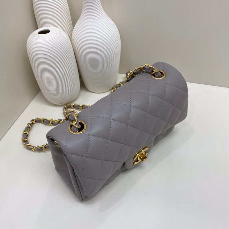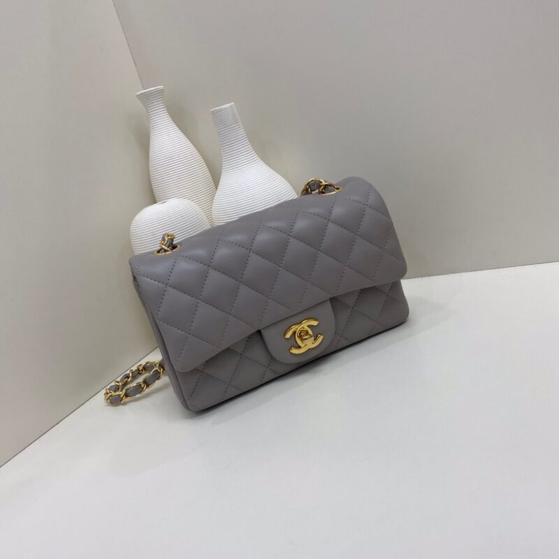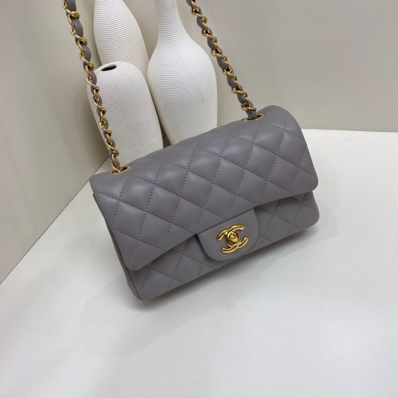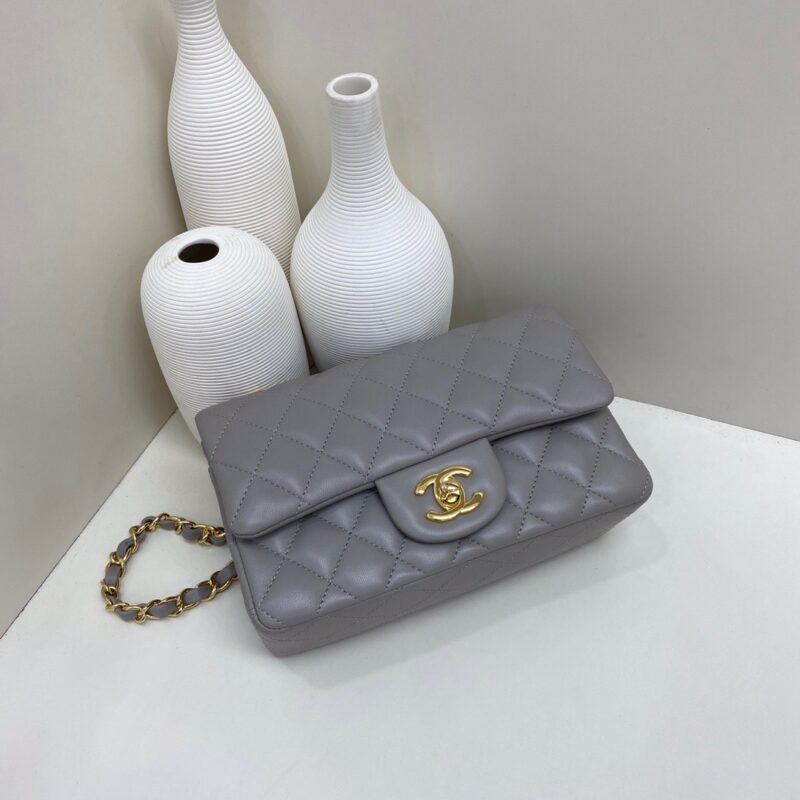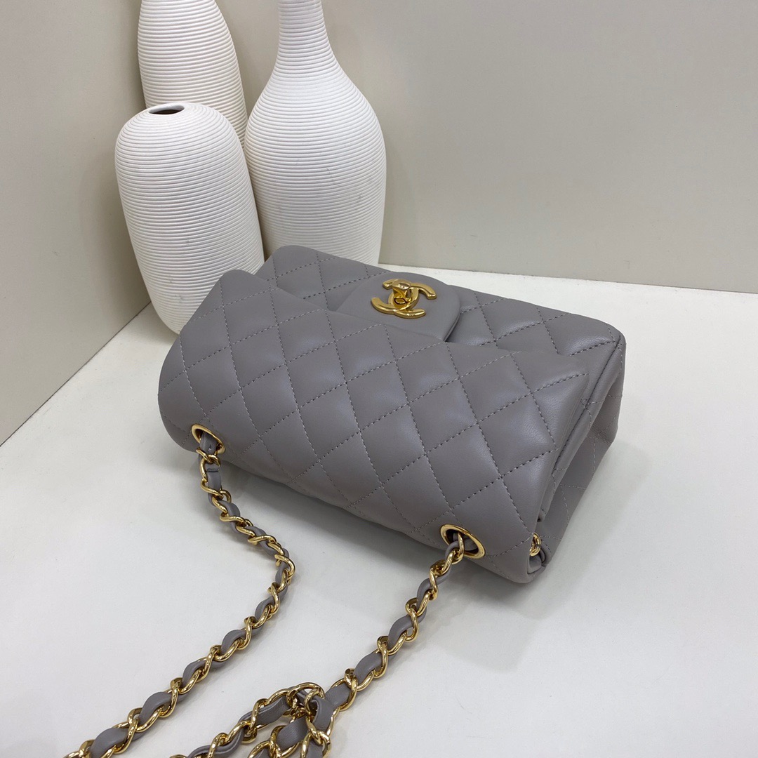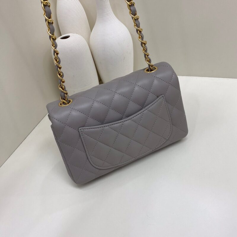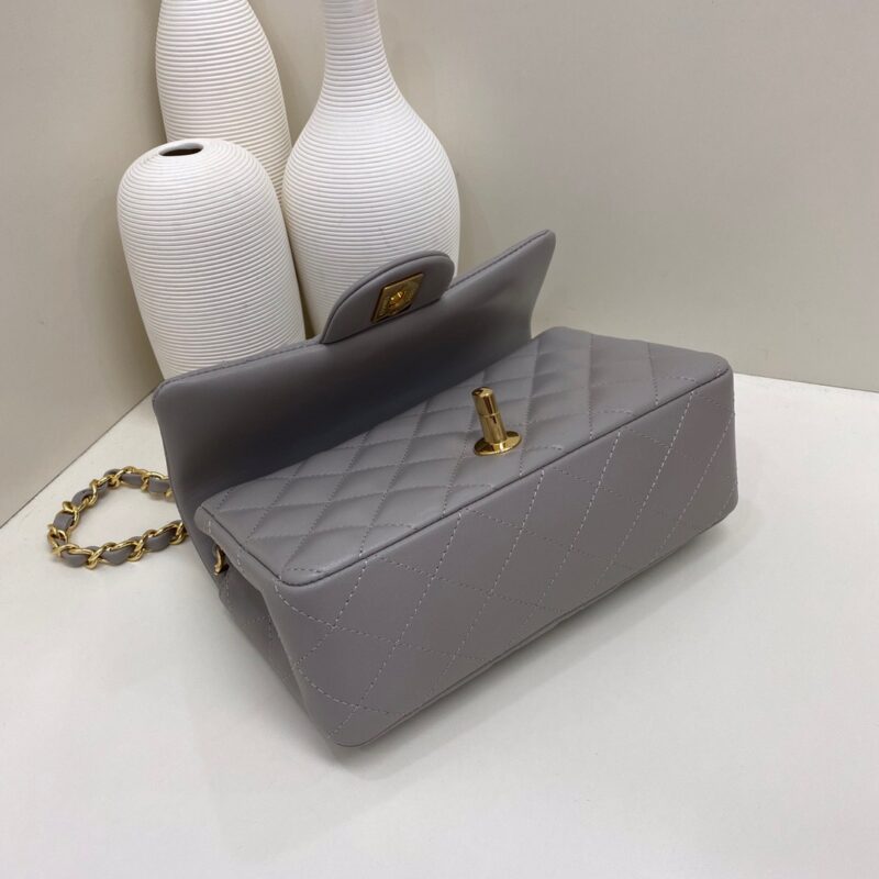 Chanel Classic Flap Imported lambskin. All copper hardware. Grey. Gold Buckle 20cm