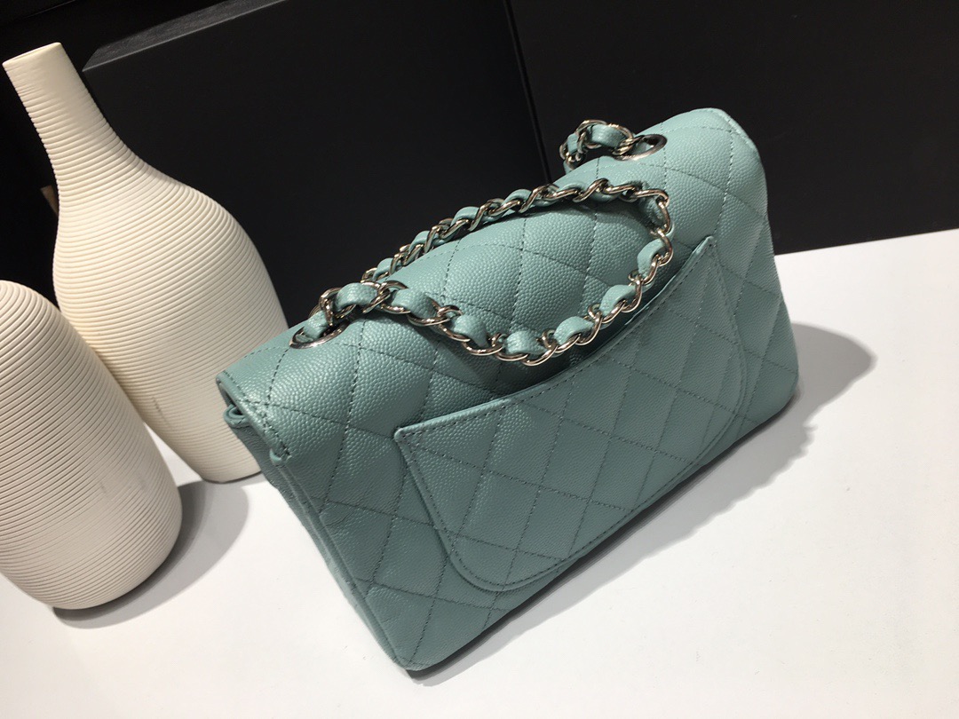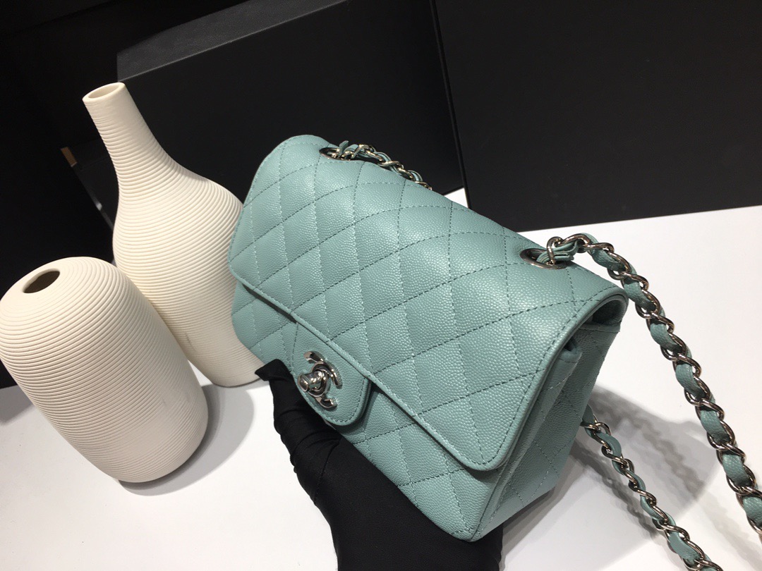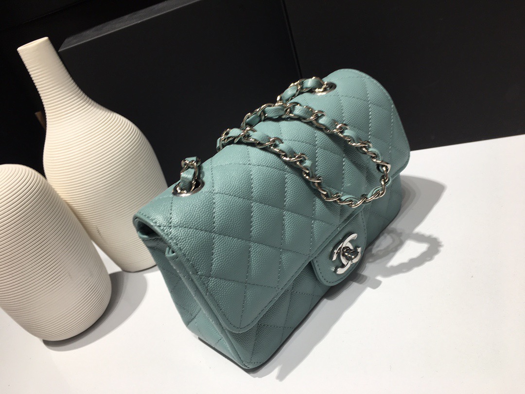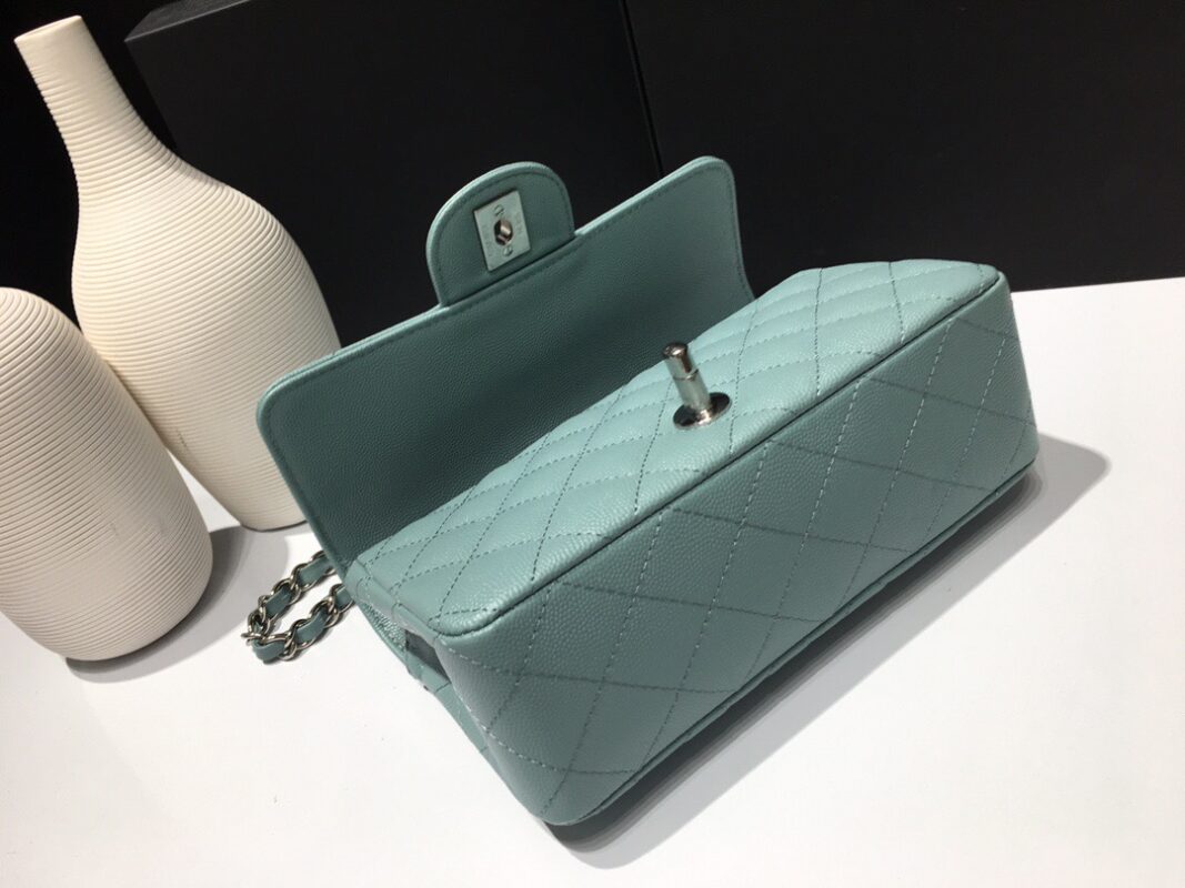 Chanel Classic Flap Mini size Calfskin caviar leather. Pearl ball pattern. All copper hardware. Haze Blue 20cm