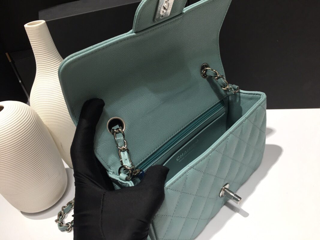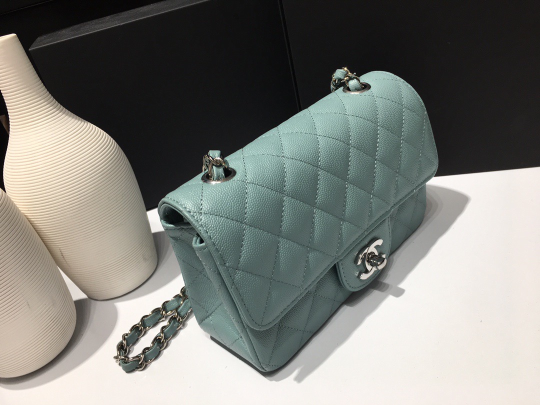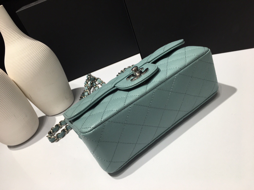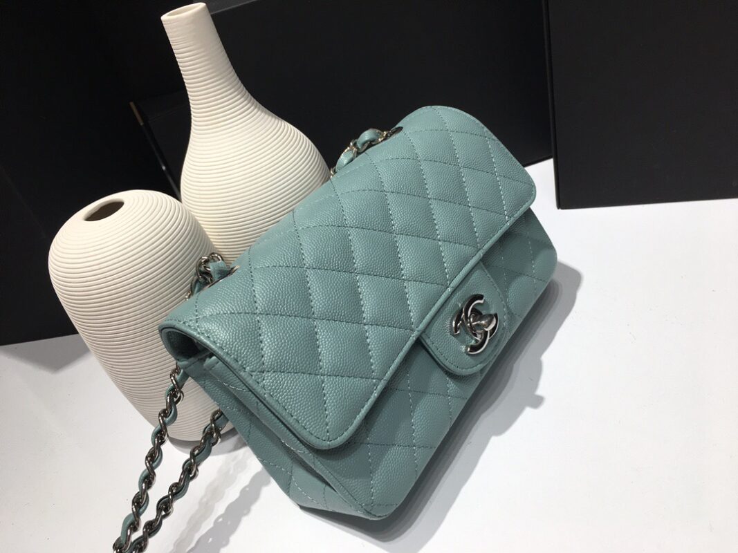 Chanel Classic Flap Mini size Calfskin caviar leather. Pearl ball pattern. All copper hardware. Haze Blue 20cm