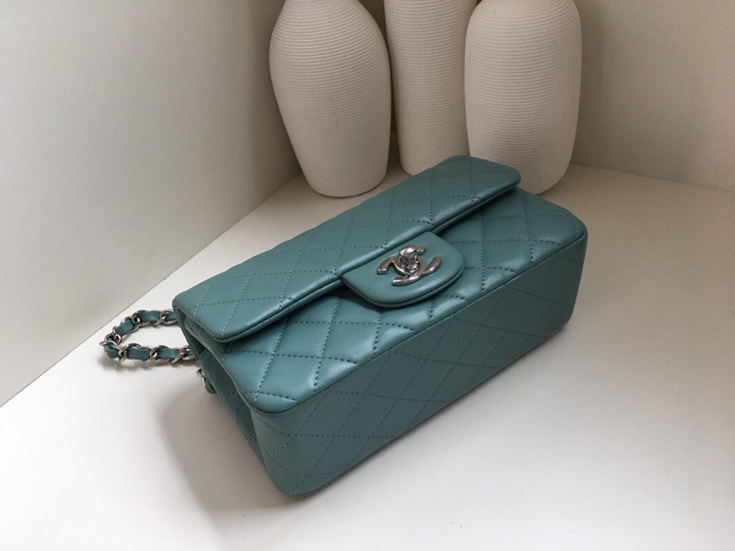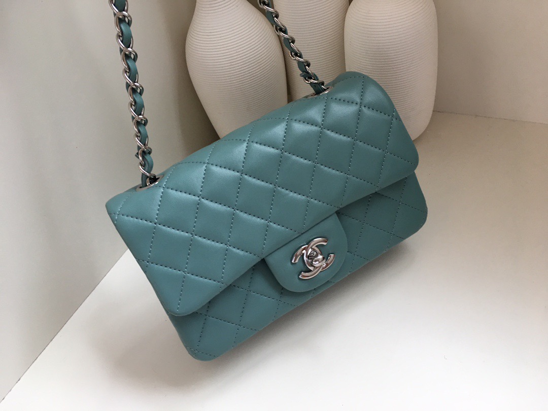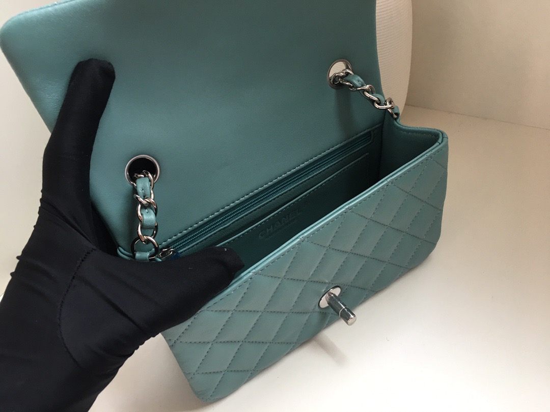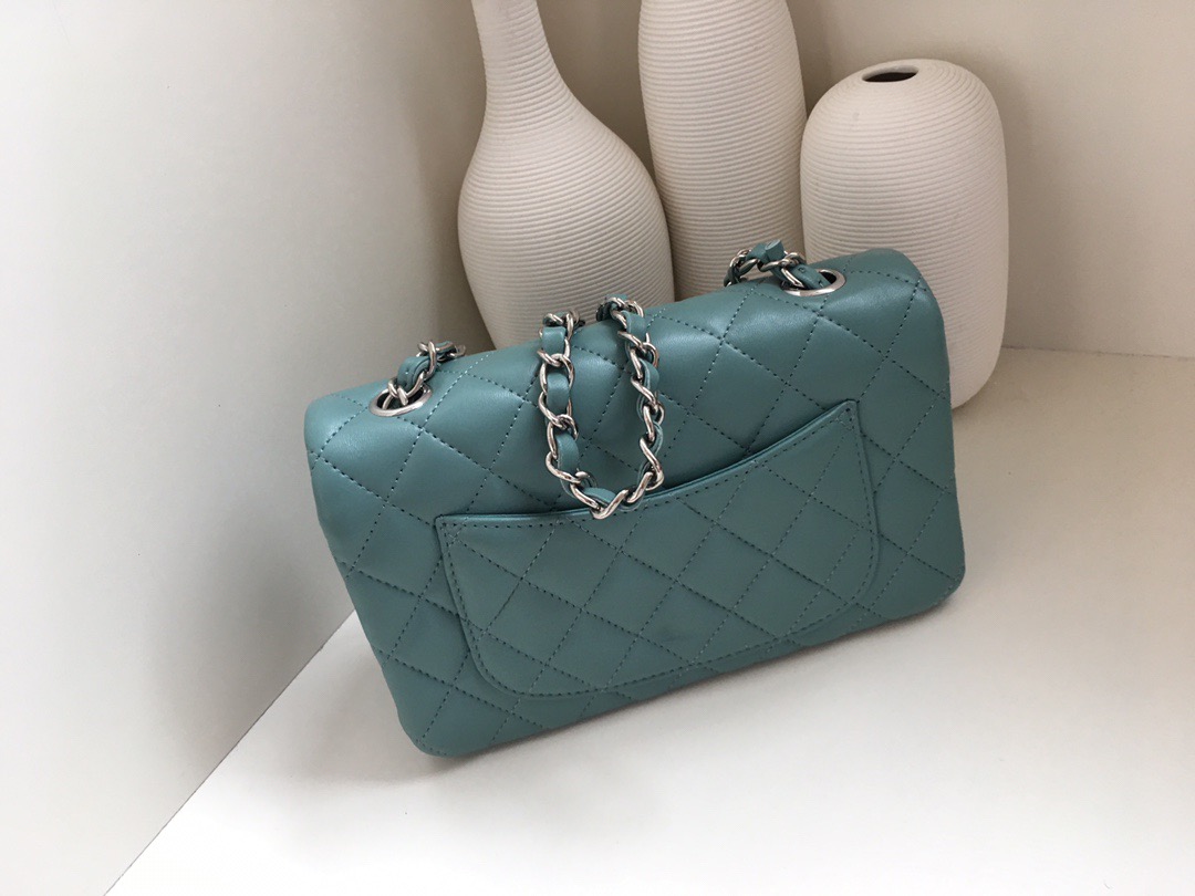 Chanel Classic Flap Lambskin. All copper hardware. New mini. Haze Blue. Silver Buckle 20cm