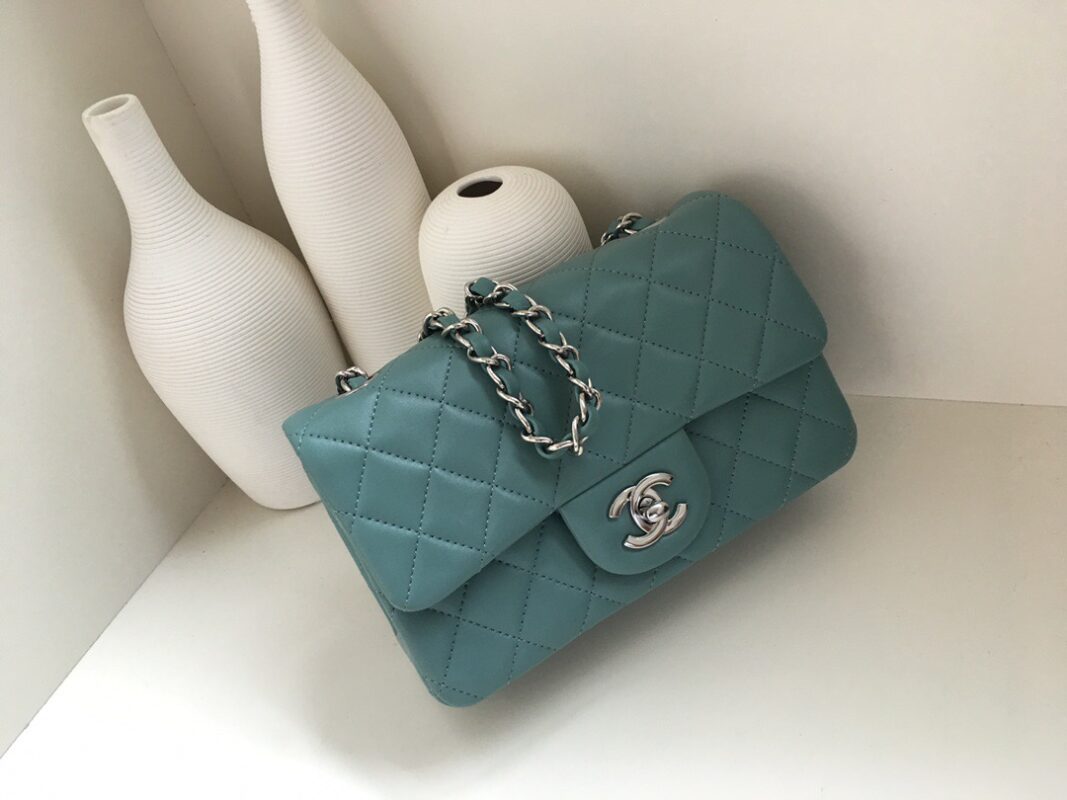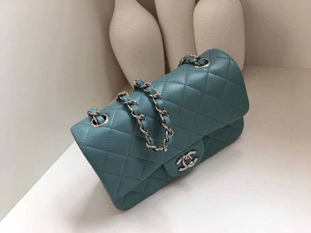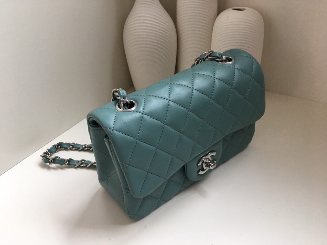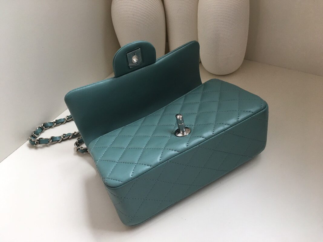 Chanel Classic Flap Lambskin. All copper hardware. New mini. Haze Blue. Silver Buckle 20cm