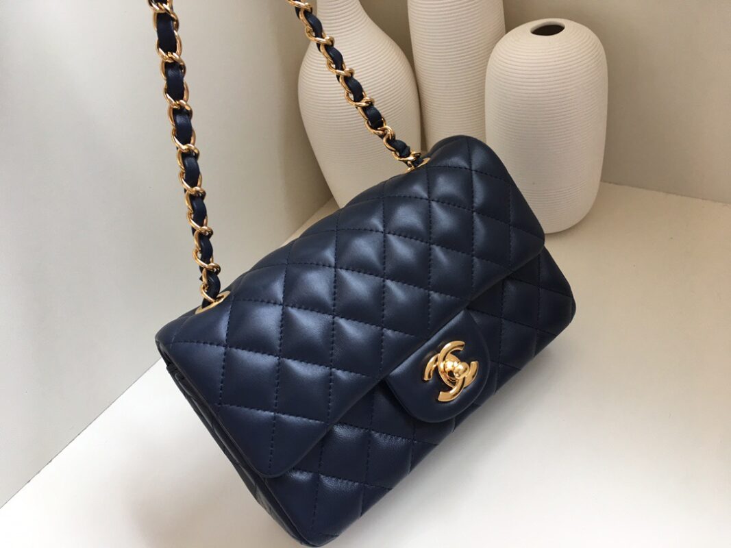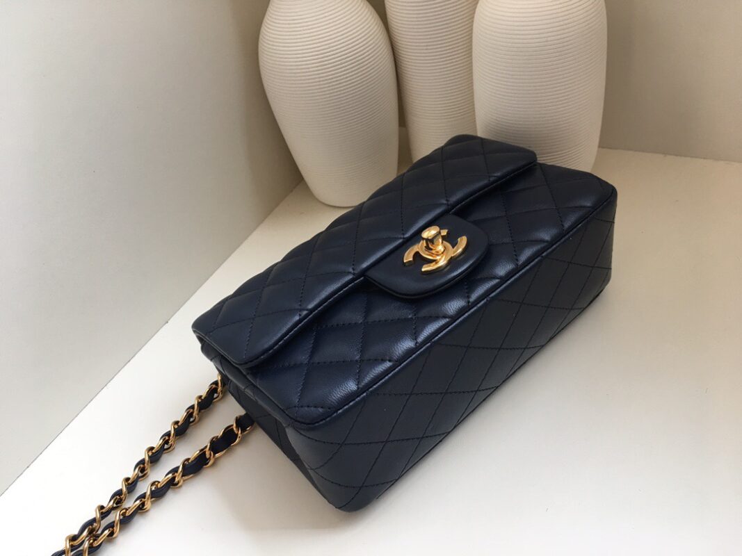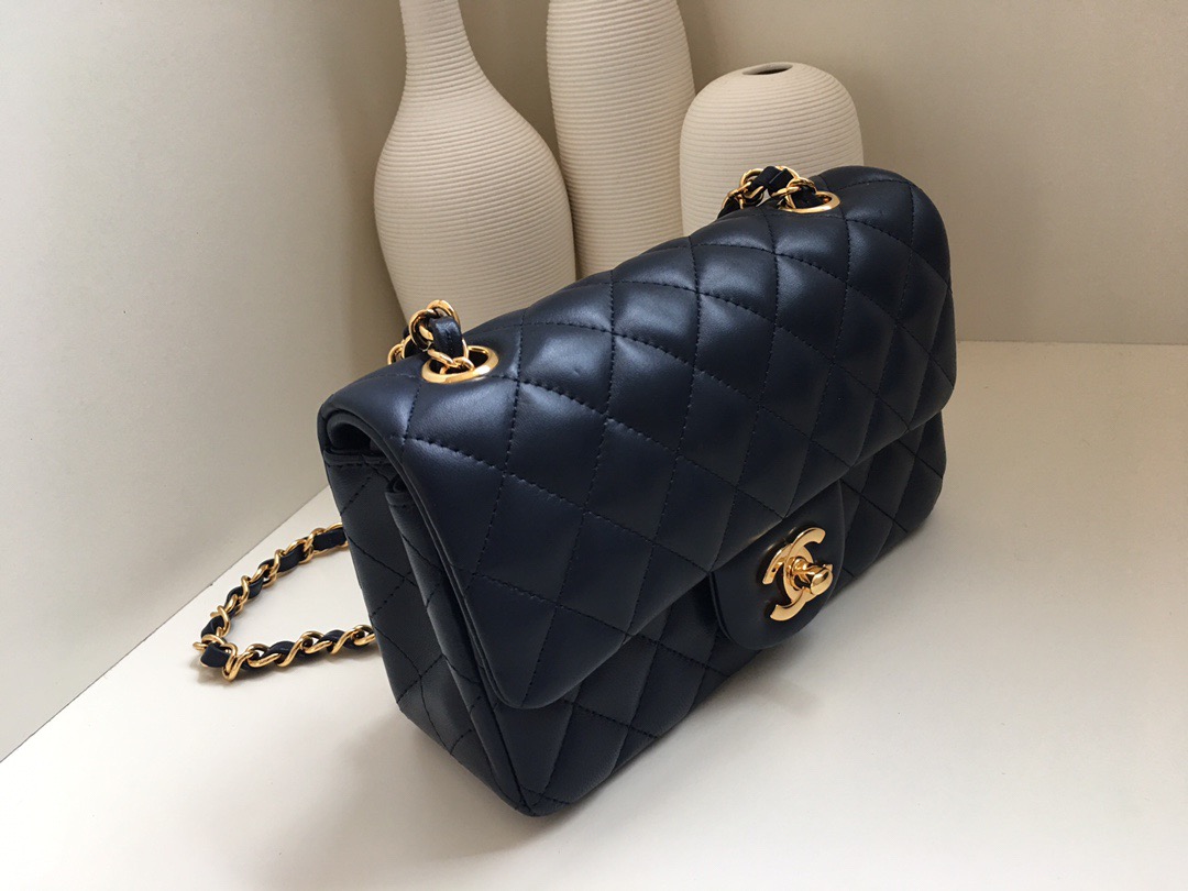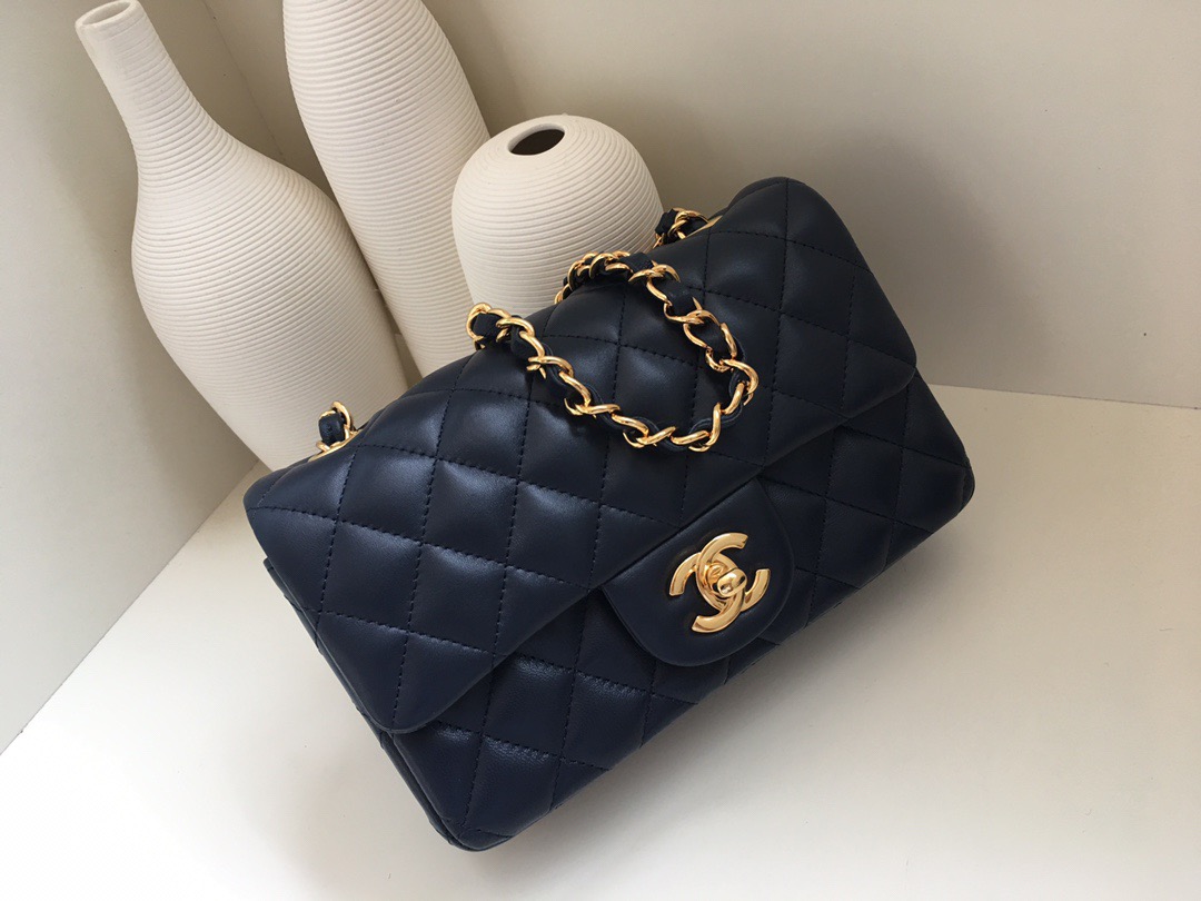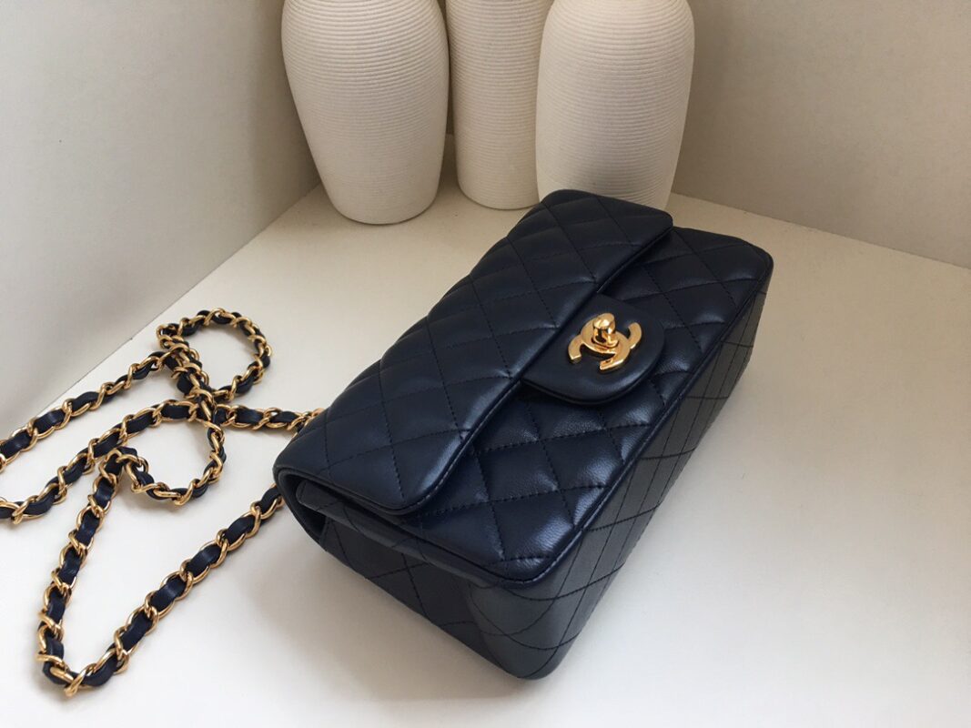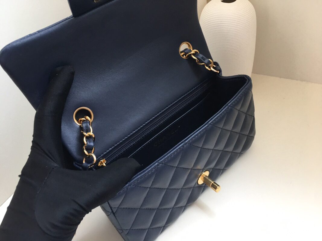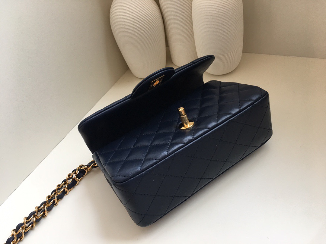 Chanel Classic Flap Lambskin. Full copper hardware. New mini. Navy Blue. Gold Buckle 20cm