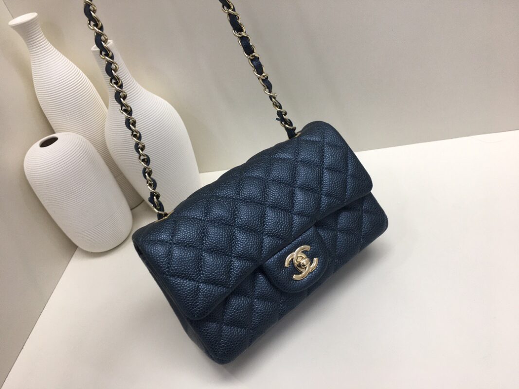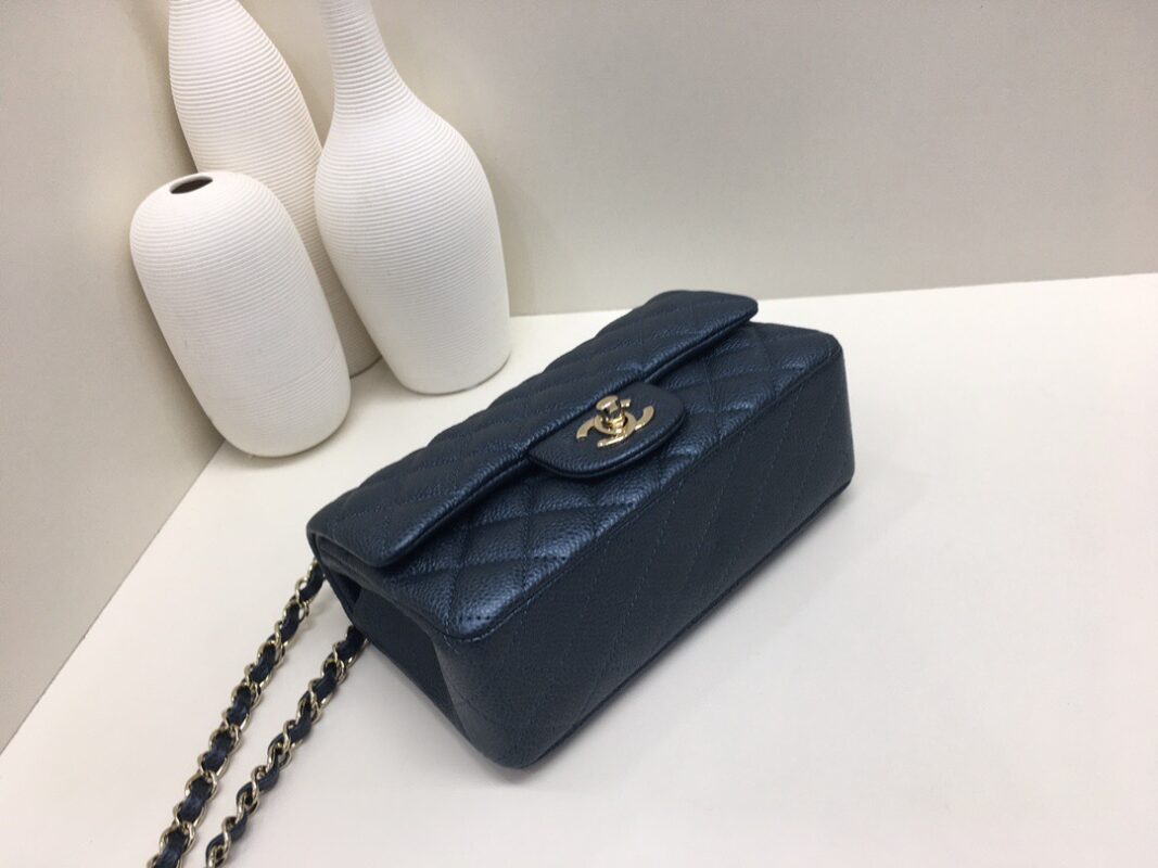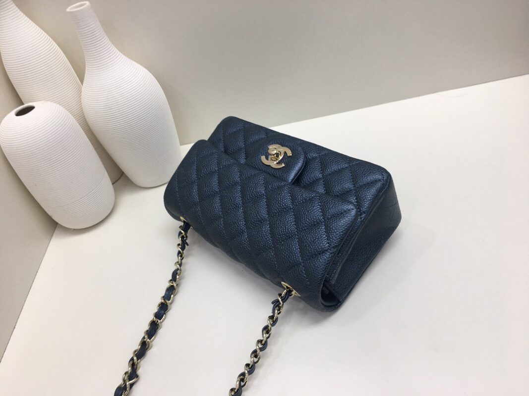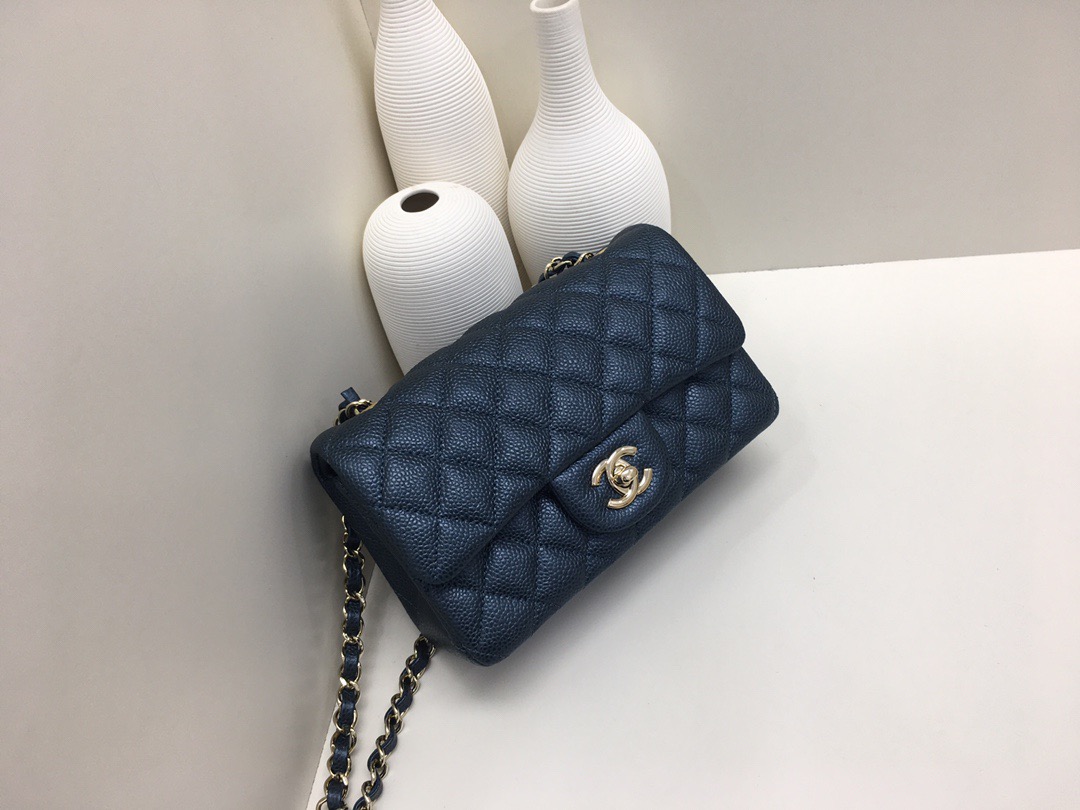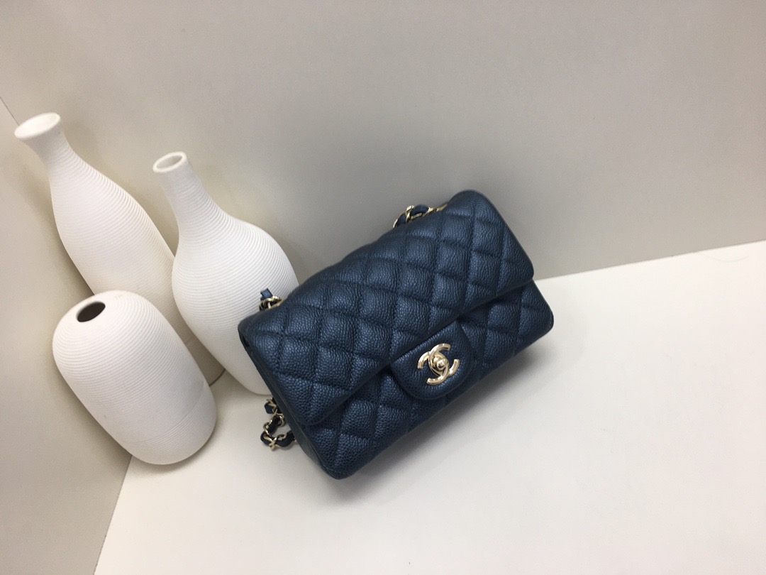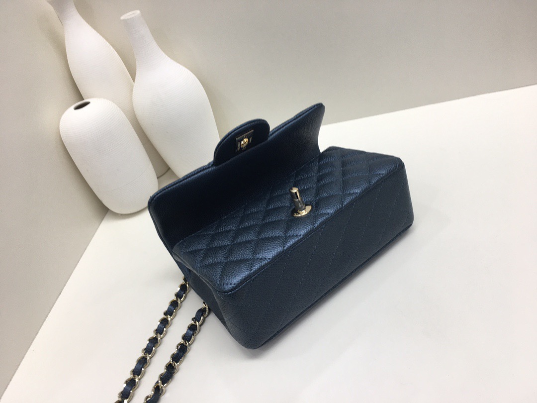 Chanel Classic Flap Calfskin caviar leather. Pearl ball pattern. All copper hardware. Pearl Blue. Gold Buckle 20cm