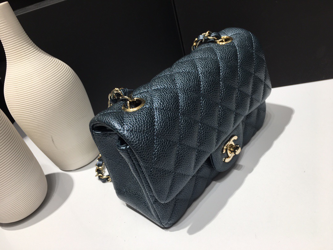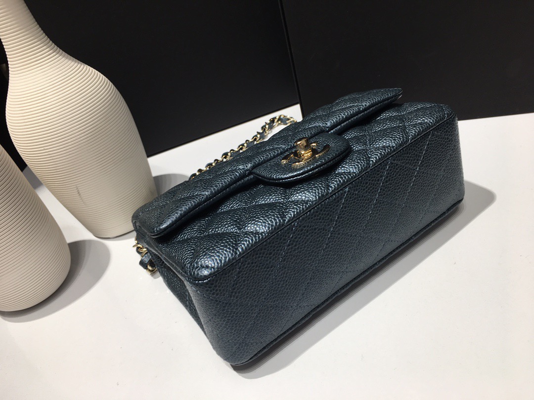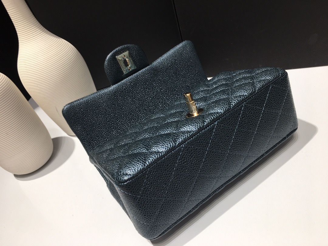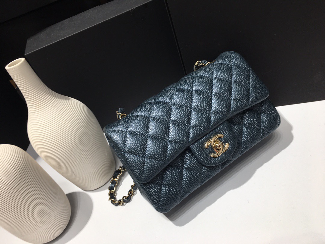 Chanel Classic Flap Mini size Calfskin caviar leather. Pearl ball pattern. All copper hardware. Pearl Blue 20cm