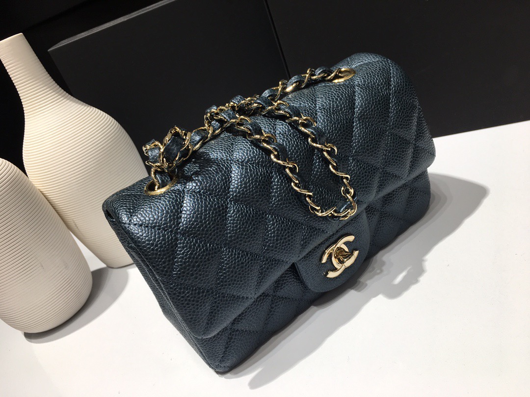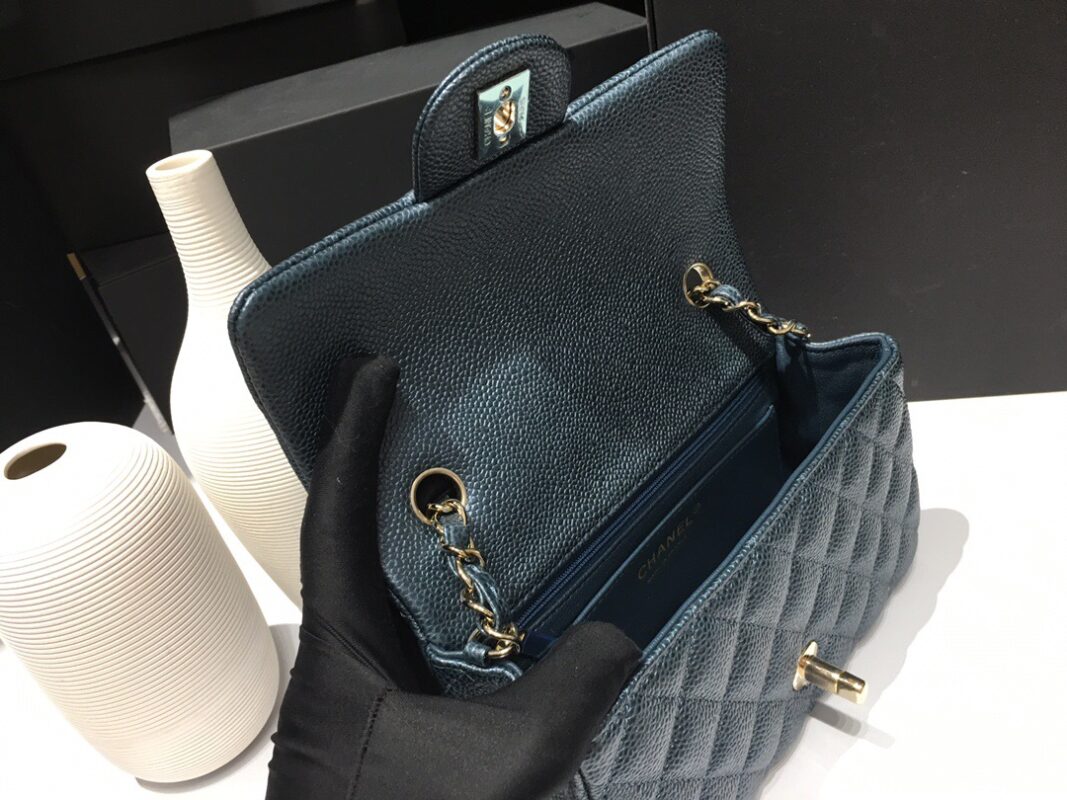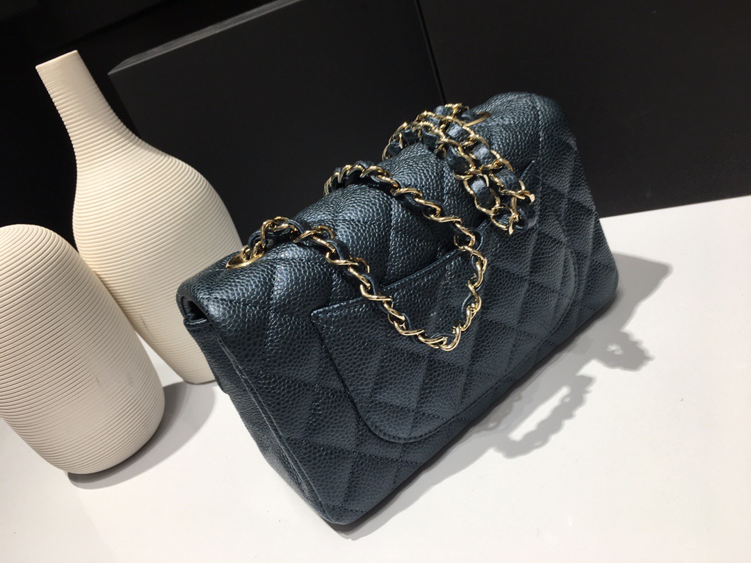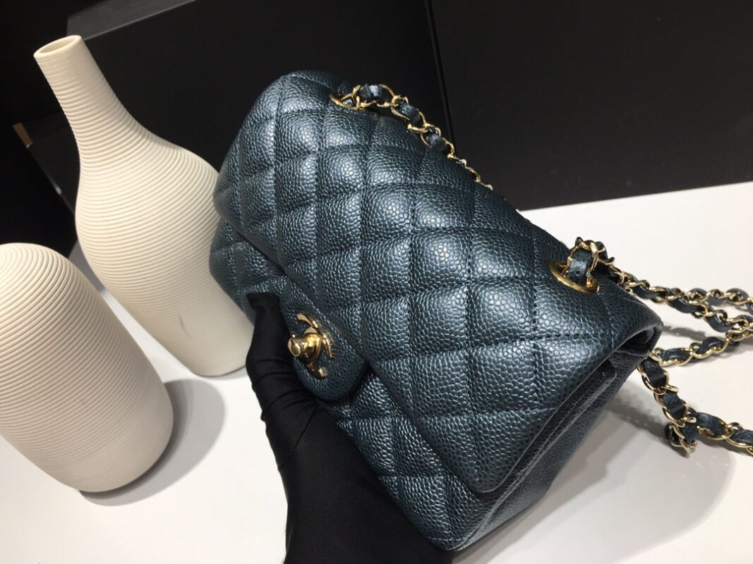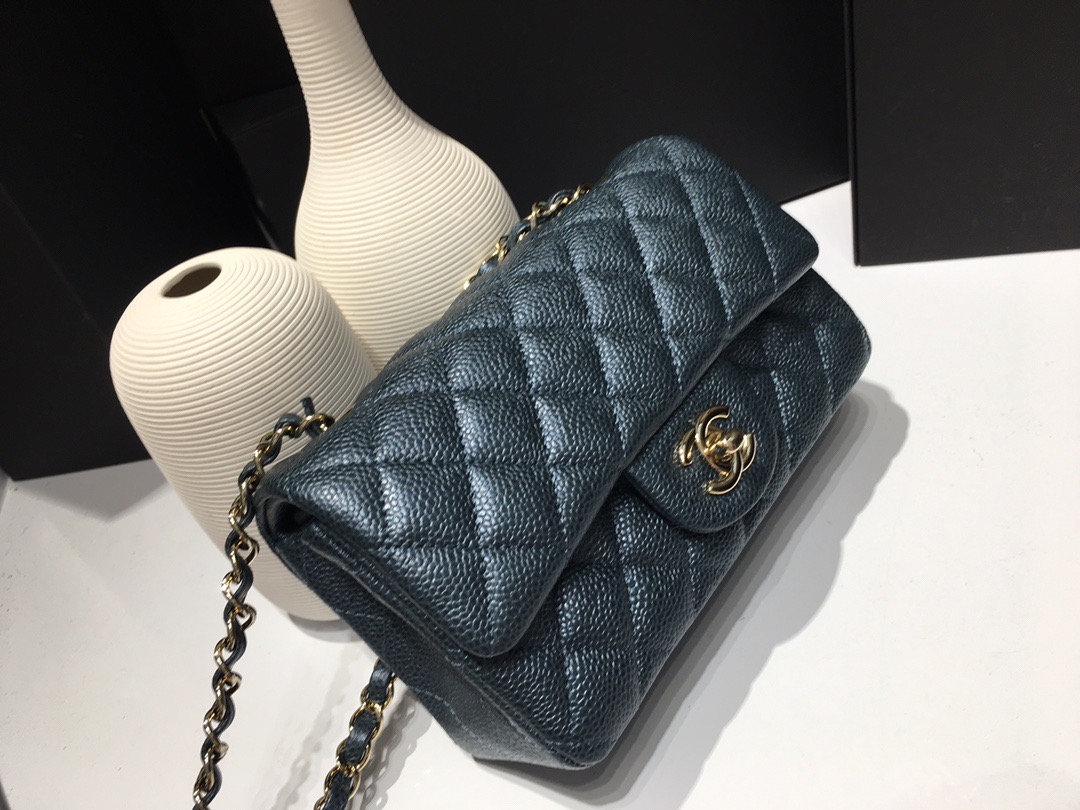 Chanel Classic Flap Mini size Calfskin caviar leather. Pearl ball pattern. All copper hardware. Pearl Blue 20cm
