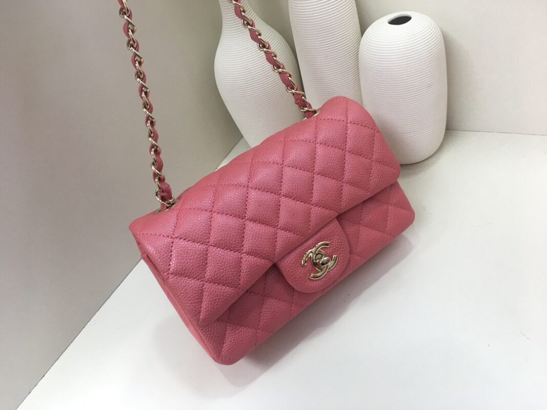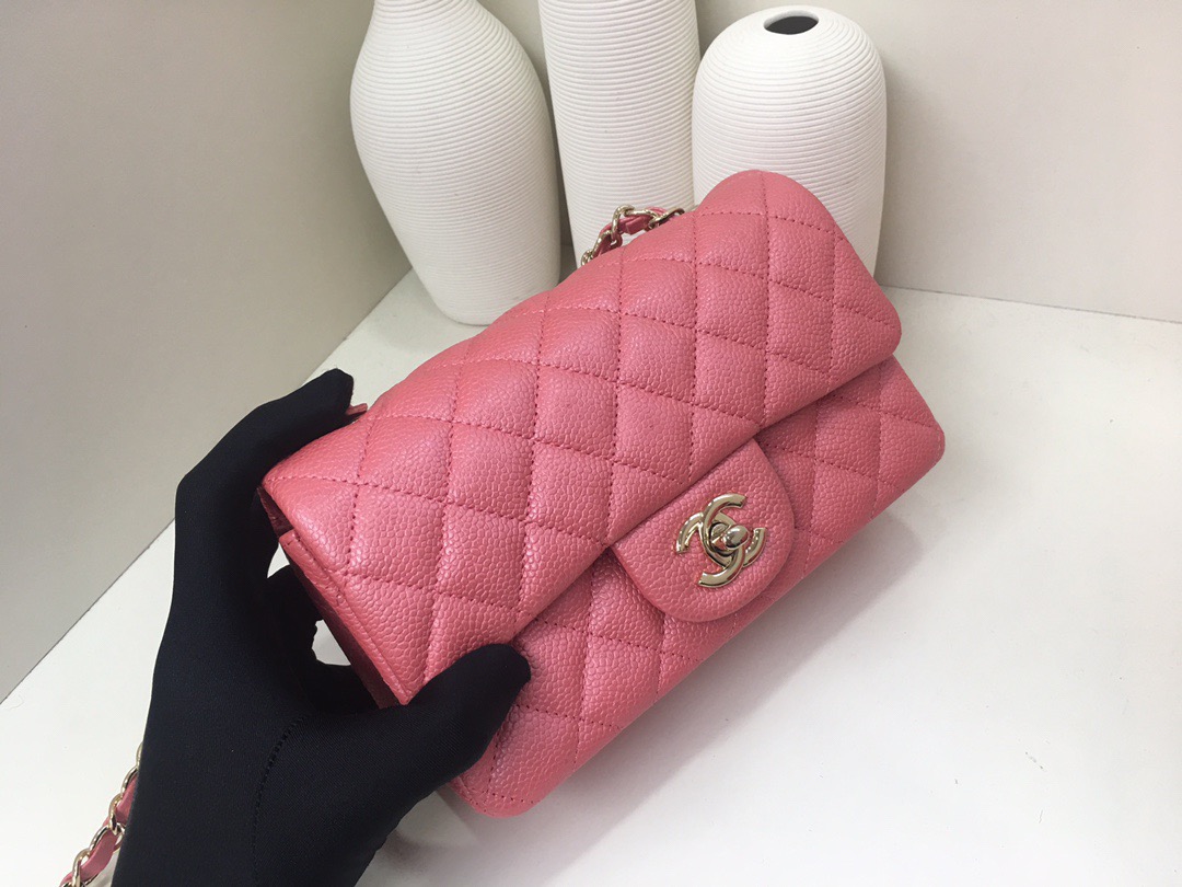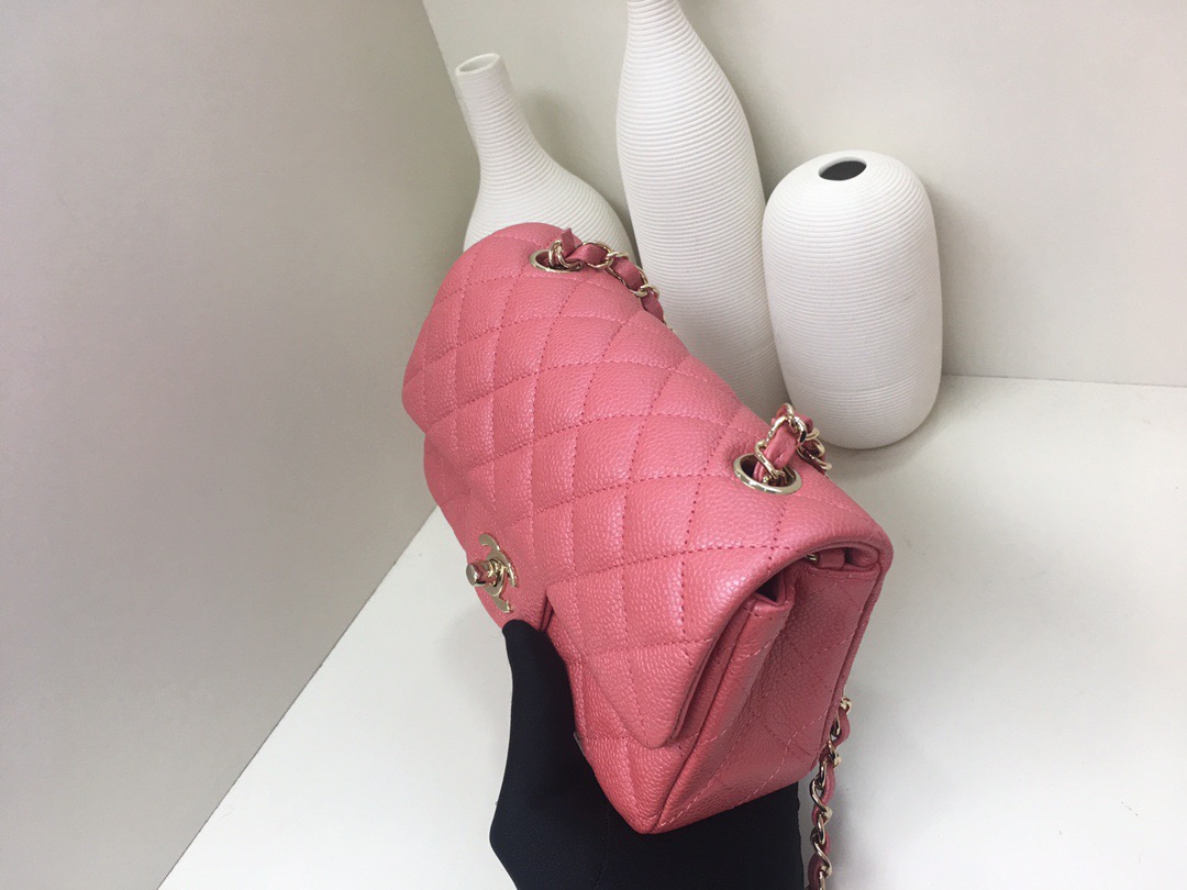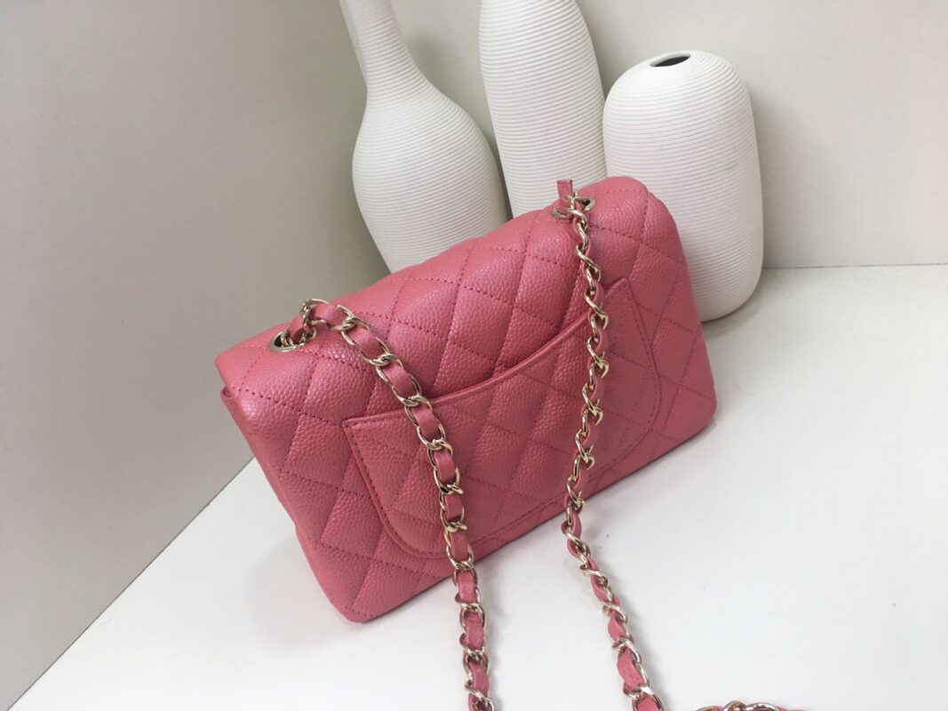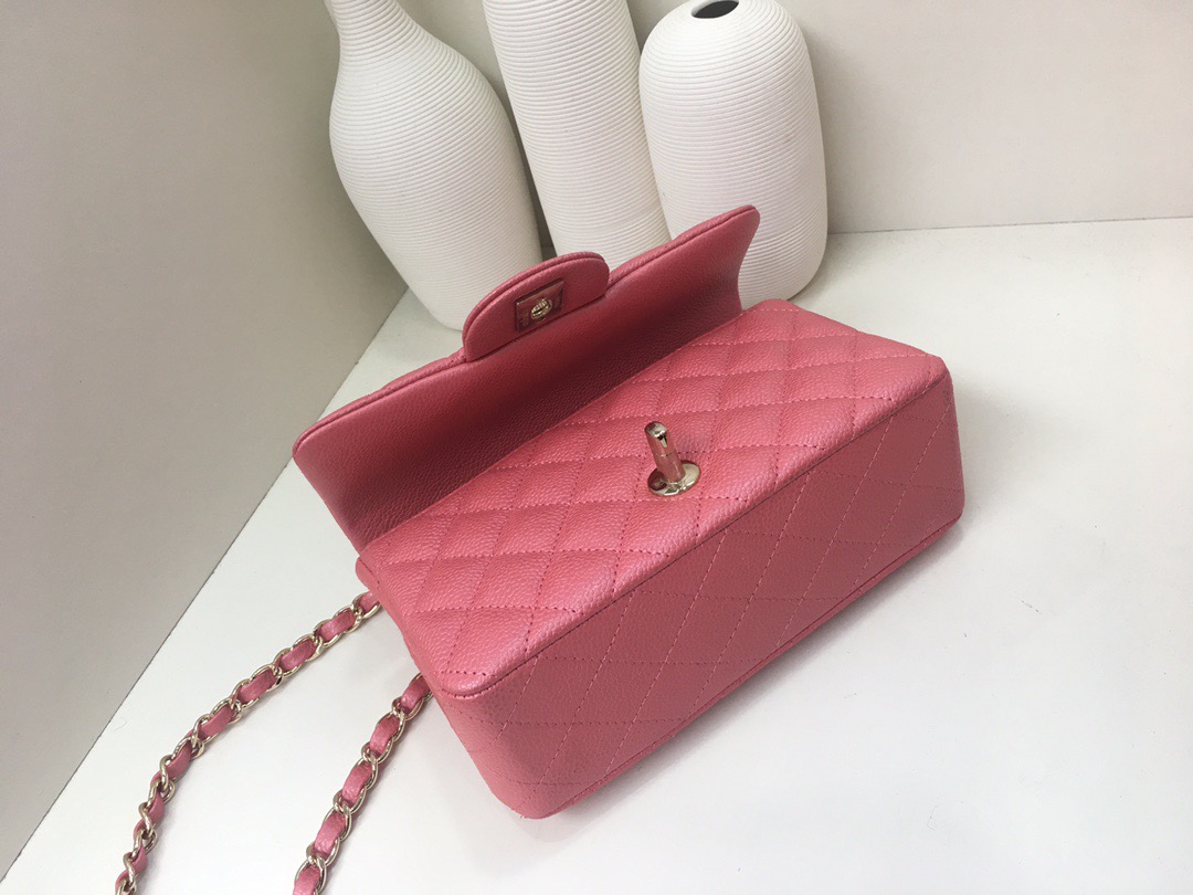 Chanel Classic Flap Calfskin caviar leather. Pearl ball pattern. All copper hardware. Gold Buckle. Pearl Pink 20cm