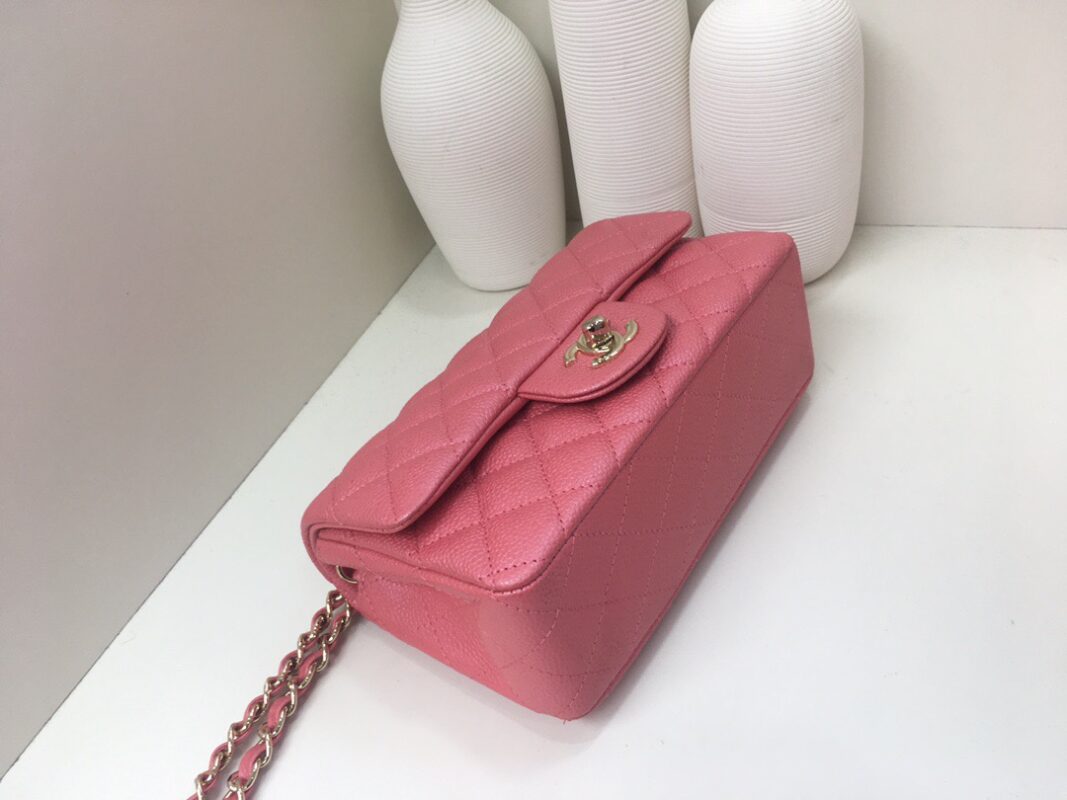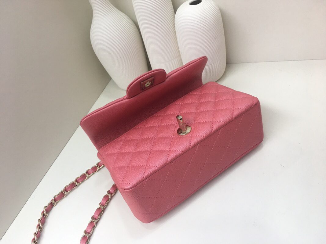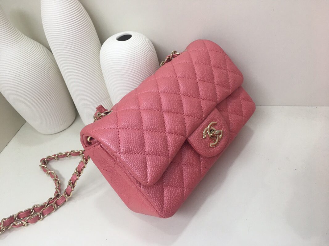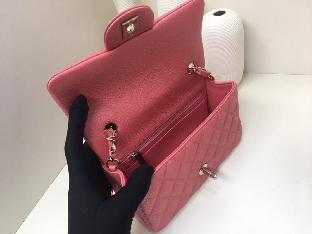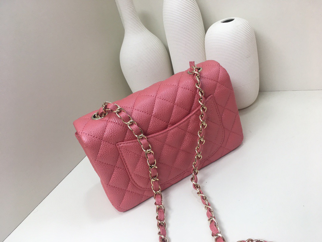 Chanel Classic Flap Mini size Calfskin caviar leather. Pearl ball pattern. All copper hardware. Pink Champagne. Gold Buckle 20cm