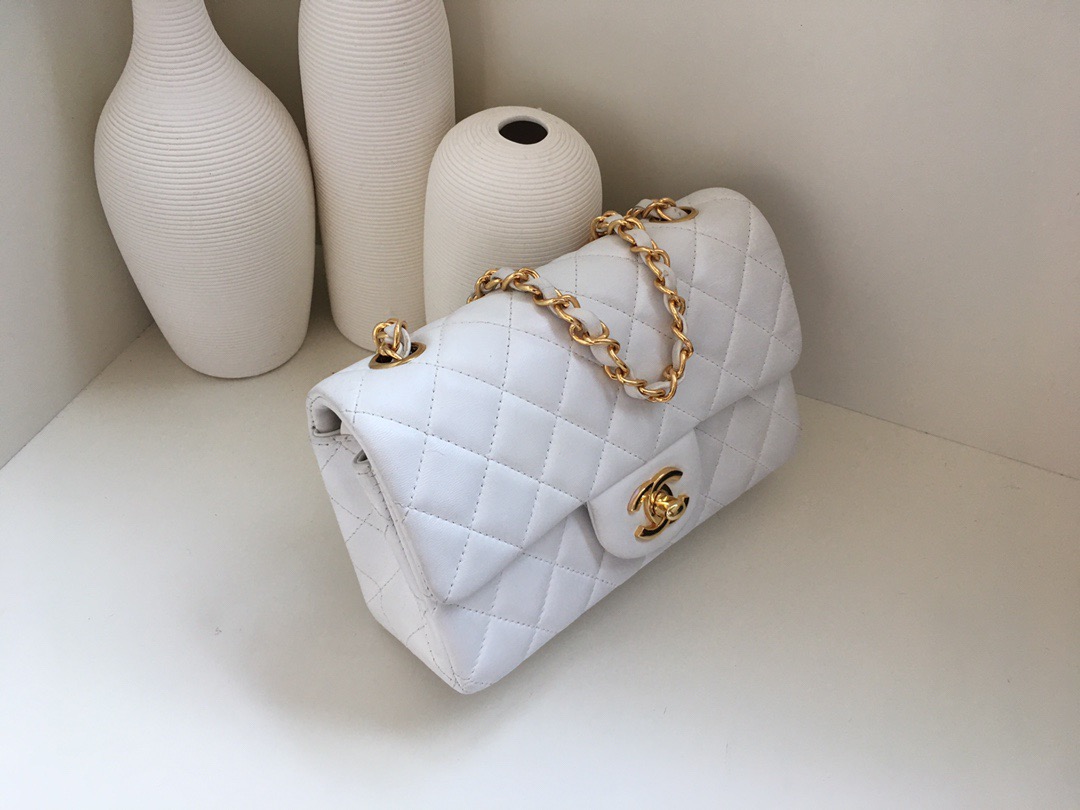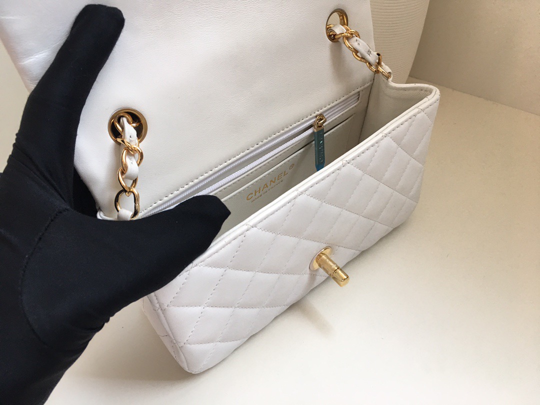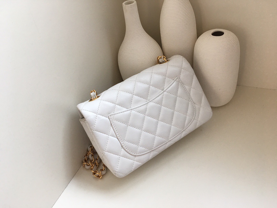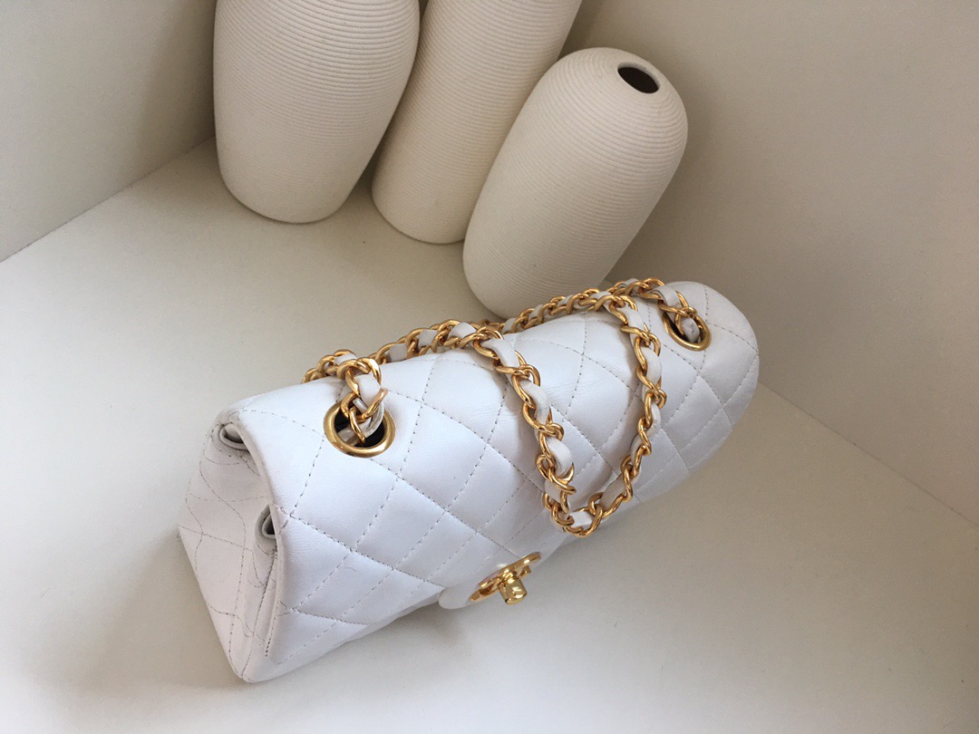 Chanel Classic Flap Lambskin. All copper hardware. New mini. Pure White. Gold Buckle 20cm
