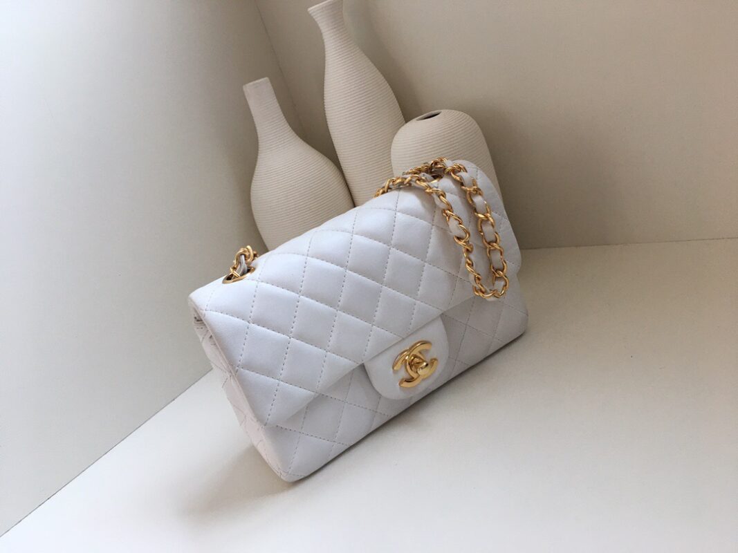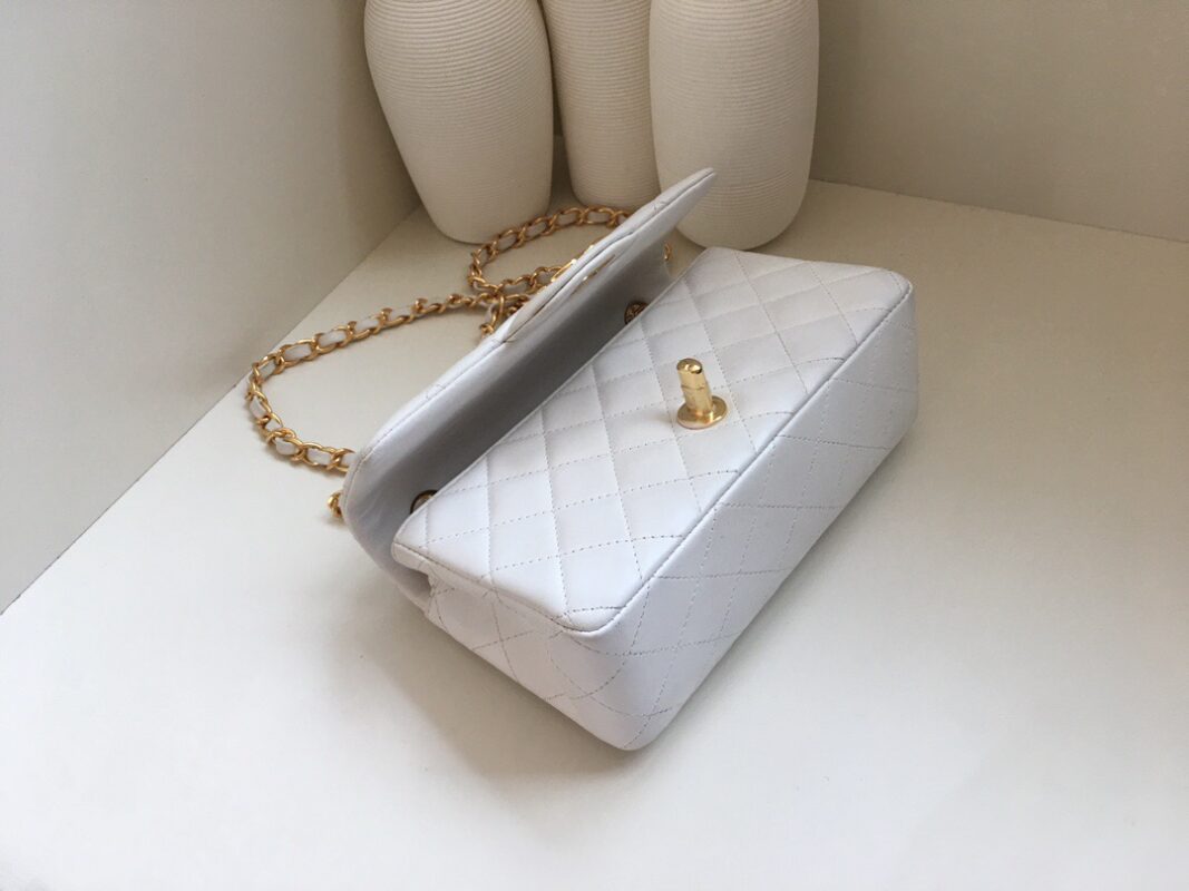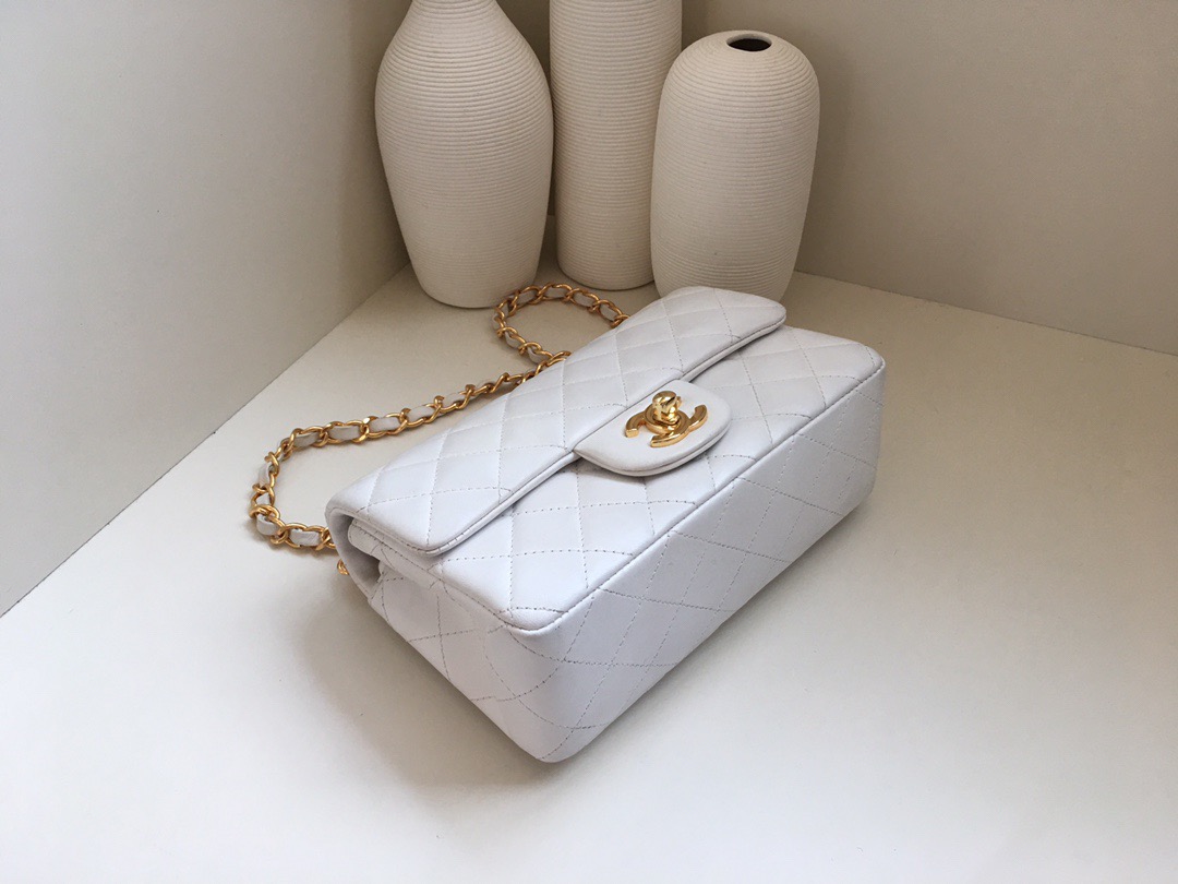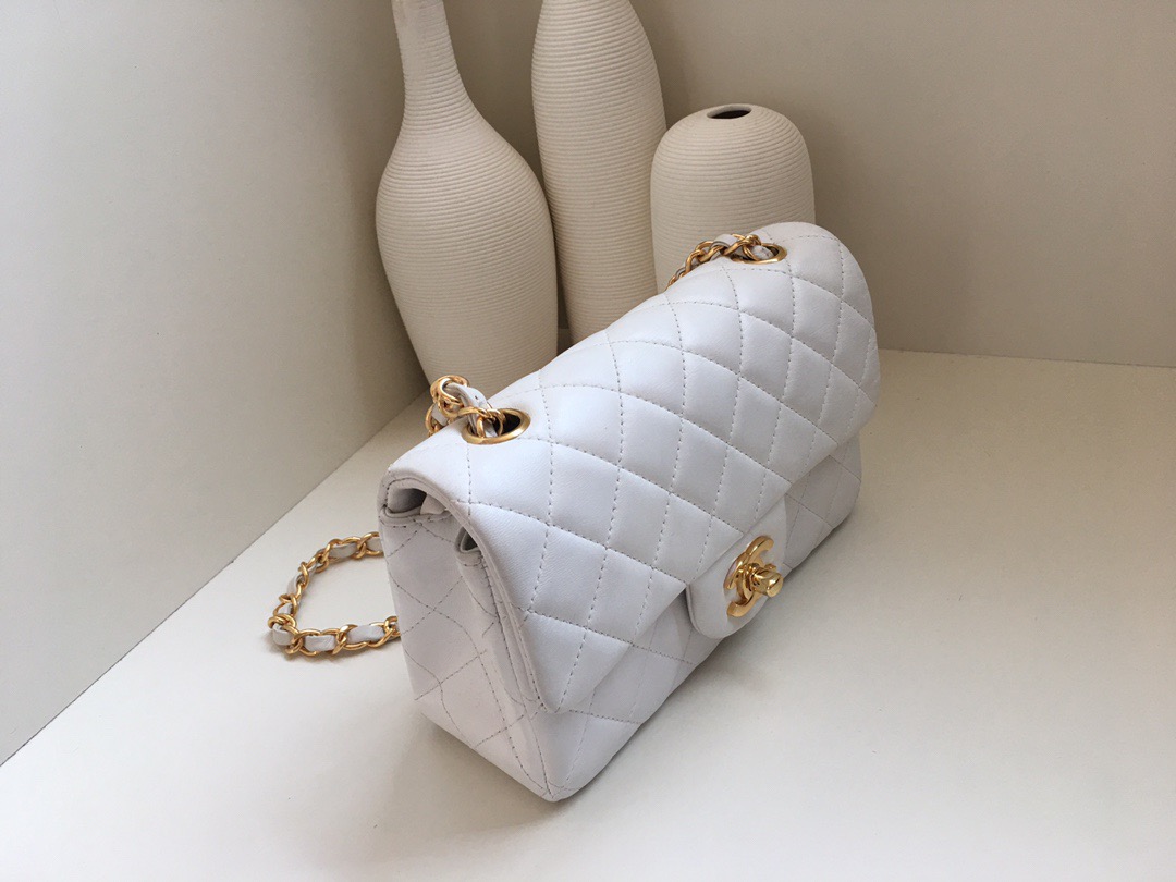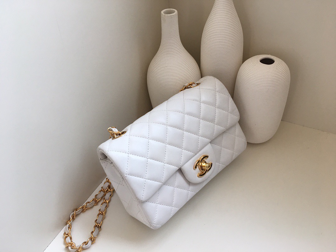 Chanel Classic Flap Lambskin. All copper hardware. New mini. Pure White. Gold Buckle 20cm