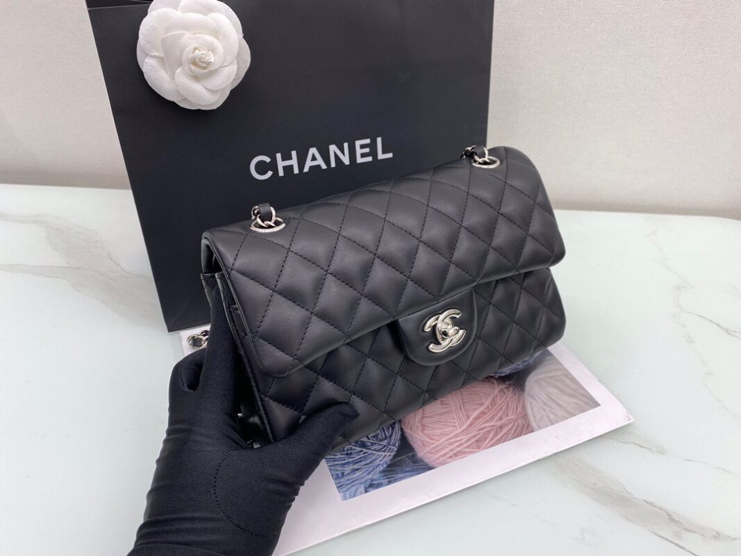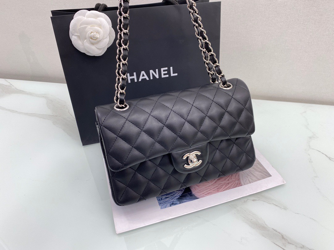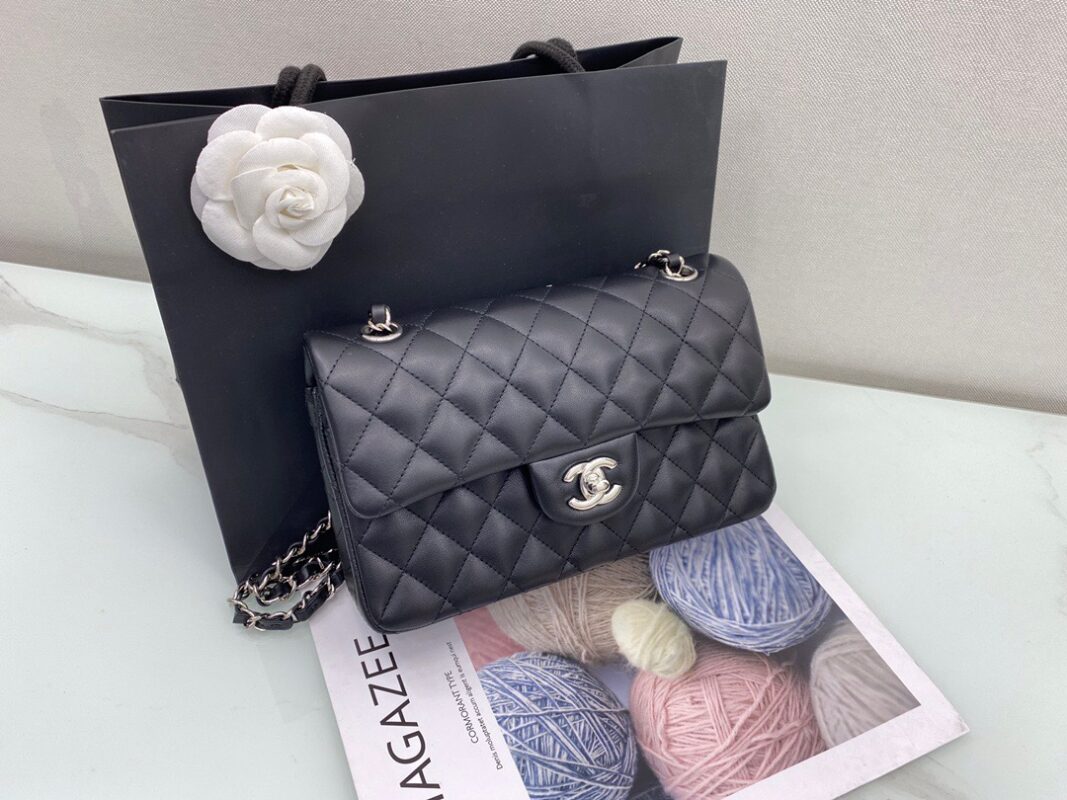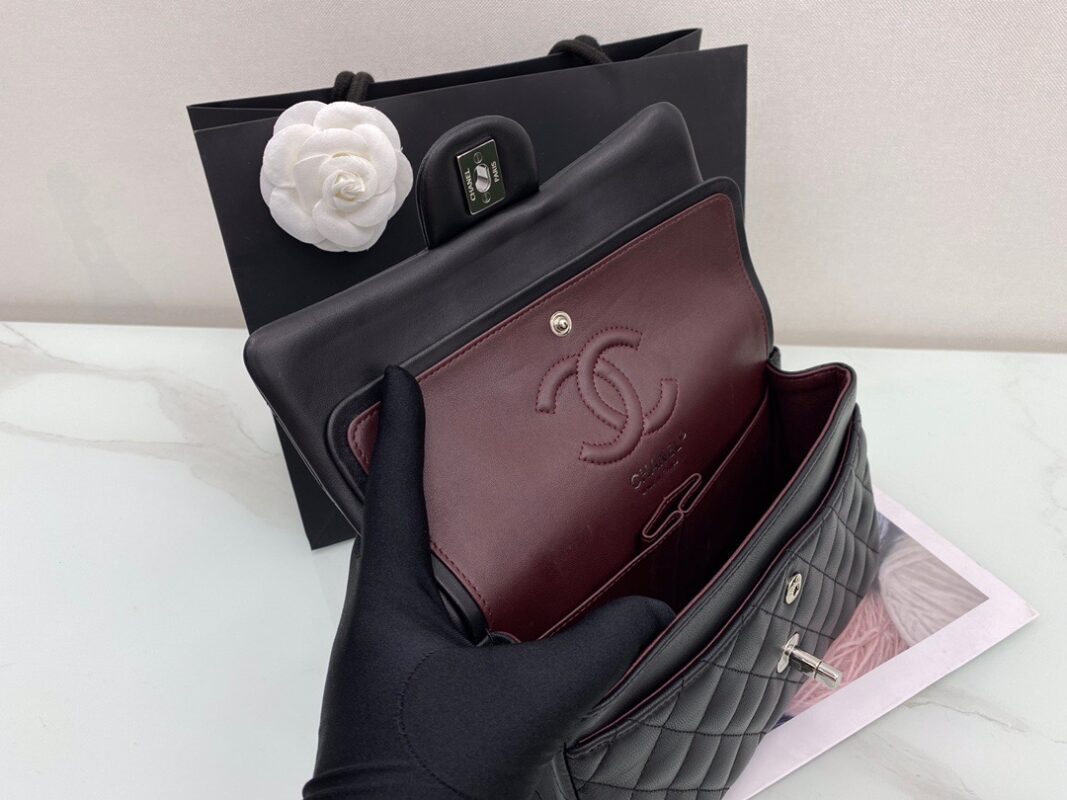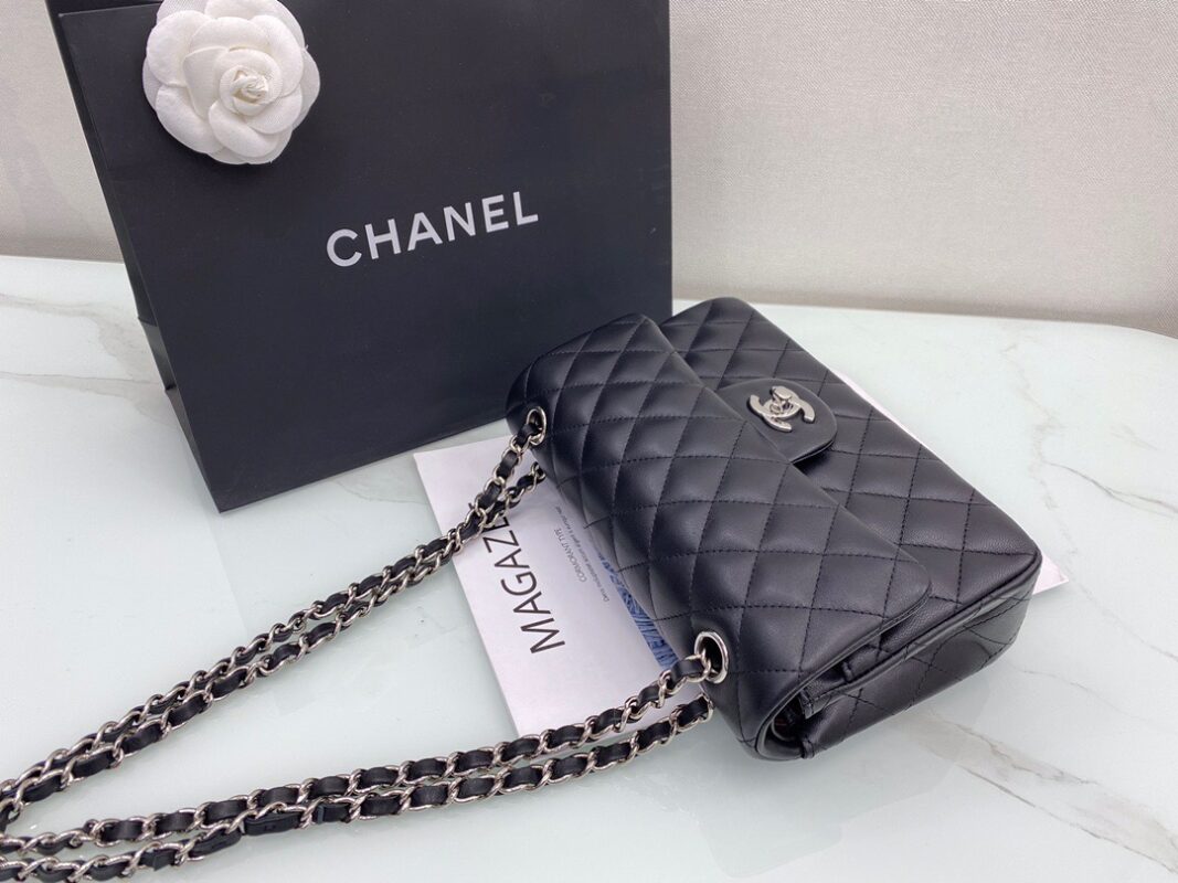 Chanel Classic Flap Imported lambskin. All copper hardware. Black. Silver Buckle 23cm