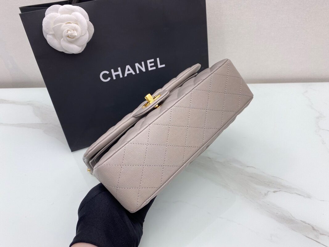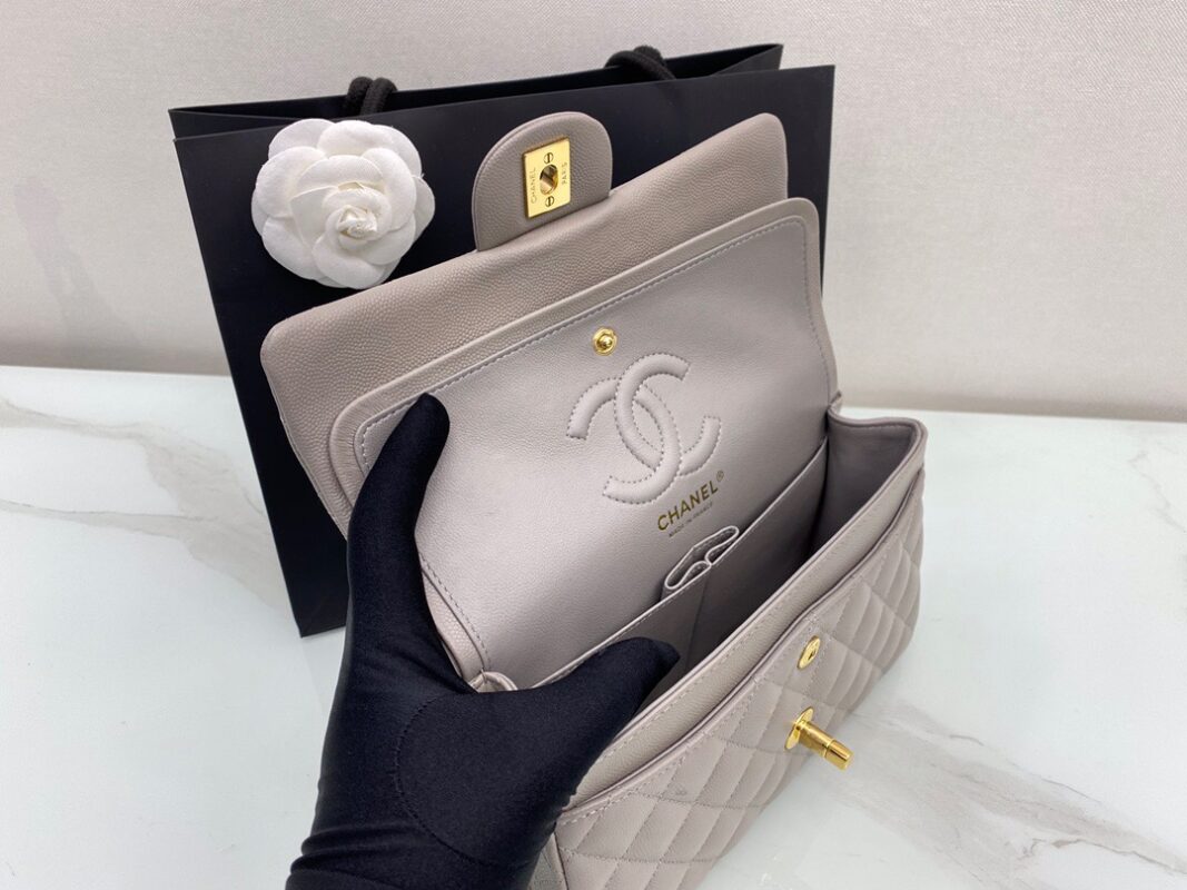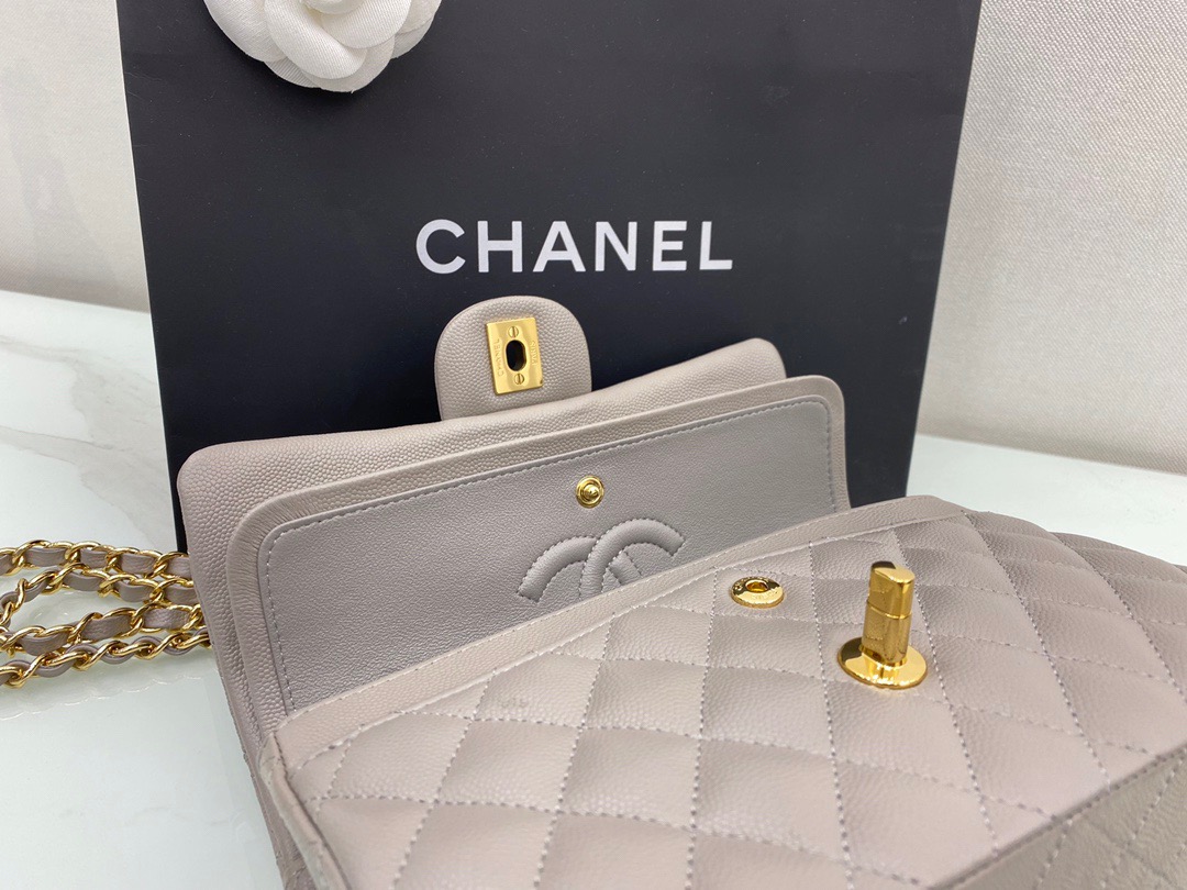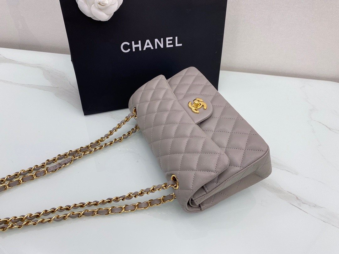 Chanel Classic FlapCaflskin caviar leather. Full copper hardware. Gray. Gold Buckle 23cm